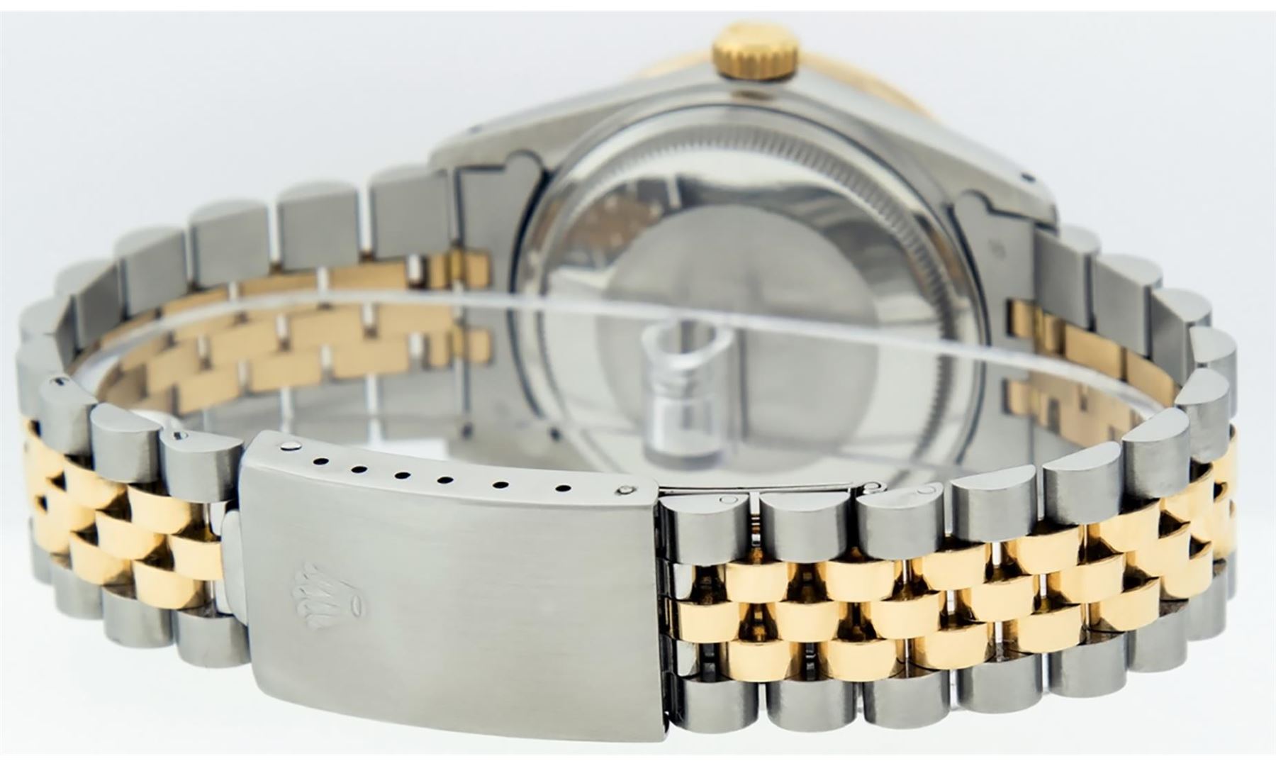 One Mens Pre Owned Two Tone Yellow Gold And Stainless Steel Rolex Datejust Polished Bright with Satin Finish, Serviced And Electronically Tested, Rolex Stainless Steel Case: 36mm, Yellow Gold Crown, Custom Bezel: New 18K Yellow Gold Pyramid Diamond Bezel, Diamond Count: 24 Diamonds. Custom Crystal: New Sapphire With Magnified Date. Custom Hands: New Luminescent Hands. Rolex Movement: Automatic Winding Movement 3035. Custom Dial: Custom Champagne Dial With Added Diamonds, Diamond Count: 8 Diamonds + 2 Baguette Diamonds In Dial. Date Window: 3 O'Clock Position Date Display, Quickset, Model: Datejust. Condition: G-6 Extra Fine. Rolex Bracelet: Yellow Gold And Stainless Steel Jubilee Band. Bright Polish And Satin Finish. 7.0 Inch Length, Adjustable. Standard Clasp, With Rolex Logo. This Watch Has Been Serviced And Polished It Is Free Of All Scratches And Dents.