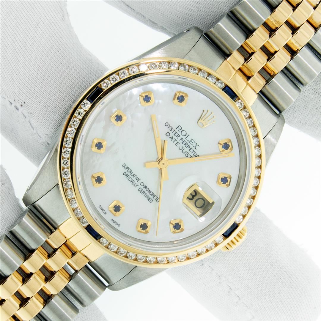 One Mens Yellow Gold Two Tone Rolex Datejust Polished, Serviced & Electronically Tested, Yellow Gold & Stainless Steel Case: 36mm, Yellow Gold Crown, Custom Bezel: 18K Yellow Gold Sapphire Channel Set Diamond Bezel, Diamond Count: 52 Diamonds + 4 Sapphire