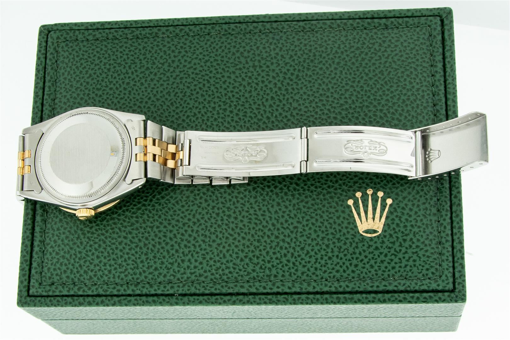 One Mens Yellow Gold Two Tone Rolex Datejust Polished, Serviced & Electronically Tested, Yellow Gold & Stainless Steel Case: 36mm, Yellow Gold Crown, Custom Bezel: 18K Yellow Gold Sapphire Channel Set Diamond Bezel, Diamond Count: 52 Diamonds + 4 Sapphire