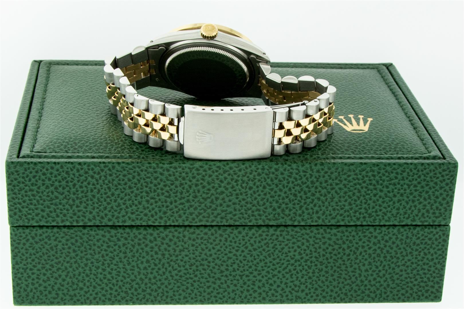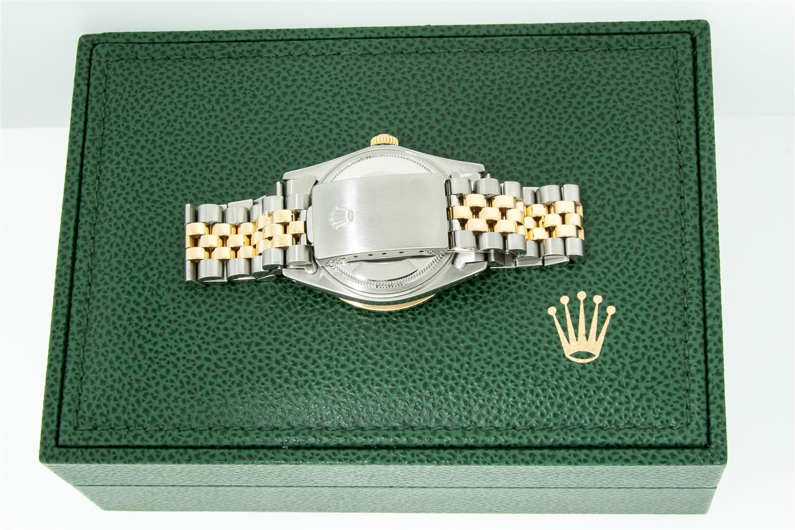 One Mens Yellow Gold Two Tone Rolex Datejust Polished, Serviced & Electronically Tested, Yellow Gold & Stainless Steel Case: 36mm, Yellow Gold Crown, Custom Bezel: 18K Yellow Gold Sapphire Channel Set Diamond Bezel, Diamond Count: 52 Diamonds + 4 Sapphires, Total Weight 1.30 Carat, Clarity: SI-VS, Color: G to H. Custom Crystal: New Synthetic Sapphire Cyclops Lens. Custom Hands: New Hands. Movement: Automatic Winding Movement. Custom Dial: Mother Of Pearl Dial With Sapphire Hour Markers, Stone Count: 10 Sapphires in Dial. Date Window: 3 O'Clock Position Date Display, Quickset, Model: Condition: G-6 Extra Fine. Bracelet: Two Tone Yellow Gold & Stainless Steel Jubilee. Bright Polish. 7.0 Inch Length, Adjustable. Standard Clasp, With Rolex Logo. This Watch Has Been Serviced Time Tested And Is In Excellent Condition It Is Free Of All Scratches And Dents. This Watch Comes With A Rolex Box
