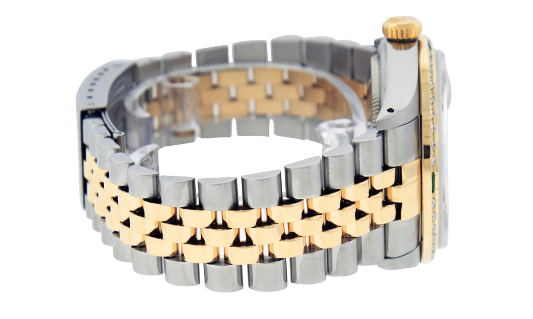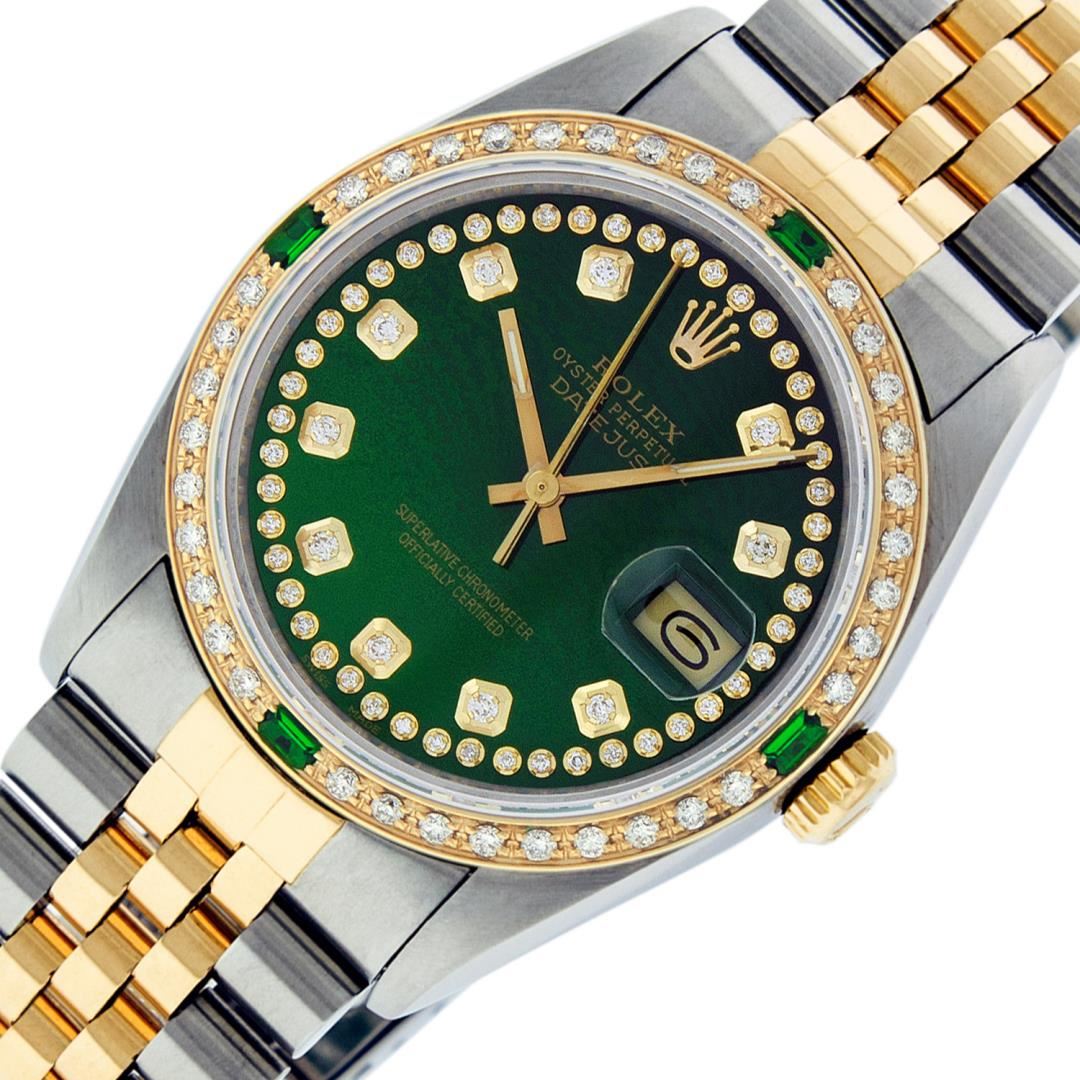 One Mens Pre Owned Two Tone Yellow Gold And Stainless Steel Rolex Datejust Polished, Serviced And Electronically Tested, Rolex Yellow Gold And Stainless Steel Case: 36mm, Rolex Yellow Gold Crown, Custom Bezel: New 18K Yellow Gold Emerald Beadset Diamond Bezel, Diamond Count: 36 Diamonds + 4 Emeralds. Custom Crystal: New Sapphire With Date Window. Custom Hands: New Luminescent Hands. Rolex Movement: Automatic Winding Movement 3035. Custom Dial: Custom Green Dial With Added Diamonds, Diamond Count: 58 Diamonds On Dial. Date Window: 3 O'Clock Position Date Display, Quickset, Model: Quickset Datejust. Condition: G-6 Extra Fine. Rolex Bracelet: Two Tone Yellow Gold And Stainless Steel Jubilee Band. Bright Polish. 7.0 Inch Length, Adjustable. Standard Clasp, With Rolex Logo. This Watch Has Been Serviced Time Tested And Is In Excellent Condition It Is Free Of All Scratches And Dents.
