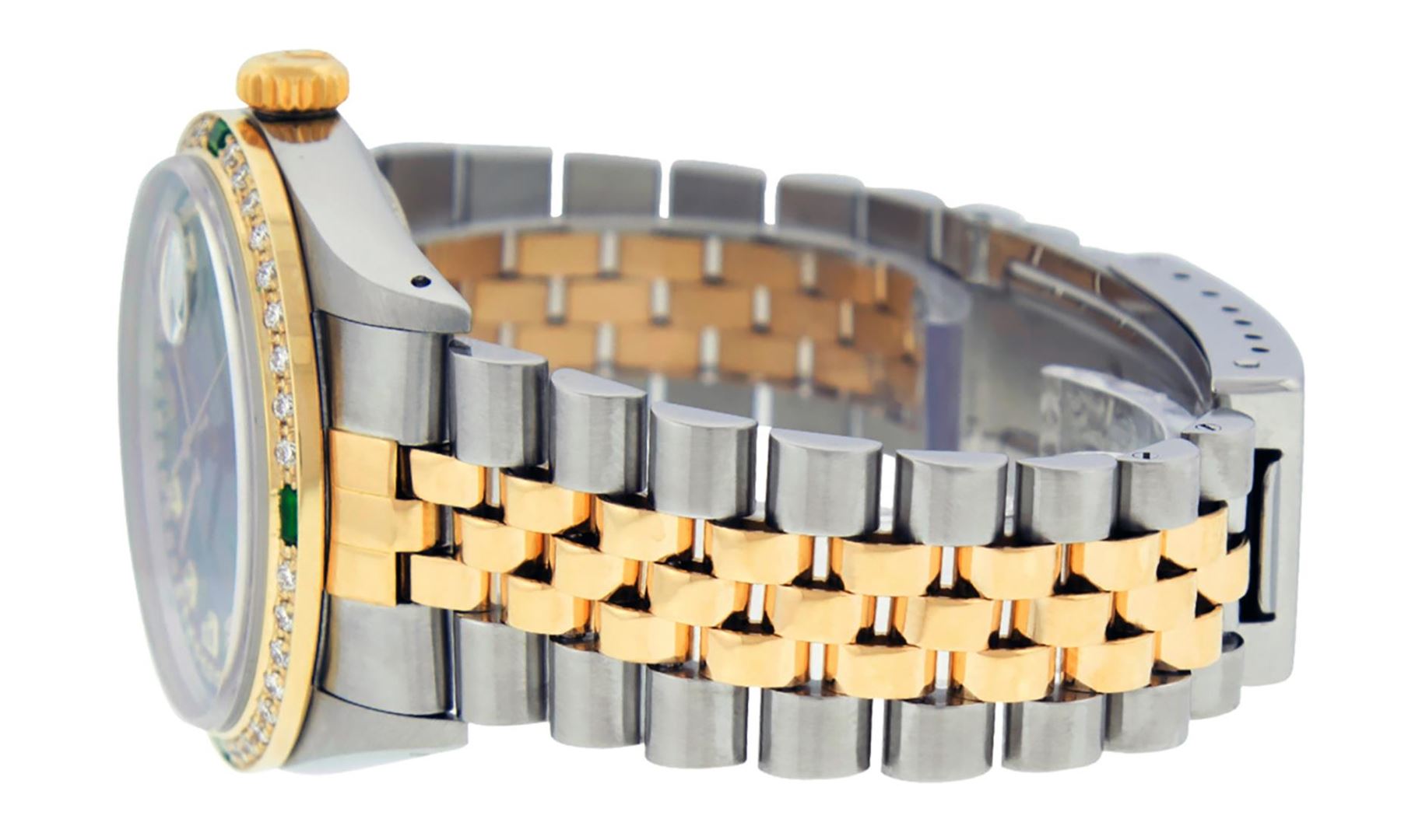 One Mens Pre Owned Two Tone Yellow Gold And Stainless Steel Rolex Datejust Polished, Serviced And Electronically Tested, Rolex Yellow Gold And Stainless Steel Case: 36mm, Rolex Yellow Gold Crown, Custom Bezel: New 18K Yellow Gold Emerald Beadset Diamond Bezel, Diamond Count: 36 Diamonds + 4 Emeralds. Custom Crystal: New Sapphire With Date Window. Custom Hands: New Luminescent Hands. Rolex Movement: Automatic Winding Movement 3035. Custom Dial: Custom Green Dial With Added Diamonds, Diamond Count: 58 Diamonds On Dial. Date Window: 3 O'Clock Position Date Display, Quickset, Model: Quickset Datejust. Condition: G-6 Extra Fine. Rolex Bracelet: Two Tone Yellow Gold And Stainless Steel Jubilee Band. Bright Polish. 7.0 Inch Length, Adjustable. Standard Clasp, With Rolex Logo. This Watch Has Been Serviced Time Tested And Is In Excellent Condition It Is Free Of All Scratches And Dents.