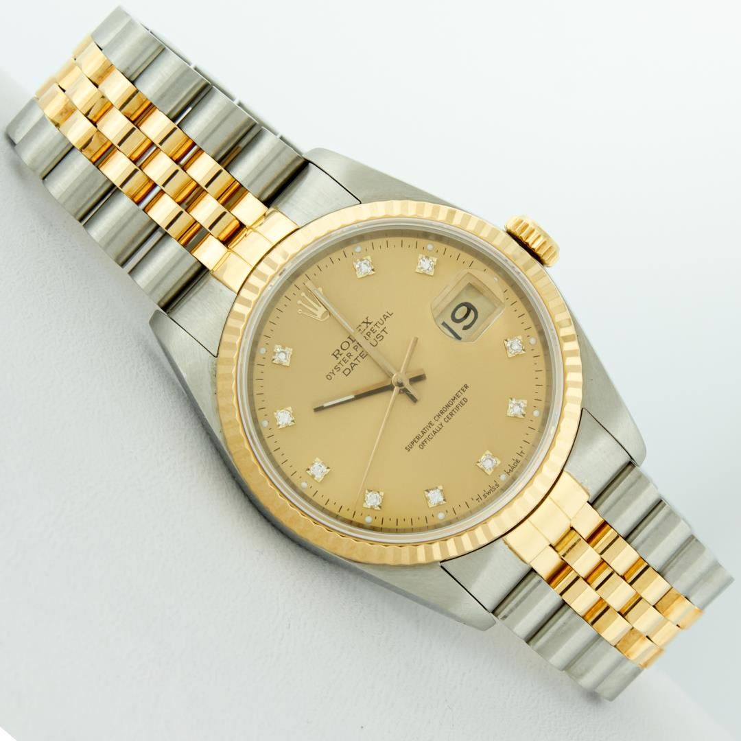 One Mens Quickset Pre Owned Two Tone Yellow Gold And Stainless Steel Rolex Datejust Polished, Serviced & Electronically Tested, Yellow Gold & Stainless Steel Case: 36mm, Yellow Gold Crown, Rolex Bezel: Rolex 14K Yellow Gold Fluted Bezel, Custom Crystal: New Acrylic Crystal Lens With Magnified Date Window. Hands: Luminescent Hands. Rolex Movement: Automatic Winding Movement 3035. Rolex Dial: Rolex Factory Champagne Diamond Dial With Dash Track & Lumi Dots, Diamond Count: 10 Diamonds In Dial, Clarity: VVS,Date Window: 3 O'Clock Position Date Display, Quickset, Model: Quickset Datejust. Condition: G-6 Extra Fine. Rolex Bracelet: Two Tone 14K Yellow Gold & Stainless Steel Jubilee Band. Bright Polish. 7.0 Inch Length, Adjustable. Standard Clasp, With Rolex Logo. This Watch Has Been Serviced Time Tested And Is In Excellent Condition It Is Free Of All Scratches And Dents.
