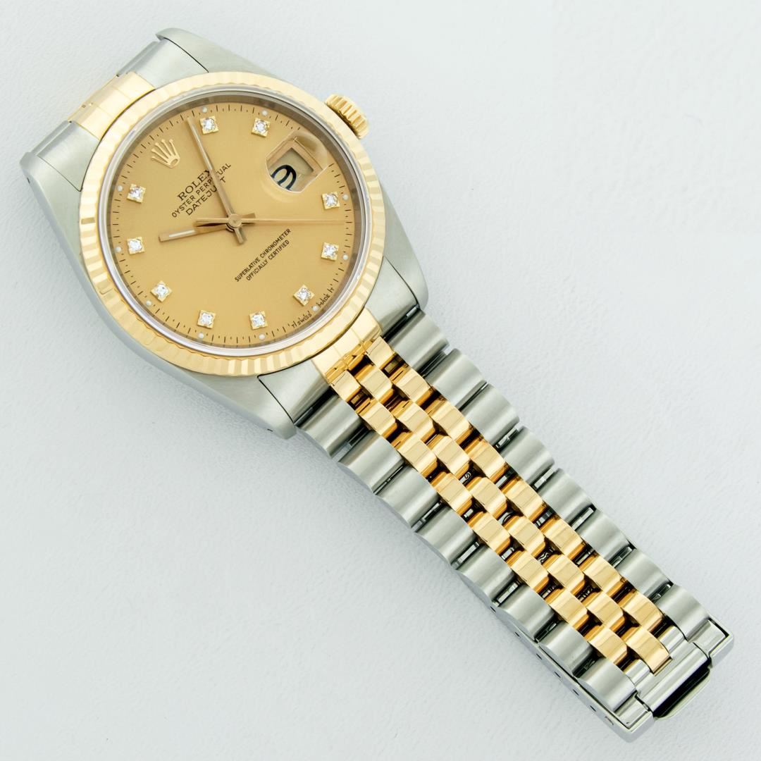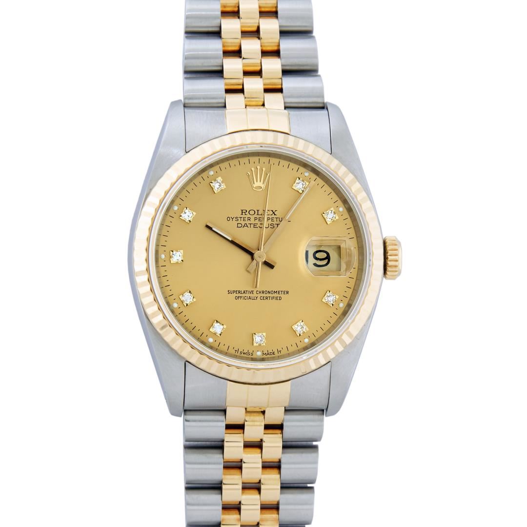One Mens Quickset Pre Owned Two Tone Yellow Gold And Stainless Steel Rolex Datejust Polished, Serviced & Electronically Tested, Yellow Gold & Stainless Steel Case: 36mm, Yellow Gold Crown, Rolex Bezel: Rolex 14K Yellow Gold Fluted Bezel, Custom Crystal: New Acrylic Crystal Lens With Magnified Date Window. Hands: Luminescent Hands. Rolex Movement: Automatic Winding Movement 3035. Rolex Dial: Rolex Factory Champagne Diamond Dial With Dash Track & Lumi Dots, Diamond Count: 10 Diamonds In Dial, Clarity: VVS,Date Window: 3 O'Clock Position Date Display, Quickset, Model: Quickset Datejust. Condition: G-6 Extra Fine. Rolex Bracelet: Two Tone 14K Yellow Gold & Stainless Steel Jubilee Band. Bright Polish. 7.0 Inch Length, Adjustable. Standard Clasp, With Rolex Logo. This Watch Has Been Serviced Time Tested And Is In Excellent Condition It Is Free Of All Scratches And Dents.