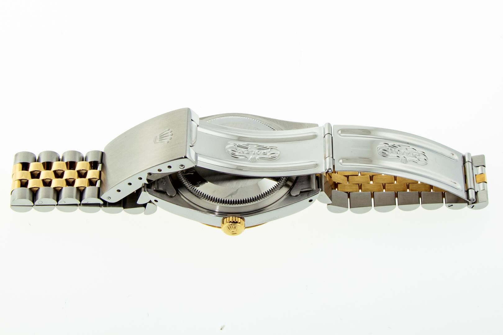 One Mens Pre Owned 18K Yellow Gold And Stainless Steel Rolex Datejust Polished, Serviced & Electronically Tested, Rolex Yellow Gold & Stainless Steel Case: 36mm, Rolex Yellow Gold Crown, Rolex Bezel: 18K Yellow Gold Fluted Bezel. Crystal: Sapphire With Magnified Date Window. Hands: Luminescent Hands. Rolex Movement: Automatic Winding Movement 3135. Rolex Dial: Champagne With VS Factory Diamond Hour Markers & Dash Track, Diamond Count: 10 Diamonds in Dial, VVS Clarity. Date Window: 3 O'Clock Position Date Display, Quickset, Model: Sapphire Datejust. Condition: G-6 Extra Fine. Rolex Bracelet: Two Tone 18K Yellow Gold & Stainless Steel Jubilee Band. Bright Polish. 7.0 Inch Length, Adjustable. Standard Clasp, With Rolex Logo. This Watch Has Been Serviced And Polished It Is Free Of All Scratches And Dents. This Watch Comes With A Rolex Box.