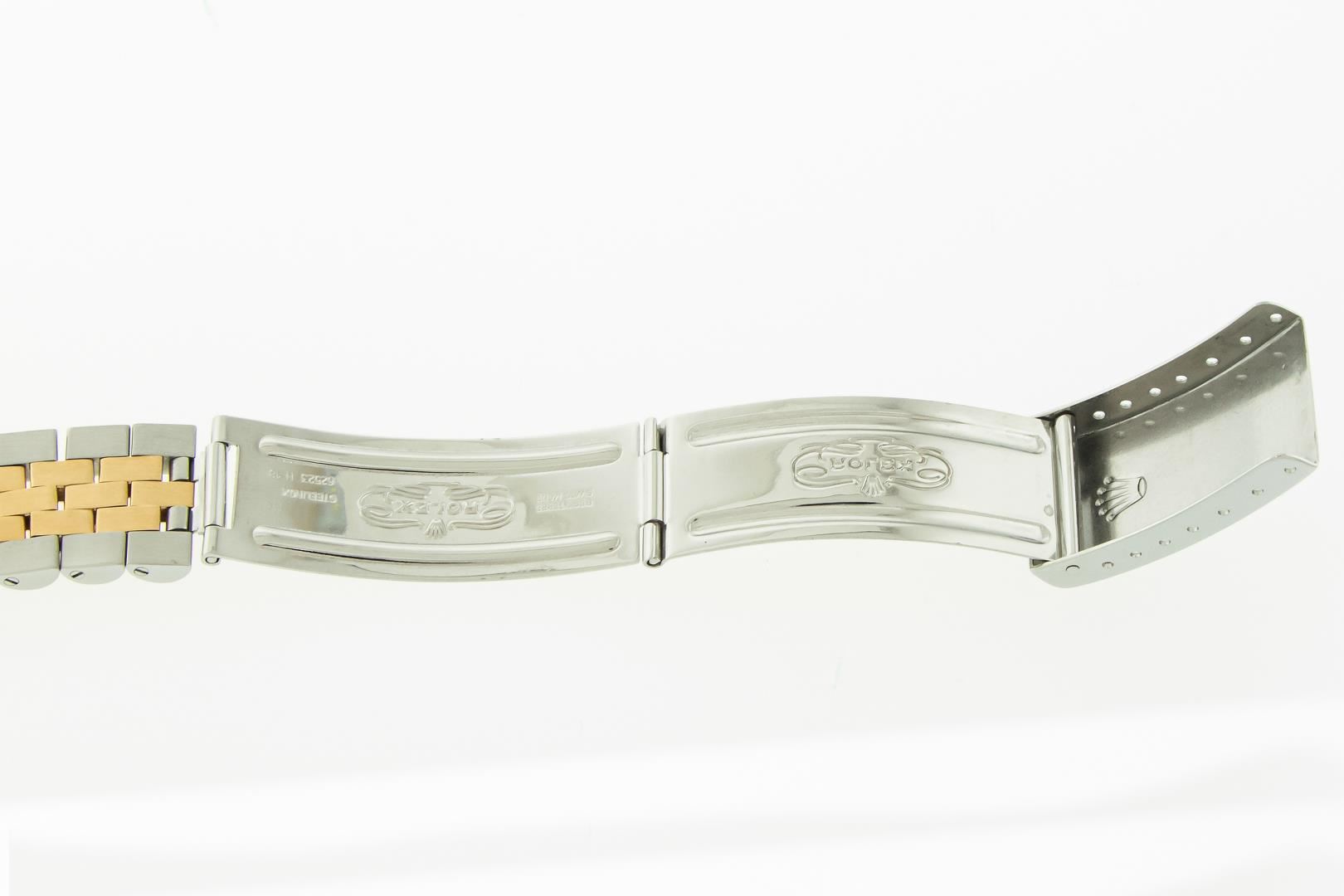 One Mens Pre Owned 18K Yellow Gold And Stainless Steel Rolex Datejust Polished, Serviced & Electronically Tested, Rolex Yellow Gold & Stainless Steel Case: 36mm, Rolex Yellow Gold Crown, Rolex Bezel: 18K Yellow Gold Fluted Bezel. Crystal: Sapphire With Magnified Date Window. Hands: Solid Hands. Rolex Movement: Automatic Winding Movement 3135. Rolex Dial: Champagne With VVS Factory Diamond Hour Markers & Dash Track, Diamond Count: 10 Diamonds in Dial, VVS Clarity. Date Window: 3 O'Clock Position Date Display, Quickset, Model: Sapphire Datejust. Condition: G-6 Extra Fine. Rolex Bracelet: Two Tone 18K Yellow Gold & Stainless Steel Jubilee Band. Bright Polish. 7.0 Inch Length, Adjustable. Standard Clasp, With Rolex Logo. This Watch Has Been Serviced And Polished It Is Free Of All Scratches And Dents.