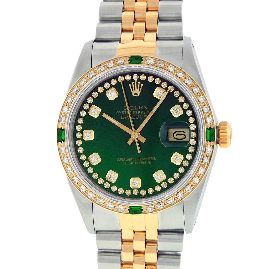 One Mens Rolex Datejust Polished Bright with Satin Finish, Serviced & Electronically Tested, 14K Yellow Gold And Stainless Steel Case:36mm, Stainless Steel Crown, Custom Bezel: 18K Yellow Gold Diamond & Emerald Beadset Bezel, Diamond Count: 36 Diamonds + 4 Emerald Baguettes, Total Weight 1.0 Carat, Clarity: SI-VS, Color: G to H. Custom Crystal: Synthetic Sapphire Cyclops Lens. Movement: Automatic Winding Movement Caliber 3035. Custom Dial: Green String Diamond Dial, Diamond Count: 58 Diamond in Dial, Dial Color: G To H In Color, Clarity: VS2-SI1. Date Window: 3 O'Clock Position Date Display, Quickset, Model: 16013 Condition: G-6 Extra Fine. Bracelet: 14K Yellow Gold And Stainless Steel Jubilee. Bright Polish & Satin Finish. 7.0 Inch Length, Adjustable. Standard Clasp, With Rolex Logo. This Watch Has Been Serviced and Polished And It Is Free Of All Dents And Scratches And Has Been Time Tested.