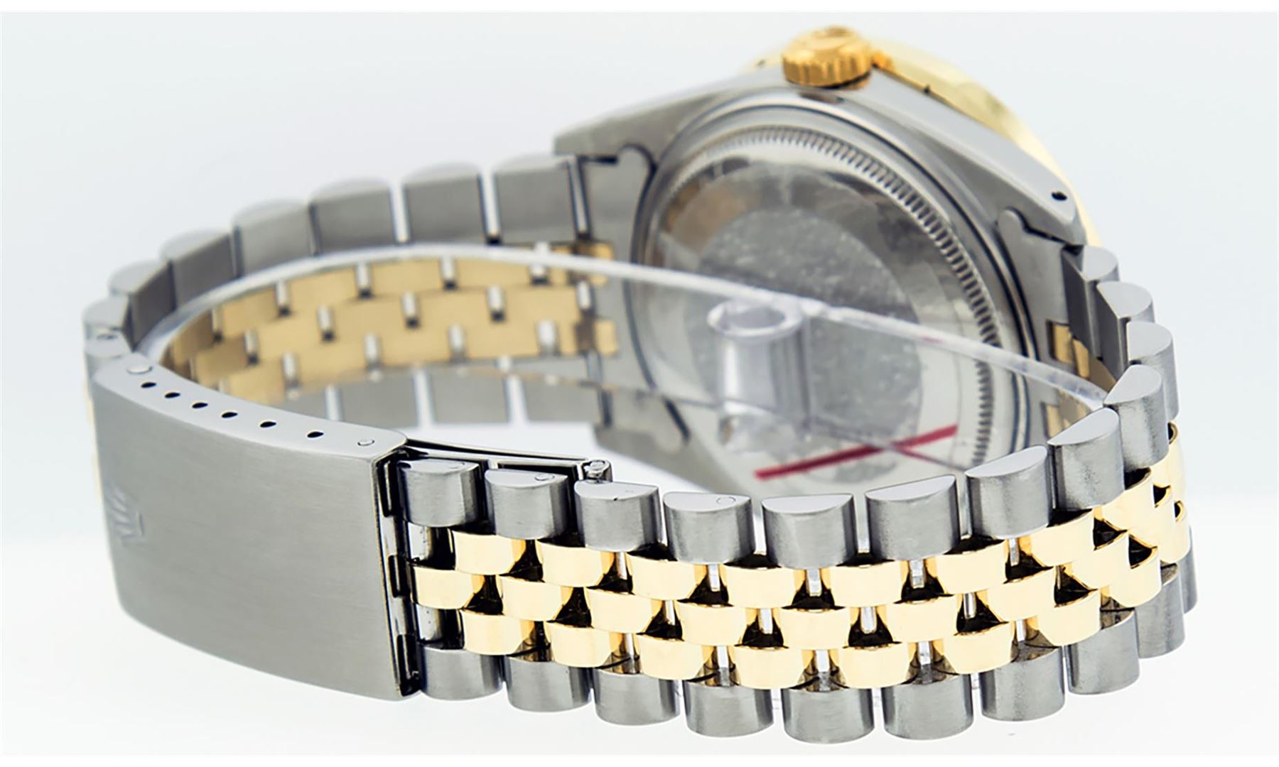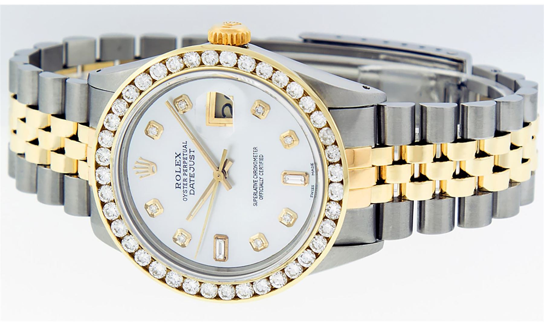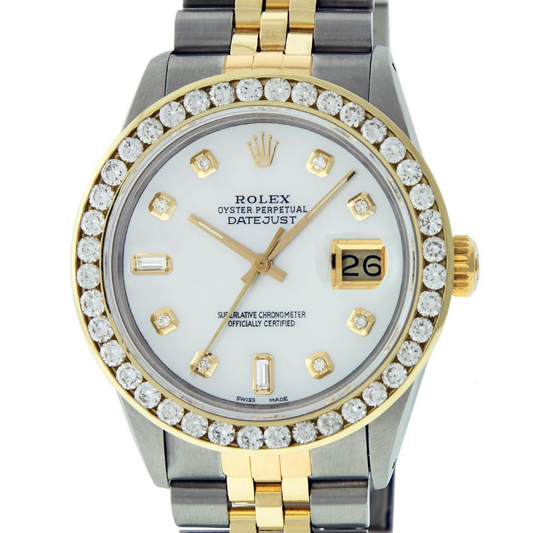 One Mens 14K Yellow Gold Rolex Datejust Polished Bright with Satin Finish, Serviced & Electronically Tested, Stainless Steel Case: 36mm, Yellow Gold Crown, Custom Bezel: New 18K Yellow Gold 3ct Channel Set Diamond Bezel, Diamond Count: 40 Diamonds, Total Weight 3.00 Carat, Clarity: SI-VS, Color: G to H. Custom Crystal: New Scratch Resistant Synthetic Sapphire Cyclops Lens. Custom Hands: New Luminecent Hands. Movement: Automatic Winding Movement Caliber 3035. Custom Dial: Mother Of Pearl Diamond Dial, Diamond Count: 8 Diamonds + 2 Baguette Diamonds In Dial, Color: G to H, Clarity: SI-VS. Date Window: 3 O'Clock Position Date Display, Quickset, Model: 16013 Datejust. Condition: G-6 Extra Fine. Bracelet: 14K Yellow Gold And Stainless Steel Jubilee Band. Bright Polish & Satin Finish. 7.0 Inch Length, Adjustable. Standard Clasp, With Rolex Logo. This Watch Has Been Serviced And Polished It Is Free Of All Scratches And Dents.