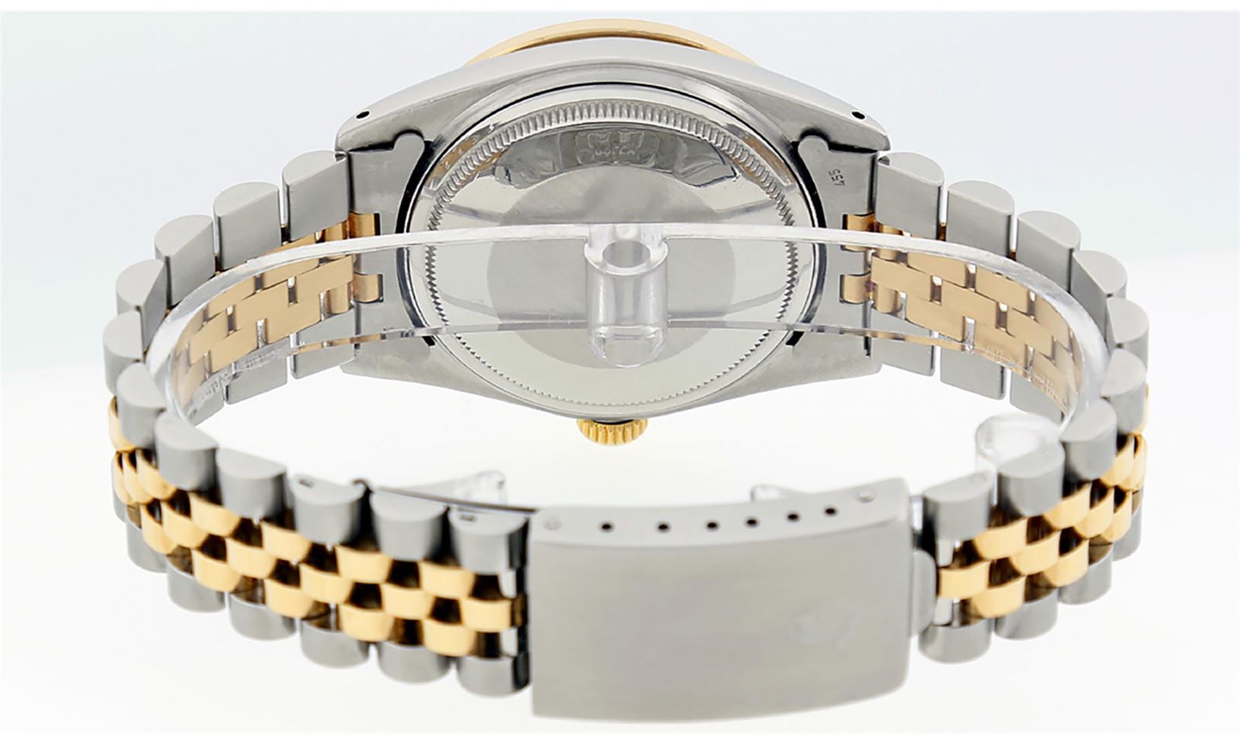One Mens Two Tone Rolex Datejust Polished, Serviced & Electronically Tested, Yellow Gold & Stainless Steel Case: 36mm, Yellow Gold Crown, Custom Bezel: 18K Yellow Gold Sapphire Channel Set Diamond Bezel, Diamond Count: 52 Diamonds + 4 Sapphires, Total Weight 1.30 Carat, Clarity: SI-VS, Color: G to H. Custom Crystal: New Synthetic Sapphire Cyclops Lens. Custom Hands: New Hands. Movement: Automatic Winding Movement. Custom Dial: Mother Of Pearl Dial With Sapphire Hour Markers, Stone Count: 10 Sapphires in Dial. Date Window: 3 O'Clock Position Date Display, Quickset, Model: Condition: G-6 Extra Fine. Bracelet: Two Tone Yellow Gold & Stainless Steel Jubilee. Bright Polish. 7.0 Inch Length, Adjustable. Standard Clasp, With Rolex Logo. This Watch Has Been Serviced Time Tested And Is In Excellent Condition It Is Free Of All Scratches And Dents.