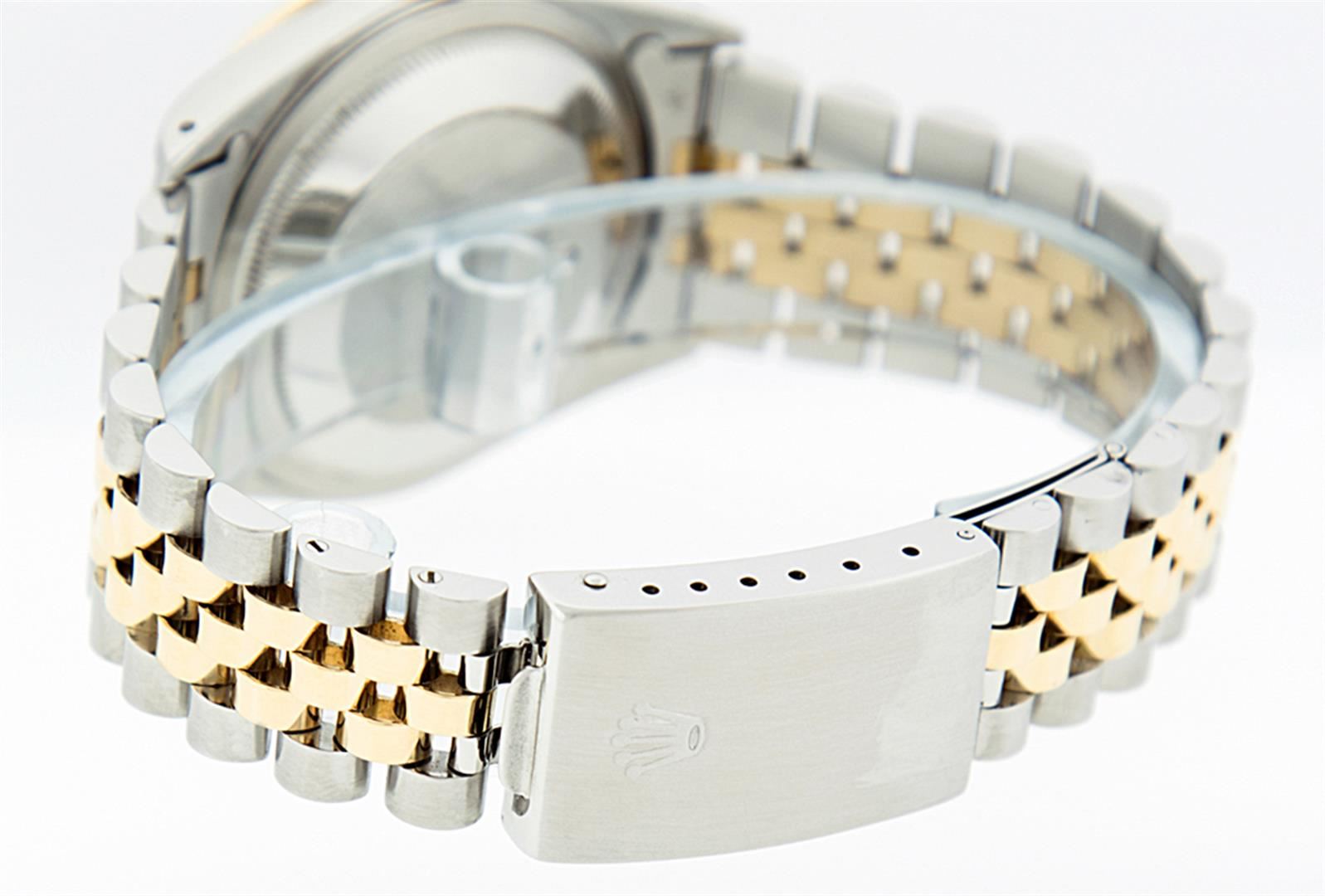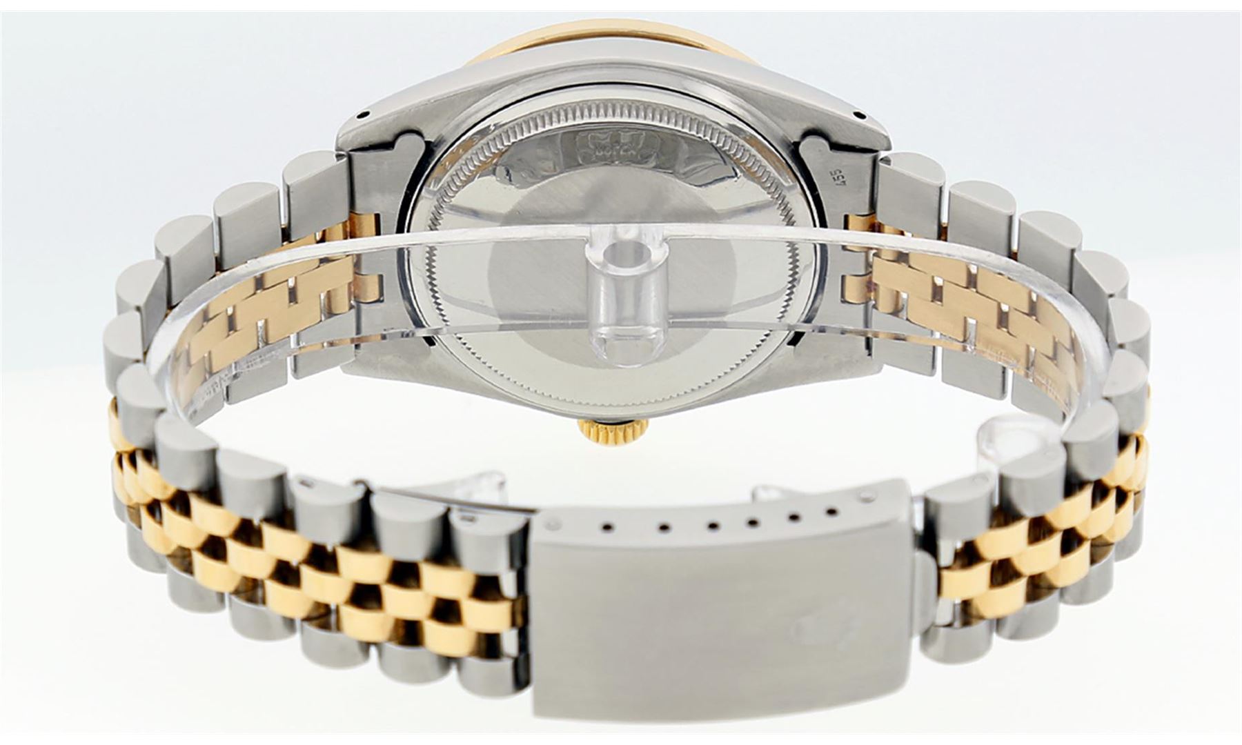One Mens Two Tone Rolex Datejust Polished, Serviced & Electronically Tested, 14K Yellow Gold & Stainless Steel Case:36mm, 14K Yellow Gold Crown, Custom Bezel: 18K Yellow Gold Sapphire Channel Set Diamond Bezel, Diamond Count: 52 Diamonds + 4 Sapphires, Total Weight 1.30 Carat, Clarity: SI-VS, Color: G to H. Custom Crystal: Synthetic Sapphire Cyclops Lens. Movement: Automatic Winding Movement Caliber 3035. Custom Dial: Mother Of Pearl Dial With Sapphire Hour Markers, Stone Count: 10 Sapphires in Dial. Date Window: 3 O'Clock Position Date Display, Quickset, Model: 16013 Condition: G-6 Extra Fine. Bracelet: Two Tone 14K Yellow Gold & Stainless Steel Jubilee. Bright Polish. 7.0 Inch Length, Adjustable. Standard Clasp, With Rolex Logo.