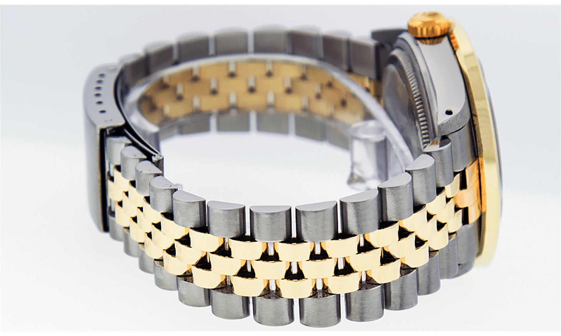 One Mens 14K Yellow Gold Rolex Datejust Polished Bright with Satin Finish, Serviced & Electronically Tested, Stainless Steel Case: 36mm, Yellow Gold Crown, Custom Bezel: New 18K Yellow Gold 3ct Channel Set Diamond Bezel, Diamond Count: 40 Diamonds In Bezel, Total Weight 3.00 Carat, Clarity: SI-VS, Color: G to H. Custom Crystal: New Scratch Resistent Synthetic Sapphire Cyclops Lens. Custom Hands: New Luminecent Hands. Movement: Automatic Winding Movement Caliber 3035. Custom Dial: Maroon Single Cut Diamond Dial, Diamond Count: 10 Diamonds In Dial, Color: G to H, Clarity: VS. Date Window: 3 O'Clock Position Date Display, Quickset, Model: Datejust. Condition: G-6 Extra Fine. Bracelet: 14K Yellow Gold And Stainless Steel Jubilee Band. Bright Polish & Satin Finish. 7.0 Inch Length, Adjustable. Standard Clasp, With Rolex Logo. This Watch Has Been Serviced And Polished It Is Free Of All Scratches And Dents.