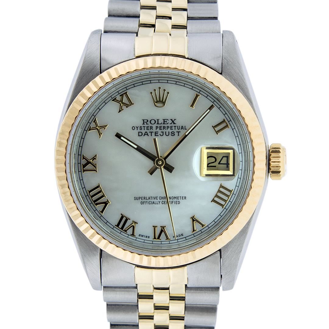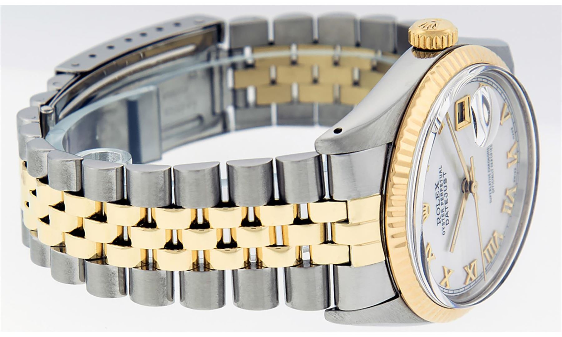 One Mens Pre Owned Yellow Gold Two Tone Rolex Datejust Polished, Serviced & Electronically Tested, Rolex Yellow Gold & Stainless Steel Case: 36mm, Rolex Yellow Gold Crown, Rolex Bezel: Yellow Gold Fluted Bezel. Custom Crystal: New Acrylic Cyclops Lens. Cu