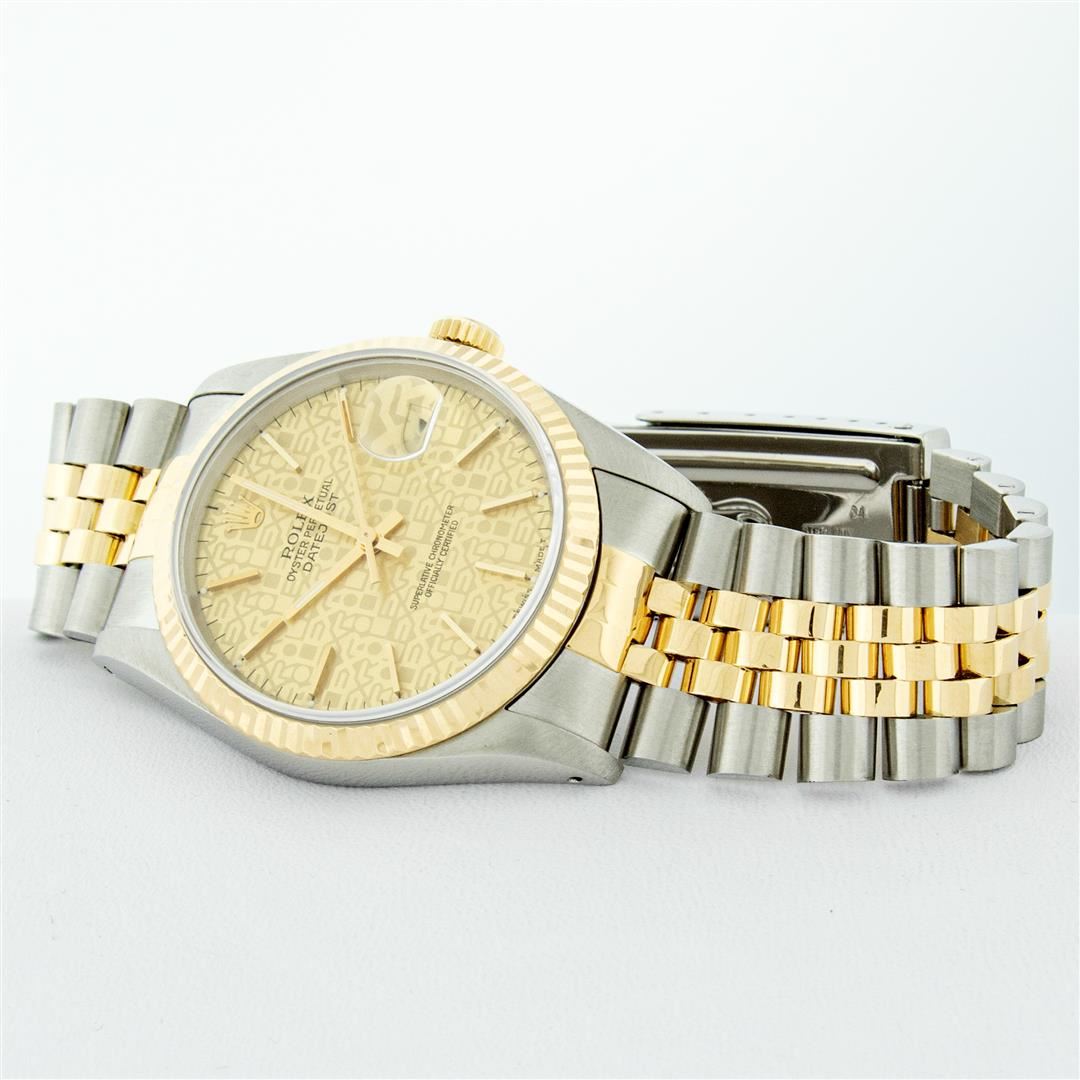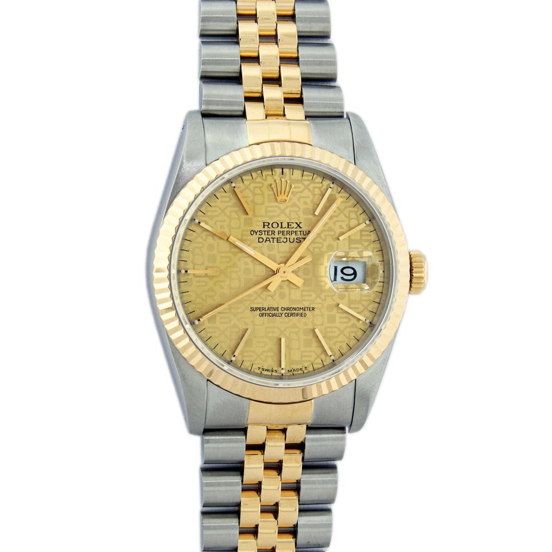 One Mens Yellow Gold Two Tone Rolex Datejust Polished, Serviced & Electronically Tested, Yellow Gold & Stainless Steel Case: 36mm,14K Yellow Gold Crown, Bezel: Yellow Gold Fluted Bezel. Custom Crystal: New Acrylic Cyclops Lens. Hands: Luminescent Hands. Movement: Automatic Winding Movement. Dial: Rare Champagne Jubilee Dial With Index Hour Markers and Small Track With Lumi Dots. Date Window: 3 O'Clock Position Date Display, Quickset, Model: Datejust. Condition: G-6 Extra Fine. Bracelet: Two Tone Yellow Gold & Stainless Steel Jubilee Band. Bright Polish. 7.0 Inch Length, Adjustable. Standard Clasp, With Rolex Logo. This Watch Has Been Serviced Time Tested And Is In Excellent Condition It Is Free Of All Scratches And Dents.