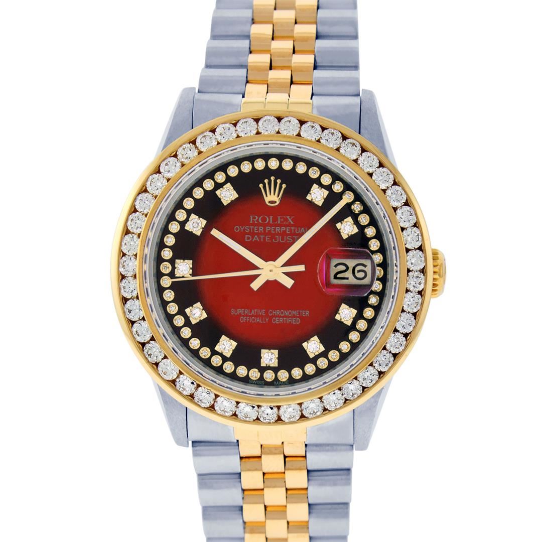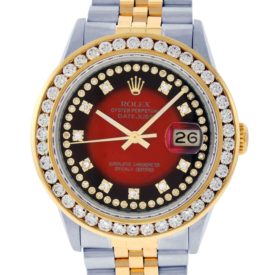 One Mens 14K Yellow Gold Rolex Datejust Polished Bright with Satin Finish, Serviced & Electronically Tested, Stainless Steel Case: 36mm, Yellow Gold Crown, Custom Bezel: New 18K Yellow Gold 3ct Channel Set Diamond Bezel, Diamond Count: 40 Diamonds, Total Weight 3.00 Carat, Clarity: SI-VS, Color: G to H. Custom Crystal: New Scratch Resistent Synthetic Sapphire Cyclops Lens. Custom Hands: New Luminecent Hands. Movement: Automatic Winding Movement Caliber 3035. Custom Dial: Red Vignette String Diamond Dial With Single Cut Diamonds, Diamond Count: 58 Diamonds In Dial, Color: G to H, Clarity: VS. Date Window: 3 O'Clock Position Date Display, Quickset, Model: 16013 Datejust. Condition: G-6 Extra Fine. Bracelet: 14K Yellow Gold And Stainless Steel Jubilee Band. Bright Polish & Satin Finish. 7.0 Inch Length, Adjustable. Standard Clasp, With Rolex Logo. This Watch Has Been Serviced And Polished It Is Free Of All Scratches And Dents.
