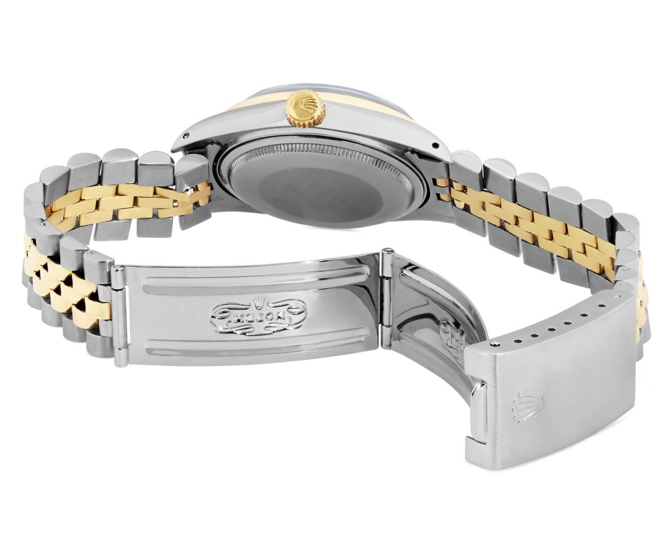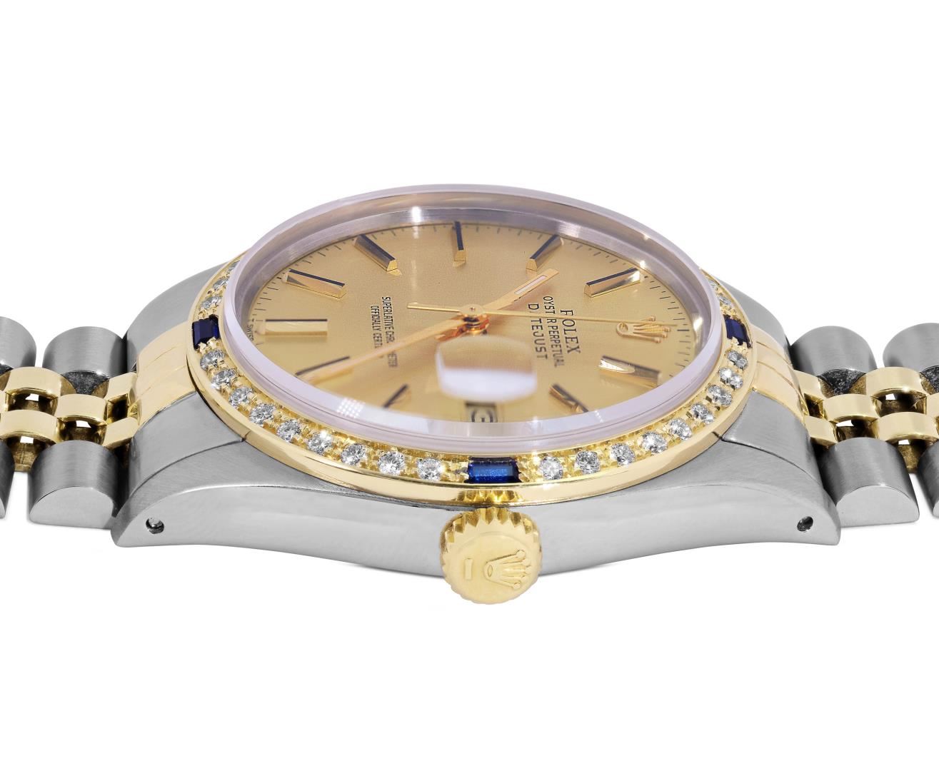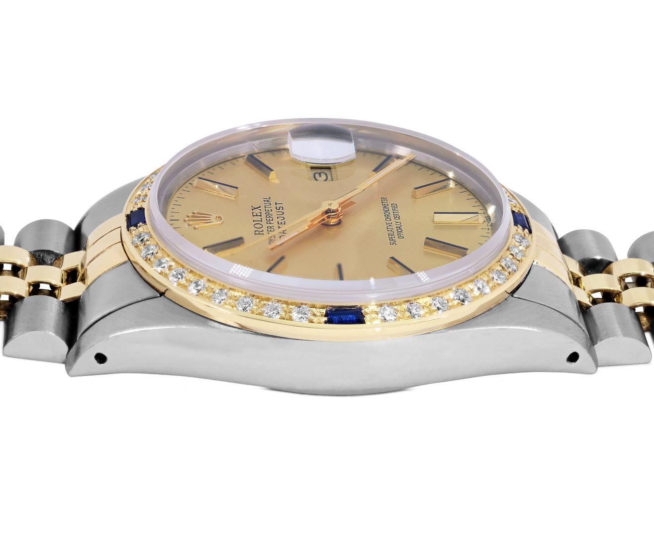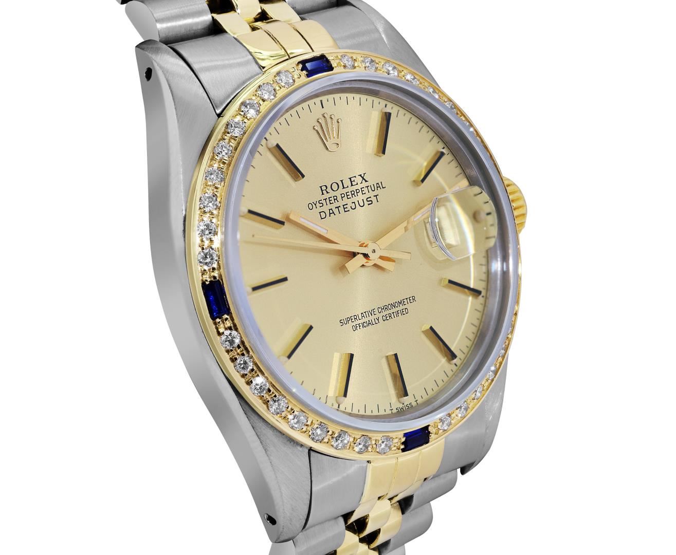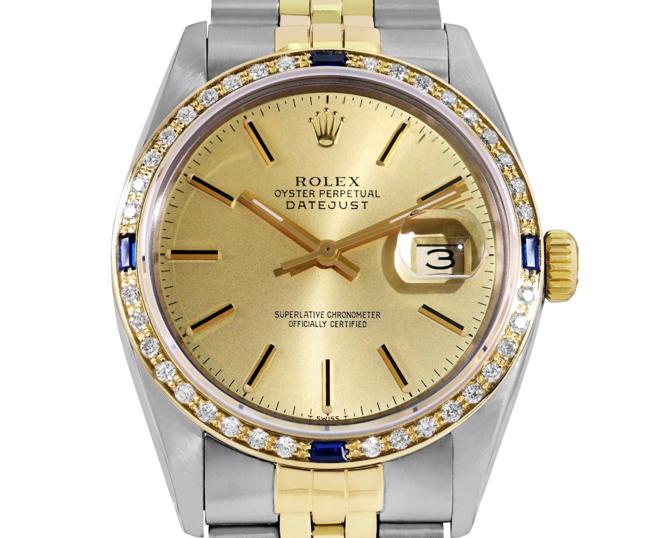 One Mens Pre Owned Two Tone Yellow Gold And Stainless Steel Rolex Datejust Polished, Serviced And Electronically Tested, Yellow Gold And Stainless Steel Case: 36mm, Rolex Yellow Gold Crown, Custom Bezel: New 18K Yellow Gold Sapphire Beadset Diamond Bezel, Diamond Count: 36 Diamonds + 4 Sapphires. Custom Crystal: New Sapphire With Magnified Date Window. Custom Hands: New Hands. Rolex Movement: Automatic Winding Movement 3035. Rolex Factory Dial: Champagne Index With Dash Track And Lumi Dots. Date Window: 3 O'Clock Position Date Display, Quickset, Model: Quickset Datejust. Condition: G-6 Extra Fine. Rolex Bracelet: Two Tone Yellow Gold And Stainless Steel Jubilee Band. Bright Polish. 7.0 Inch Length, Adjustable. Standard Clasp, With Rolex Logo. This Watch Has Been Serviced Time Tested And Is In Excellent Condition It Is Free Of All Scratches And Dents. This Watch Comes With A Rolex Box.