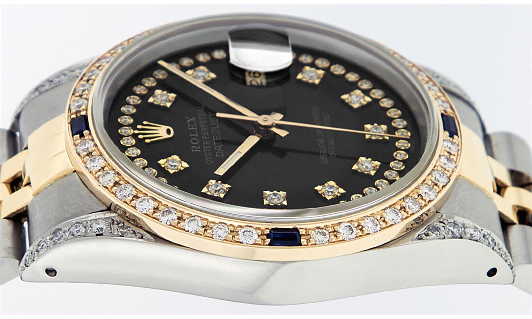 One Mens Pre Owned Two Tone Yellow Gold And Stainless Steel Rolex Datejust Polished Bright with Satin Finish, Serviced And Electronically Tested, Rolex Stainless Steel Case: 36mm, Custom Diamond Lugs: 28 Added Diamonds On Lugs. Rolex Yellow Gold Crown, Custom Bezel: New 18K Yellow Gold Beadset Diamond + Sapphire Bezel, Diamond + Stone Count: 36 Diamonds + 4 Sapphires. Custom Crystal: New Sapphire With Magnified Date Window. Custom Hands: New Luminescent Hands. Rolex Movement: Automatic Winding Movement 3035. Custom Dial: Custom Black Dial With Added Diamonds, Stone Count: 58 Diamonds In Dial. Date Window: 3 O'Clock Position Date Display, Quickset, Model: Datejust. Condition: G-6 Extra Fine. Rolex Bracelet: Yellow Gold And Stainless Steel Jubilee Band. Bright Polish And Satin Finish. 7.0 Inch Length, Adjustable. Standard Clasp, With Rolex Logo. This Watch Has Been Serviced And Polished It Is Free Of All Scratches And Dents.