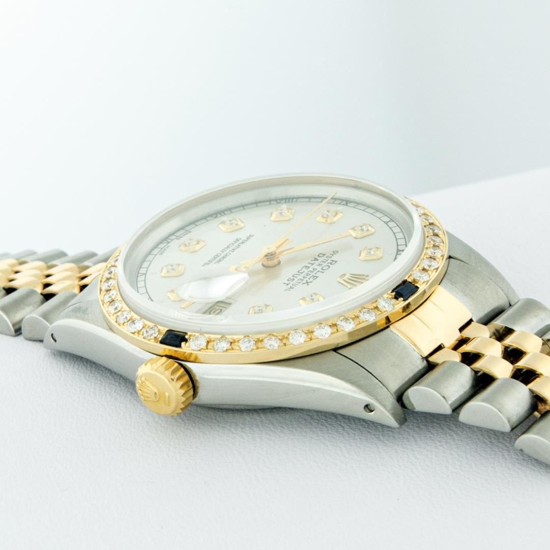 One Mens Pre Owned Two Tone Yellow Gold And Stainless Steel Rolex Datejust Polished, Serviced And Electronically Tested, Rolex Yellow Gold And Stainless Steel Case: 36mm, Yellow Gold Crown, Custom Bezel: New 18K Yellow Gold Sapphire Beadset Diamond Bezel, Diamond Count: 36 Diamonds + 4 Sapphires. Custom Crystal: New Sapphire With Magnified Date. Custom Hands: New Luminescent Hands. Rolex Movement: Automatic Winding Movement 3035. Custom Dial: Custom Silver Dial With Added Diamonds, Diamond Count: 10 Diamonds On Dial. Date Window: 3 O'Clock Position Date Display, Quickset, Model: Datejust. Condition: G-6 Extra Fine. Rolex Bracelet: Two Tone Yellow Gold And Stainless Steel Jubilee Band. Bright Polish. 7.0 Inch Length, Adjustable. Standard Clasp, With Rolex Logo. This Watch Has Been Serviced Time Tested And Is In Excellent Condition It Is Free Of All Scratches And Dents.