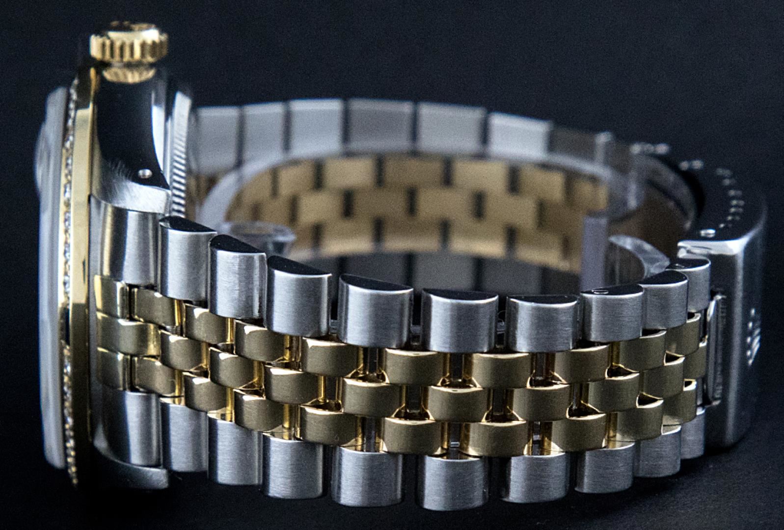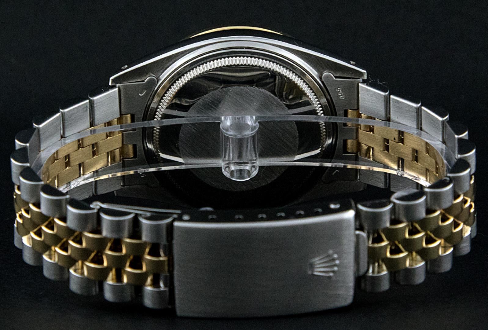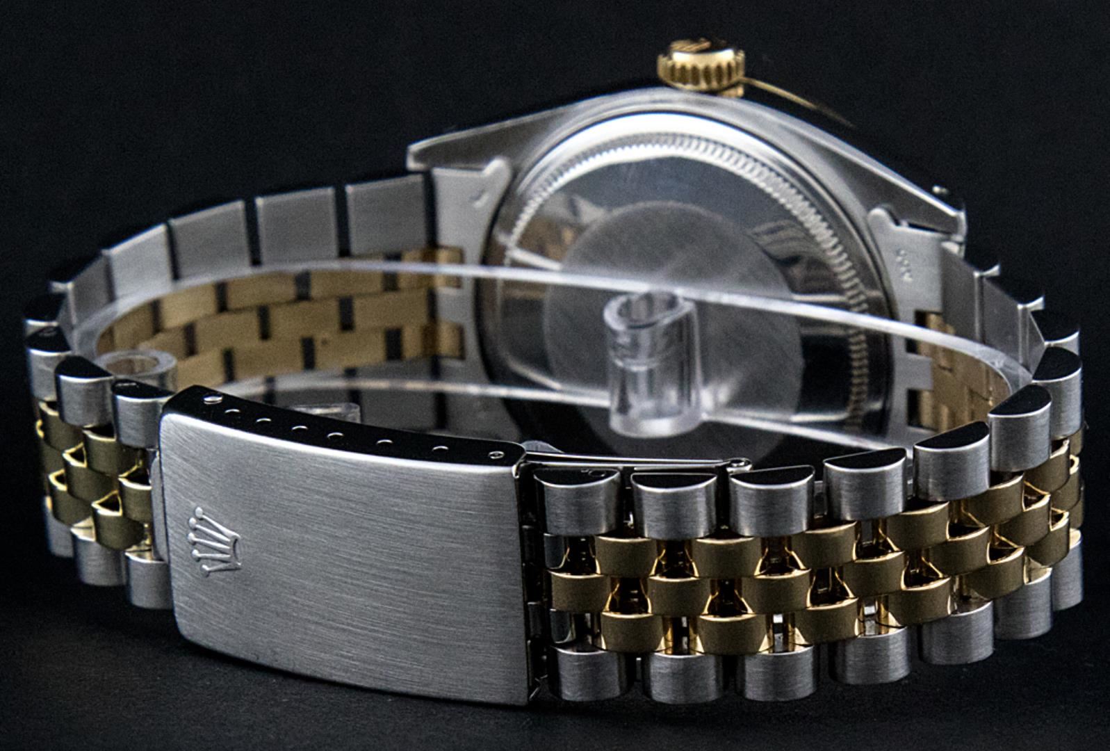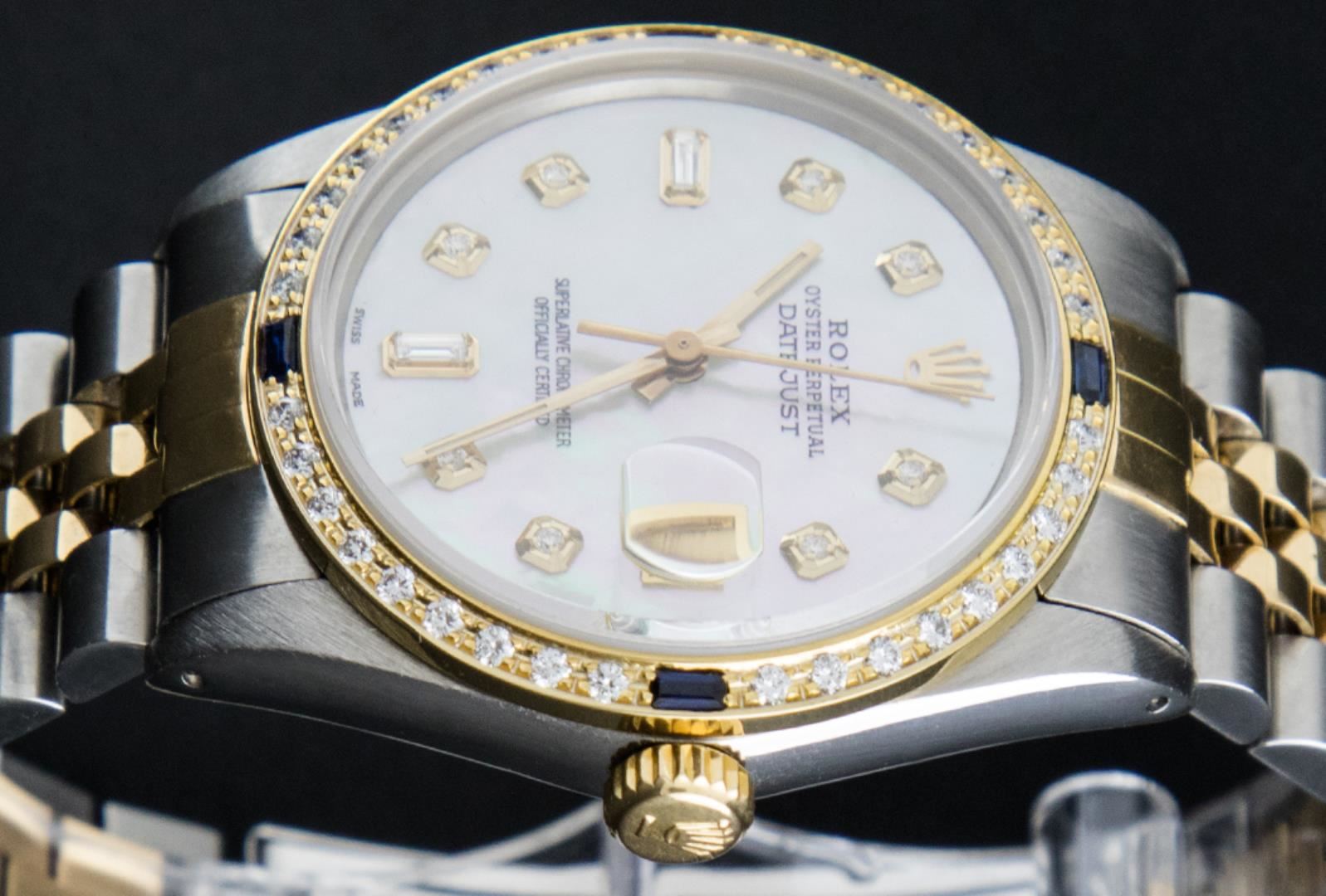 One Mens Pre Owned Two Tone Yellow Gold And Stainless Steel Rolex Datejust Polished, Serviced And Electronically Tested, Rolex Case: Yellow Gold And Stainless Steel Case: 36mm, Yellow Gold Crown, Custom Bezel: New 18K Yellow Gold Sapphire Beadset Diamond Bezel, Diamond Count: 36 Diamonds + 4 Sapphires. Custom Crystal: New Sapphire With Magnified Date Window. Rolex Movement: Automatic Winding Movement 3035. Custom Dial: Custom White Dial Set With Added Diamond Hour Markers, Diamond Count: 8 + 2 Baguette Diamonds On Dial. Date Window: 3 O'Clock Position Date Display, Quickset, Model: Datejust. Condition: G-6 Extra Fine. Rolex Bracelet: Two Tone Yellow Gold And Stainless Steel Jubilee Band. Bright Polish. 7.0 Inch Length, Adjustable. Standard Clasp, With Rolex Logo. This Watch Has Been Serviced Time Tested And Is In Excellent Condition It Is Free Of All Scratches And Dents.