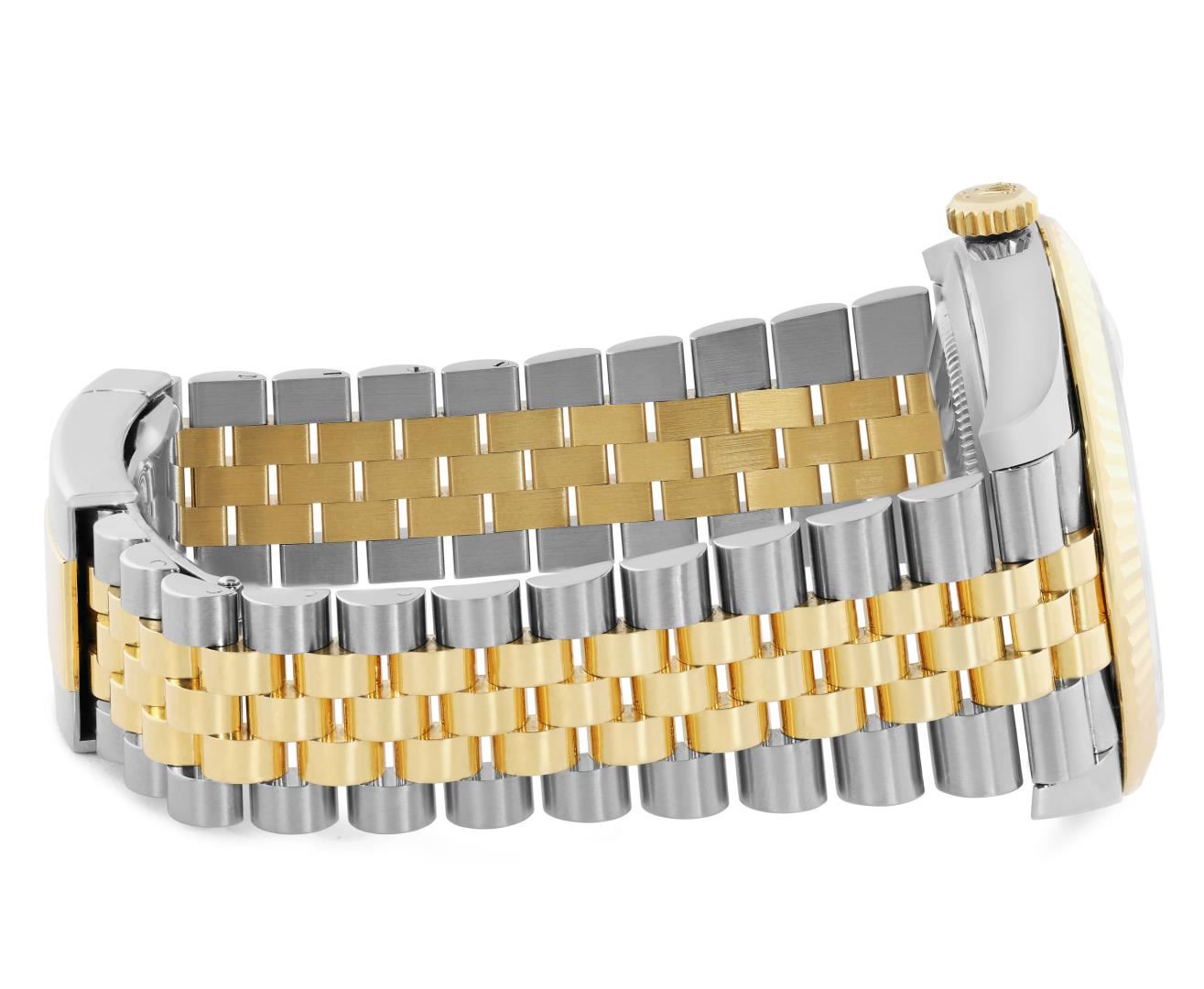 One Mens Pre Owned 18K Yellow Gold And Stainless Steel Rolex Datejust 41MM Polished, Serviced and Electronically Tested, Rolex Yellow Gold and Stainless Steel Case: 41mm, Rolex Yellow Gold Crown, Rolex Bezel: 18K Yellow Gold Fluted Bezel. Crystal: Sapphire With Magnified Date Window. Rolex Hands: Lumi Hands. Rolex Movement: Automatic Winding Movement 3235. Rolex Dial: Factory Silver Dial with Luminous Index Hour Markers. Date Window: 3 O'Clock Position Date Display, Quickset, Model: Datejust 41MM. Condition: G-6 Extra Fine. Rolex Bracelet: Two Tone 18K Yellow Gold And Stainless Steel Jubilee Band. Bright Polish. 7.0 Inch Length, Adjustable. Standard Clasp, With Rolex Logo. This Watch Has Been Serviced And Polished It Is Free Of All Scratches And Dents.