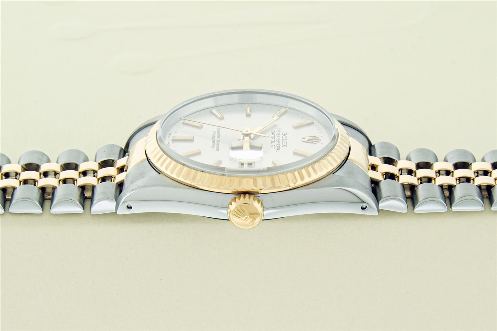 One Mens Pre Owned Yellow Gold Two Tone Rolex Datejust Polished, Serviced & Electronically Tested, Rolex Yellow Gold & Stainless Steel Case: 36mm, Rolex Yellow Gold Crown, Rolex Bezel: Yellow Gold Fluted Bezel. Custom Crystal: New Acrylic Cyclops Lens. Cu