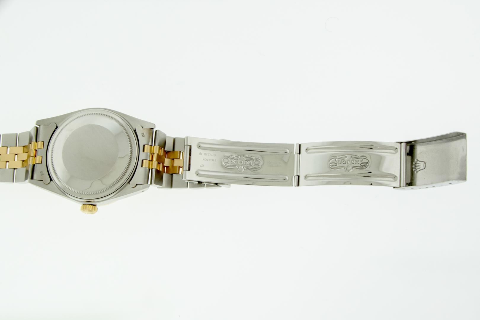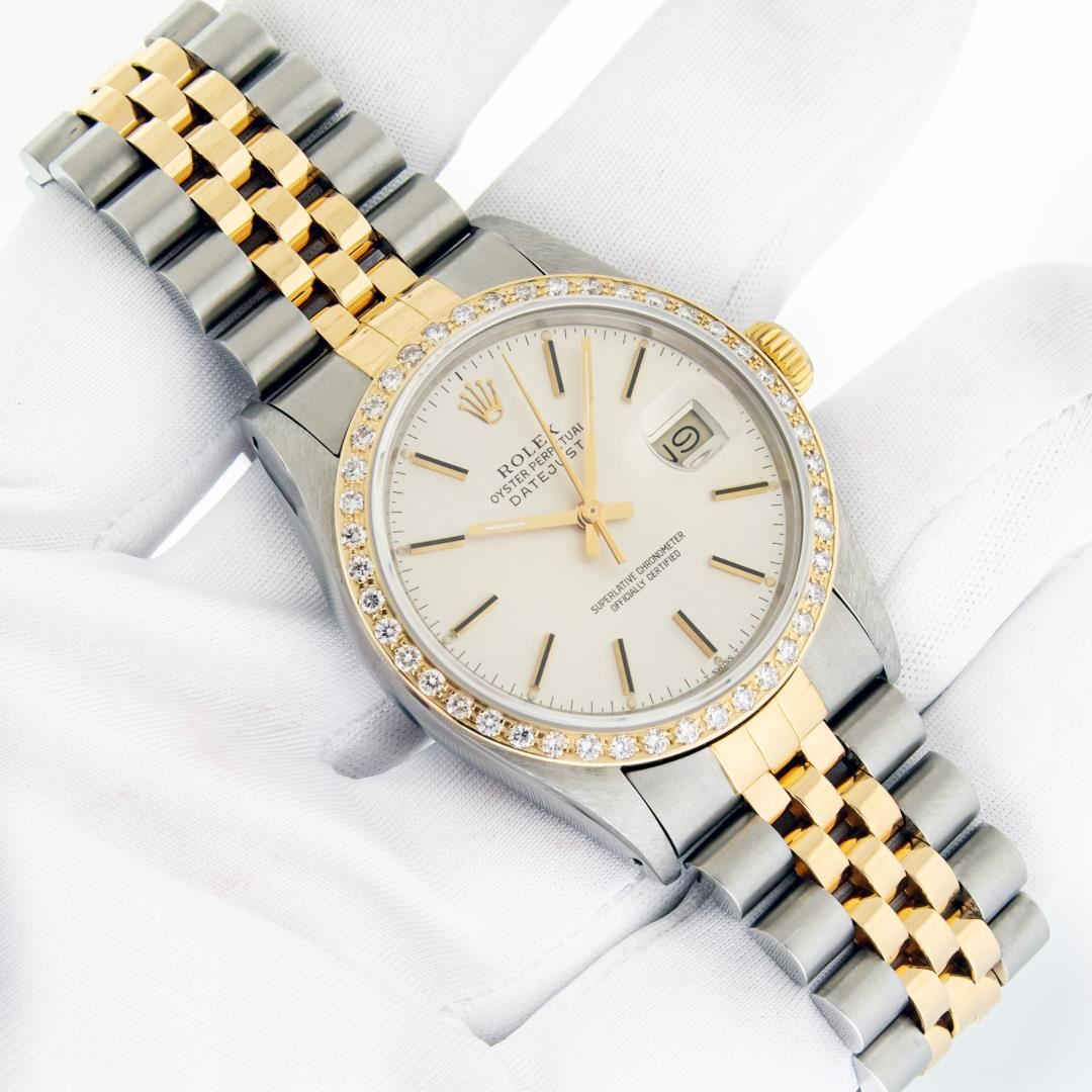 One Mens Pre Owned Two Tone Yellow Gold and Stainless Steel Rolex Datejust Polished, Serviced & Electronically Tested, Rolex Yellow Gold & Stainless Steel Case: 36mm, Rolex Yellow Gold Crown, Custom Bezel: New 18K Yellow Gold Beadset Diamond Bezel, Diamond Count: 44 Diamonds. Custom Crystal: New Sapphire With Magnified Date Window. Custom Hands: New Luminecent Hands. Rolex Movement: Automatic Winding Movement. Rolex Dial: Silver Index Dial With Dash Track. Date Window: 3 O'Clock Position Date Display, Quickset, Model: Condition: G-6 Extra Fine. Rolex Bracelet: Two Tone Yellow Gold & Stainless Steel Jubilee Band. Bright Polish. 7.0 Inch Length, Adjustable. Standard Clasp, With Rolex Logo. This Watch Has Been Serviced Time Tested And Is In Excellent Condition It Is Free Of All Scratches And Dents.