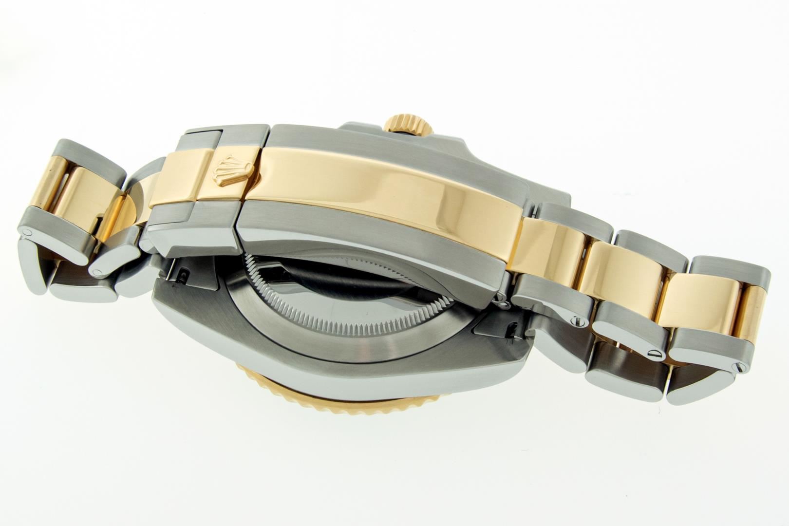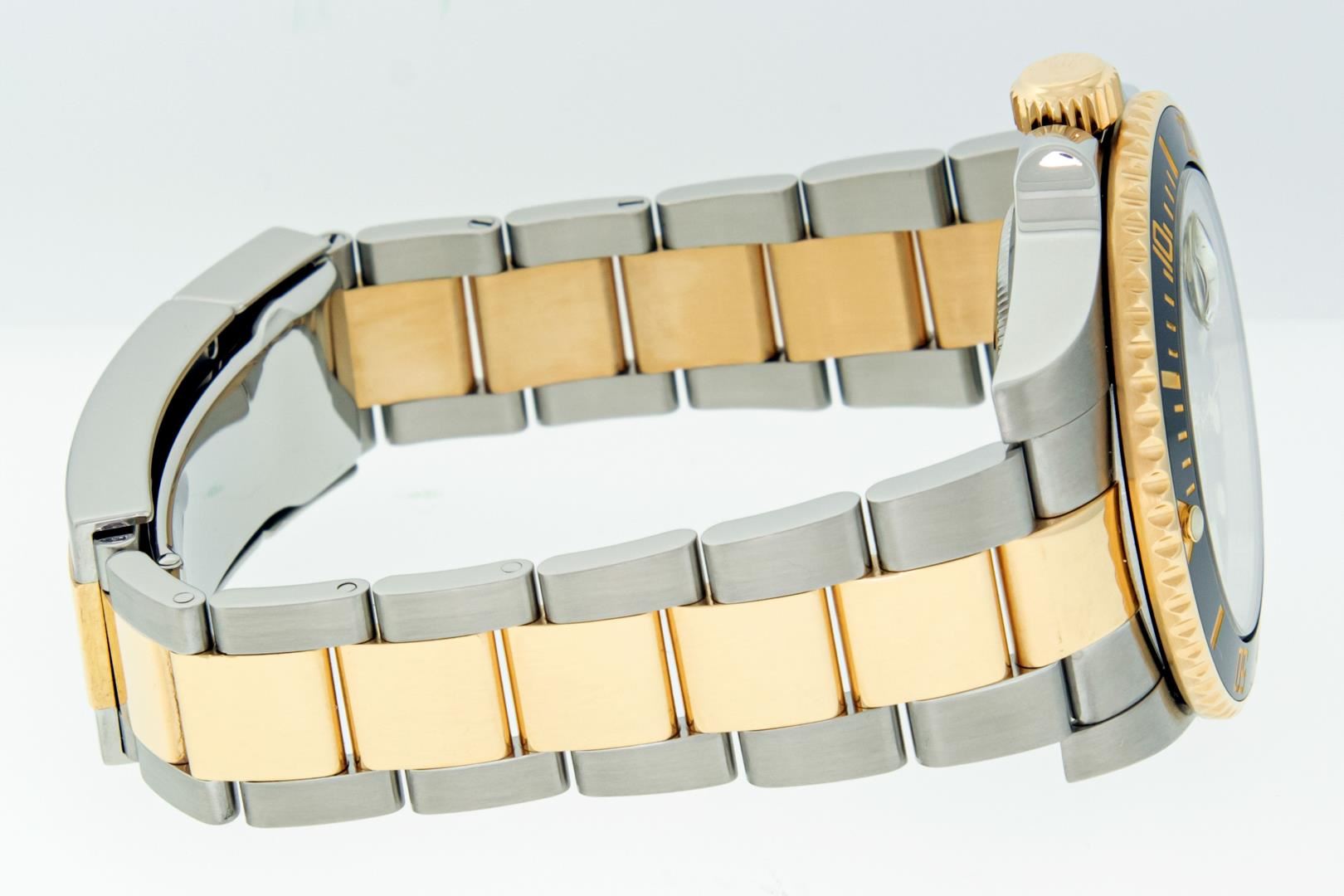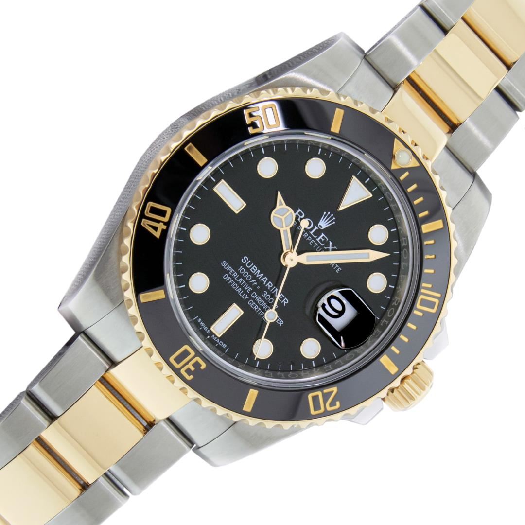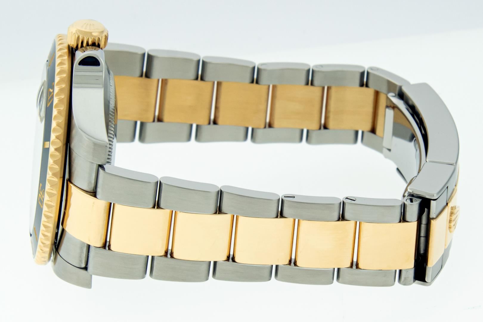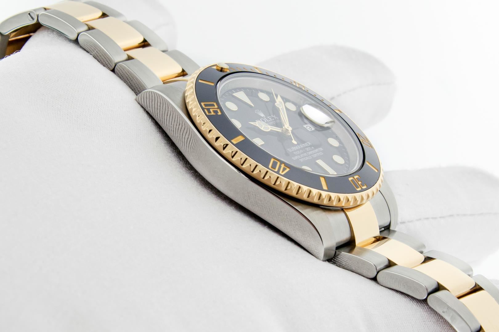 One Mens Pre Owned Rolex 18K Yellow Gold And Stainless Steel Submariner Polished Bright with Satin Finish, This Watch Has Been Serviced & Electronically Tested, Rolex Stainless Steel & 18K Yellow Gold Case: 40mm, Rolex Bezel: Rolex 18k Yellow Gold Rotatable Bezel With Black Ceramic Insert. Rolex Crystal: Sapphire With Magnified Date Window. Rolex Hands: Luminous hands. Rolex Movement: Automatic Movement 3135. Rolex Dial: Black Submariner Dial. Functions: Date, Rotating Bezel. Model: Ceramic Date Submariner. Condition: G-6 Extra Fine. Rolex Bracelet: 18K Yellow Gold And Stainless Steel Oyster Band. Bright Polish & Satin Finish. 7.00 Inch Length, Adjustable. Flip Lock Clasp with Rolex Logo. This Watch Has Been Serviced Time Tested And Is In Excellent Condition It Is Free Of All Scratches And Dents. This Watch Comes With A Rolex Box And Booklets.