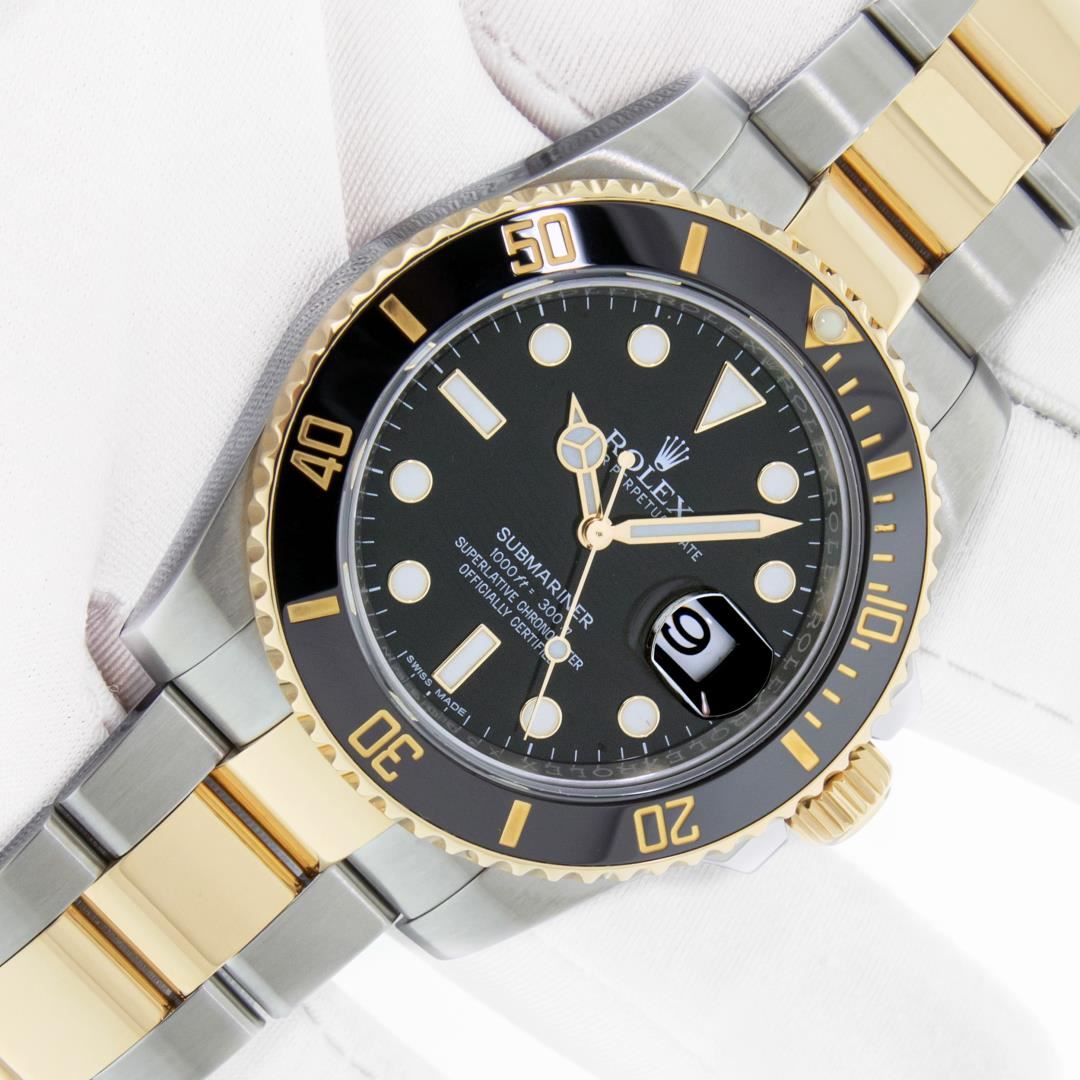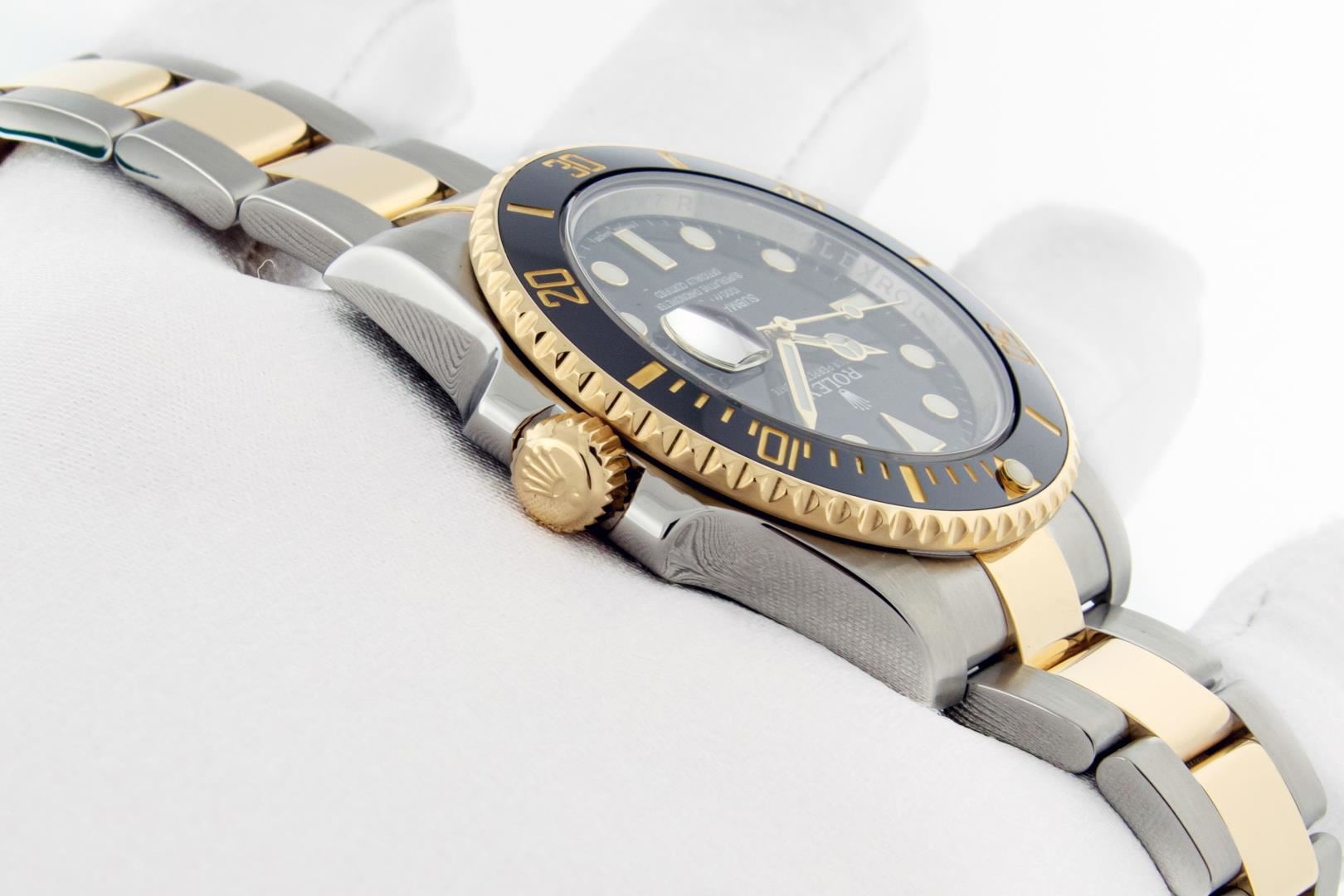 One Mens Pre Owned Rolex 18K Yellow Gold And Stainless Steel Submariner Polished Bright with Satin Finish, This Watch Has Been Serviced & Electronically Tested, Rolex Stainless Steel & 18K Yellow Gold Case: 40mm, Rolex Bezel: Rolex 18k Yellow Gold Rotatable Bezel With Black Ceramic Insert. Rolex Crystal: Sapphire With Magnified Date Window. Rolex Hands: Luminous hands. Rolex Movement: Automatic Movement 3135. Rolex Dial: Black Submariner Dial. Functions: Date, Rotating Bezel. Model: Ceramic Date Submariner. Condition: G-6 Extra Fine. Rolex Bracelet: 18K Yellow Gold And Stainless Steel Oyster Band. Bright Polish & Satin Finish. 7.00 Inch Length, Adjustable. Flip Lock Clasp with Rolex Logo. This Watch Has Been Serviced Time Tested And Is In Excellent Condition It Is Free Of All Scratches And Dents. This Watch Comes With A Rolex Box And Booklets.