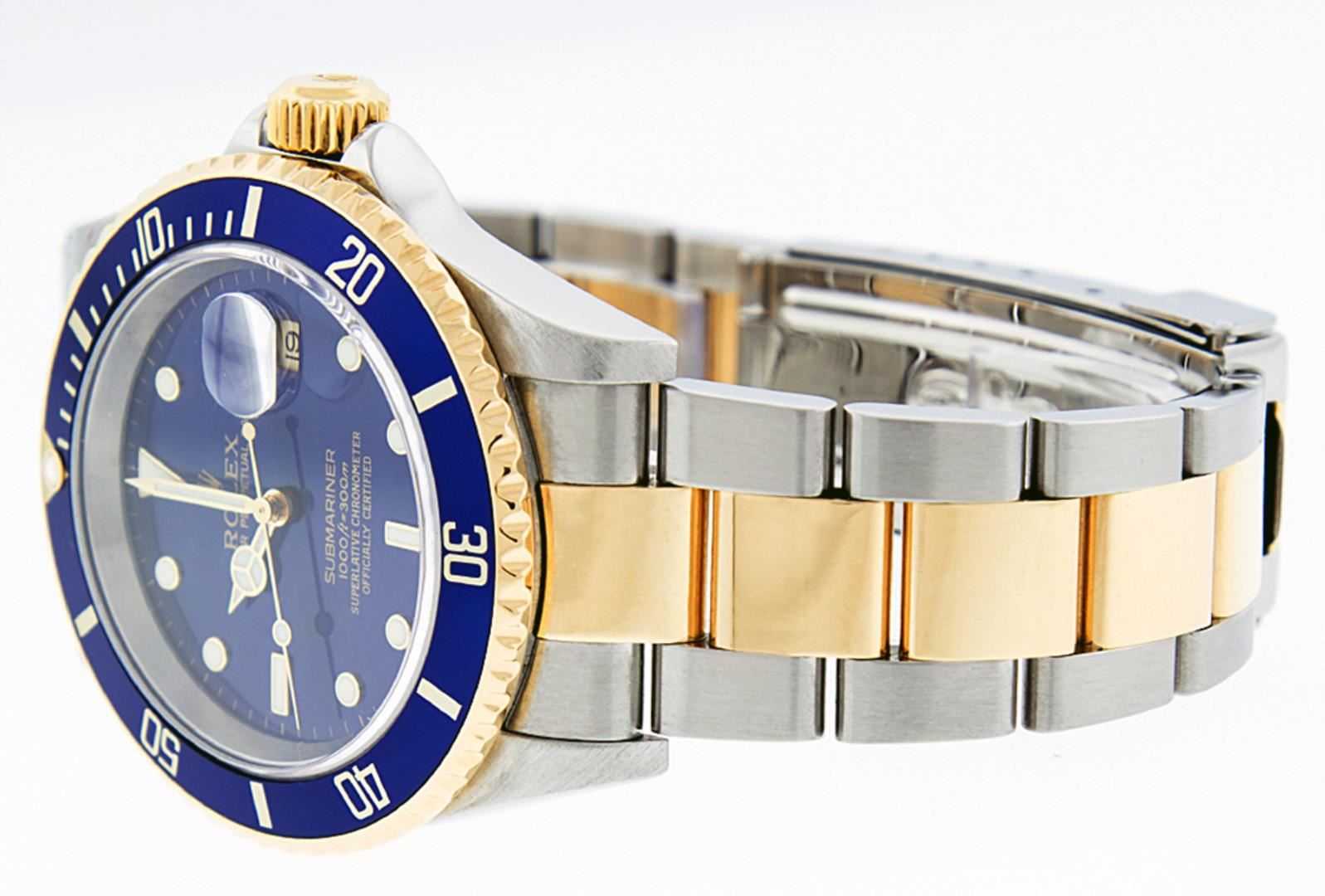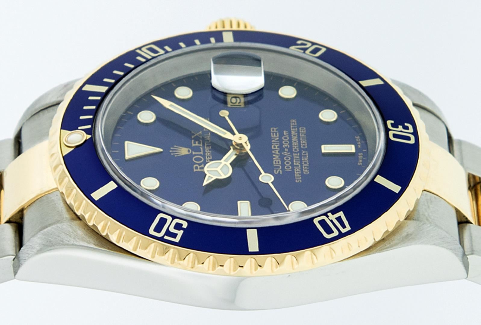 One Mens Pre Owned Rolex 18K Yellow Gold And Stainless Steel Two Tone Submariner With Date Polished, Serviced & Electronically Tested, Rolex Stainless Steel Case: 40mm, Rolex Yellow Gold Crown, Rolex Bezel: Yellow Gold Rotatable Bezel With Blue Insert. Crystal: Sapphire With Magnified Date Window Lens. Rolex Movement: Automatic Winding Movement Caliber 3135. Rolex Dial: Rolex Blue Submariner Dial with Luminous Index Hour Markers, Date Window: 3 O'Clock Position Date Display, Model: Submariner, Quickset, Condition: G-6 Extra Fine. Rolex Bracelet: Stainless Steel and Yellow Gold Oyster Band With Gold Through The Buckle. Bright Polish & Satin Finish. 7.0 Inch Length, Adjustable. Standard Yellow Gold Clasp, With Rolex Logo.