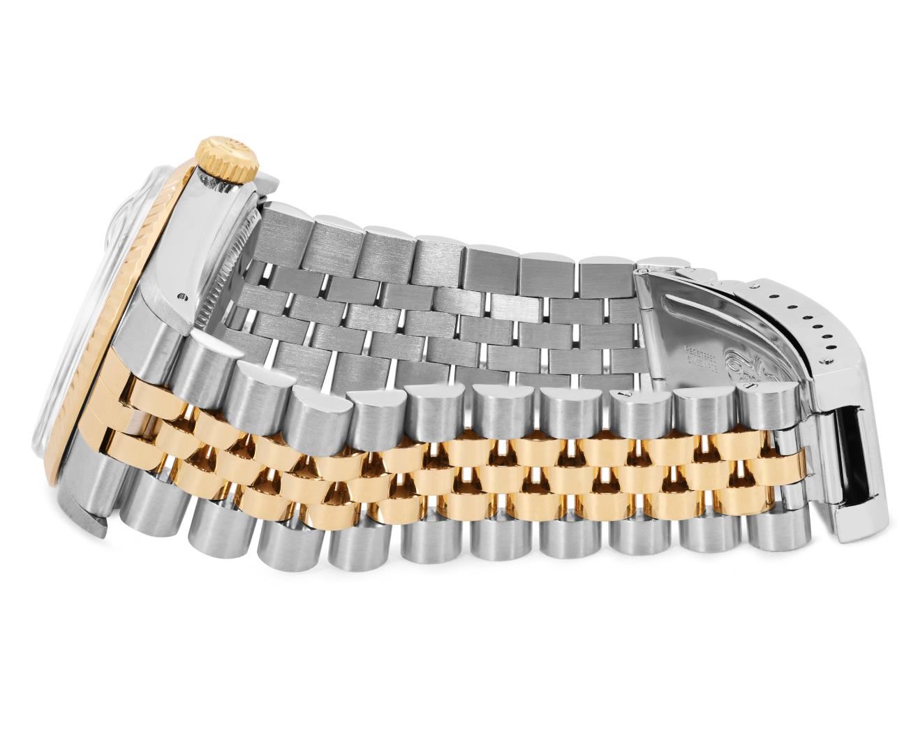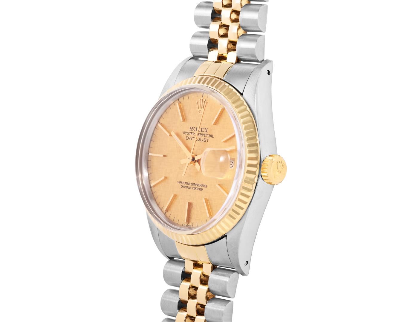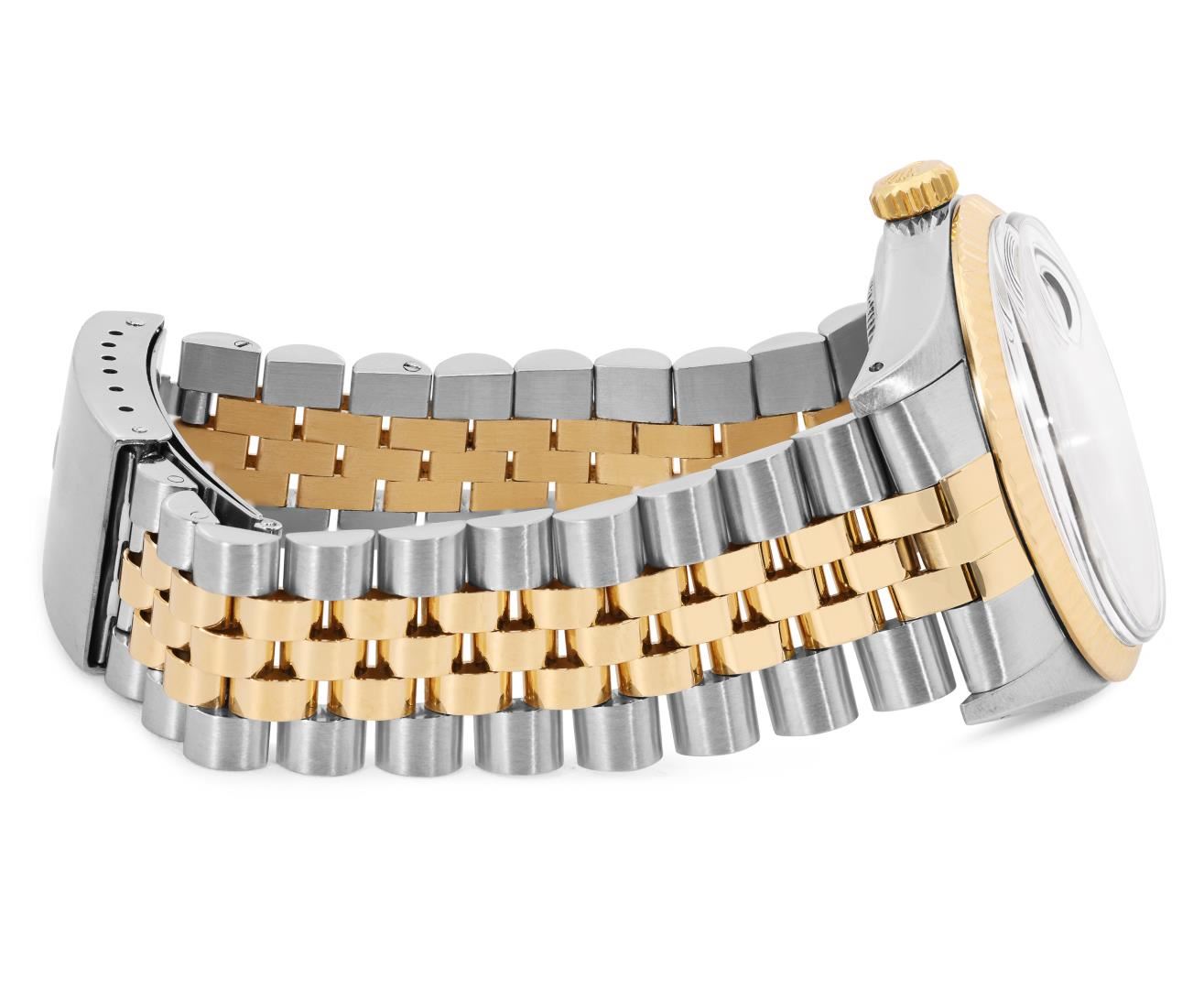 One Mens Pre Owned 18K Two Tone Yellow Gold And Stainless Steel Rolex Datejust Polished, Serviced And Electronically Tested, Rolex Yellow Gold And Stainless Steel Case: 36mm, Rolex Yellow Gold Crown, Rolex Bezel: Yellow Gold Fluted Bezel. Custom Crystal: New Plastic With Magnified Date Window. Hands: Luminescent Hands. Rolex Movement: Automatic Winding Movement 3035. Rolex Dial: Tapestry Champagne Dial With Index Hour Markers and Dash Track With Lumi Dots. Date Window: 3 O'Clock Position Date Display, Quickset, Model: Quickset Datejust. Condition: G-6 Extra Fine. Rolex Bracelet: Two Tone Yellow Gold And Stainless Steel Jubilee Band. Bright Polish. 7.0 Inch Length, Adjustable. Standard Clasp, With Rolex Logo. This Watch Has Been Serviced Time Tested And Is In Excellent Condition It Is Free Of All Scratches And Dents. This Watch Comes With A Rolex Box.