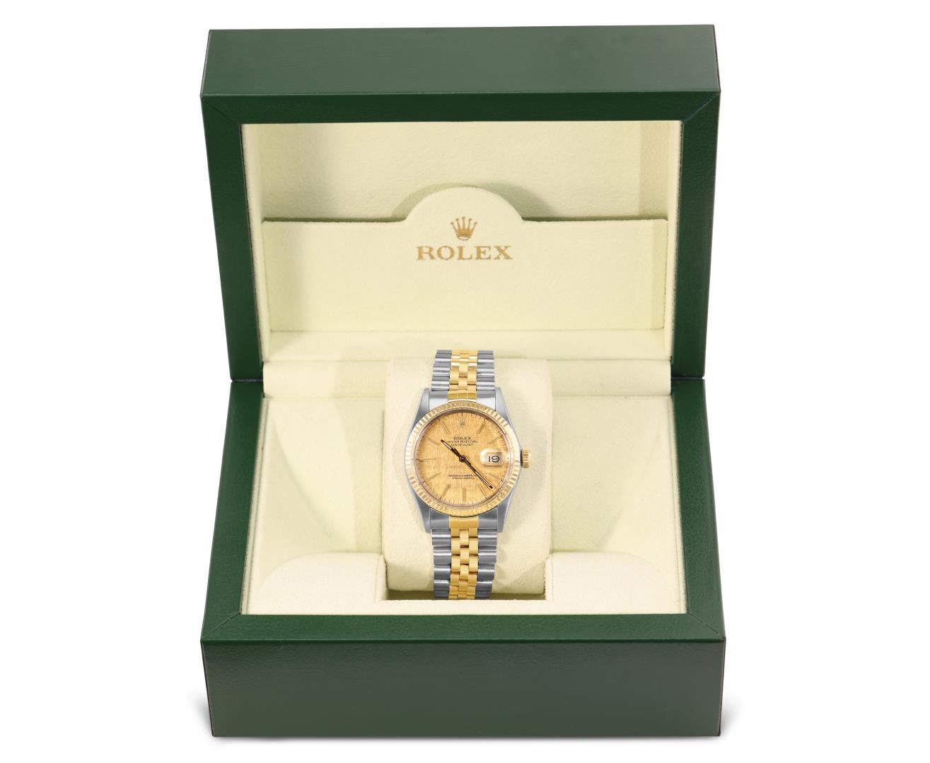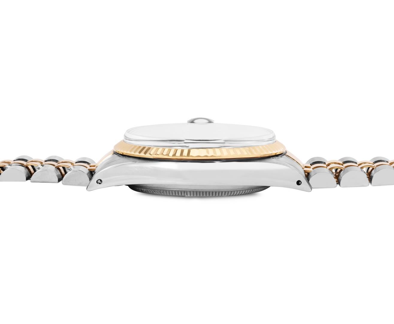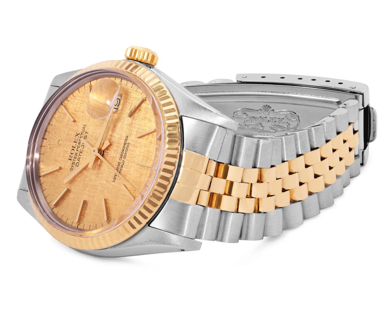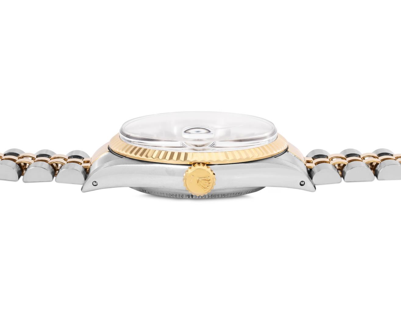 One Mens Pre Owned 18K Two Tone Yellow Gold And Stainless Steel Rolex Datejust Polished, Serviced And Electronically Tested, Rolex Yellow Gold And Stainless Steel Case: 36mm, Rolex Yellow Gold Crown, Rolex Bezel: Yellow Gold Fluted Bezel. Custom Crystal: New Plastic With Magnified Date Window. Hands: Luminescent Hands. Rolex Movement: Automatic Winding Movement 3035. Rolex Dial: Tapestry Champagne Dial With Index Hour Markers and Dash Track With Lumi Dots. Date Window: 3 O'Clock Position Date Display, Quickset, Model: Quickset Datejust. Condition: G-6 Extra Fine. Rolex Bracelet: Two Tone Yellow Gold And Stainless Steel Jubilee Band. Bright Polish. 7.0 Inch Length, Adjustable. Standard Clasp, With Rolex Logo. This Watch Has Been Serviced Time Tested And Is In Excellent Condition It Is Free Of All Scratches And Dents. This Watch Comes With A Rolex Box.
