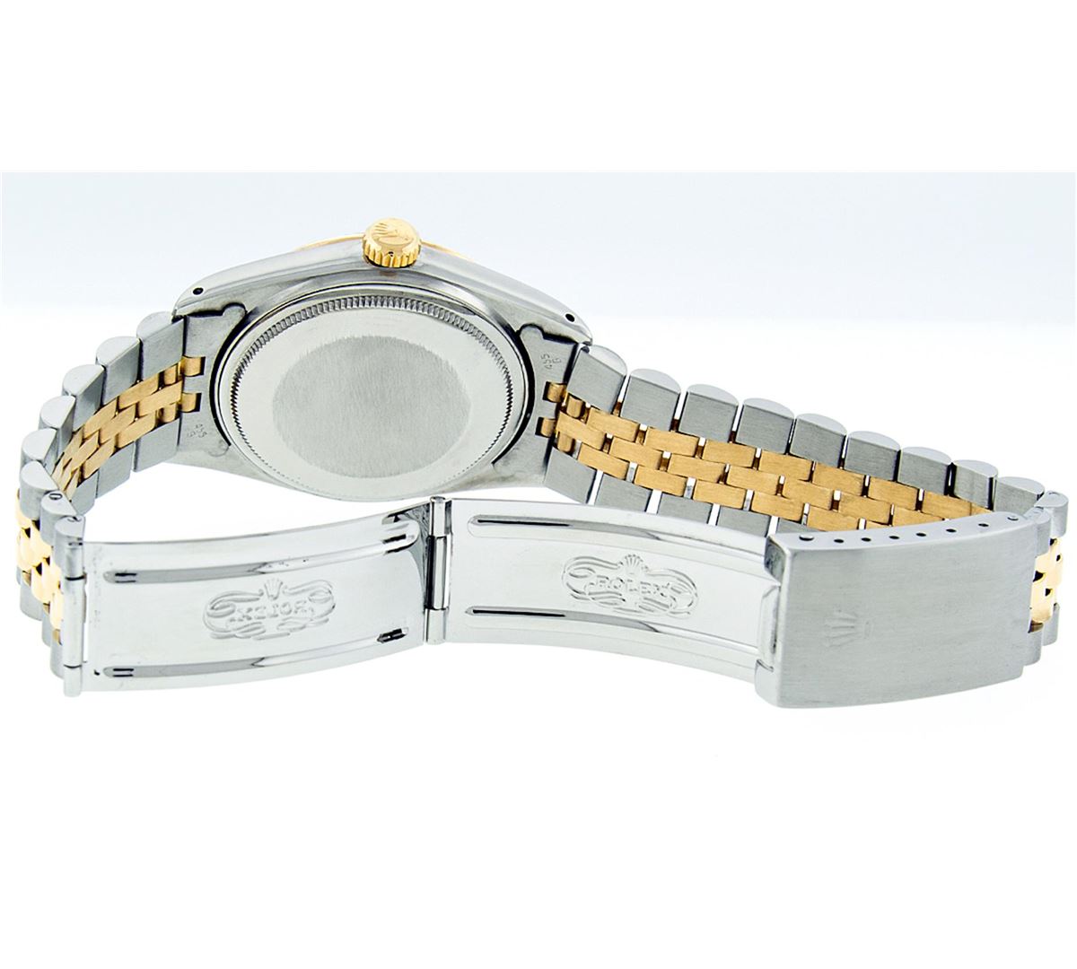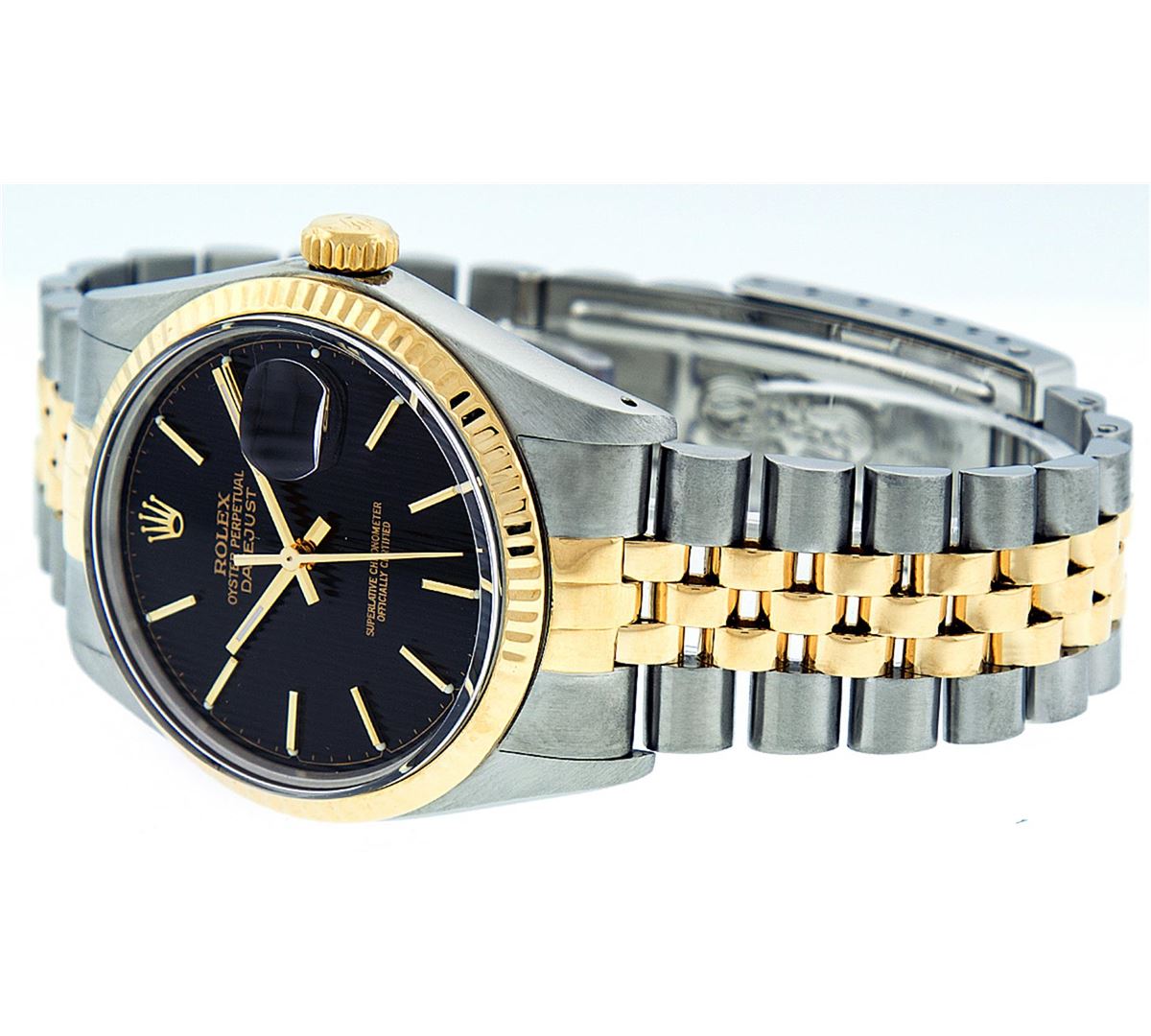 One Gents Two Tone Rolex Datejust Polished, Serviced & Electronically Tested, 14K Yellow Gold & Stainless Steel Case:36mm, 14K Yellow Gold Crown, Bezel: 14K Yellow Gold Fluted Bezel. Custom Crystal: Acrylic Cyclops Lens. Movement: Automatic Winding Movement Caliber 3035. Dial: Black Tapestry Index With Luminecent Dots. Date Window: 3 O'Clock Position Date Display, Quickset, Model: 16013 Condition: G-6 Extra Fine. Bracelet: Two Tone 14K Yellow Gold & Stainless Steel Jubilee. Bright Polish. 6.5 Inch Length, Adjustable. Standard Clasp, With Rolex Logo.