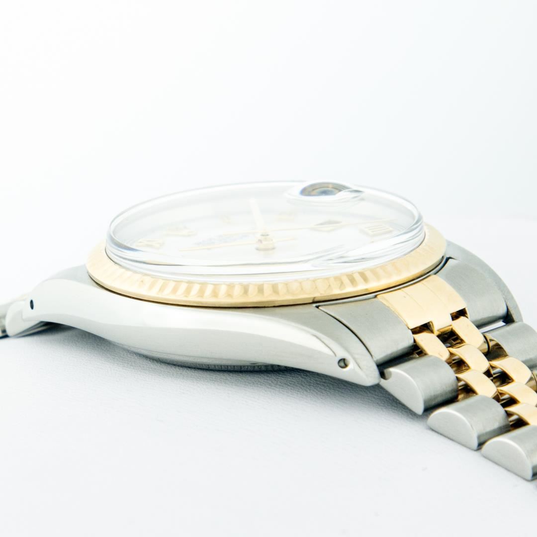 One Mens Pre Owned Two Tone Yellow Gold And Stainless Steel Rolex Datejust Polished, Serviced And Electronically Tested, Rolex Yellow Gold And Stainless Steel Case: 36mm, Rolex Yellow Gold Crown, Rolex Bezel: Yellow Gold Fluted Bezel. Custom Crystal: New Acrylic With Magnified Date Window. Custom Hands: New Luminescent Hands. Rolex Movement: Automatic Winding Movement 3035. Custom Dial: Custom White Roman Dial With Square Track. Date Window: 3 O'Clock Position Date Display, Quickset, Model: Quickset Datejust. Condition: G-6 Extra Fine. Rolex Bracelet: Two Tone Yellow Gold And Stainless Steel Jubilee Band. Bright Polish. 7.0 Inch Length, Adjustable. Standard Clasp, With Rolex Logo. This Watch Has Been Serviced Time Tested And Is In Excellent Condition It Is Free Of All Scratches And Dents.