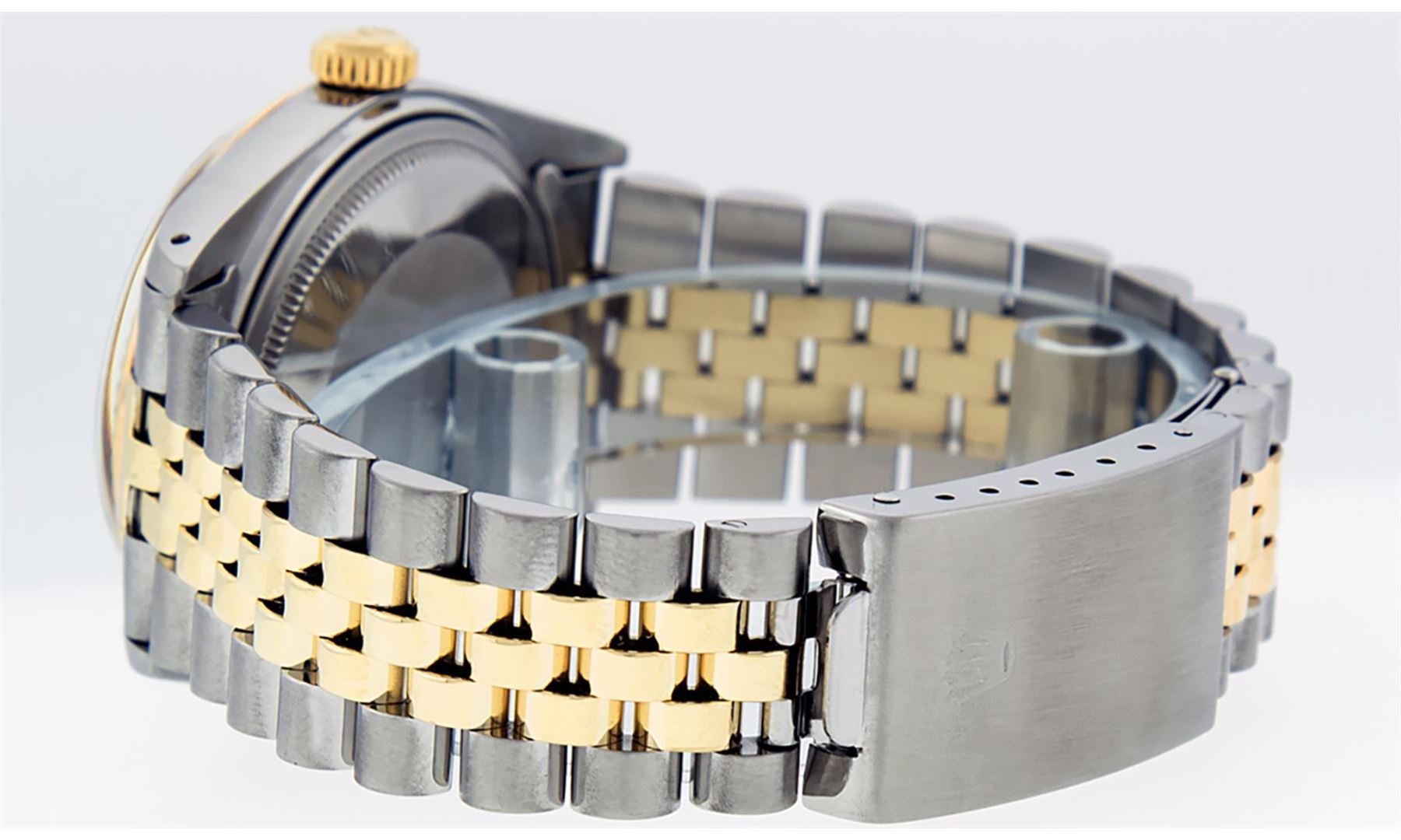 One Mens Pre Owned Yellow Gold Two Tone Rolex Datejust Polished, Serviced And Electronically Tested, Rolex Yellow Gold And Stainless Steel Case: 36mm, Rolex Yellow Gold Crown, Rolex Bezel: Yellow Gold Fluted Bezel. Custom Crystal: New Acrylic With Magnified Date Window. Custom Hands: New Luminescent Hands. Rolex Movement: Automatic Winding Movement 3035. Custom Dial: Custom White Roman Dial With Square Track. Date Window: 3 O'clock Position Date Display, Quickset, Model: Quickset Datejust. Condition: G-6 Extra Fine. Rolex Bracelet: Two Tone Yellow Gold And Stainless Steel Jubilee Band. Bright Polish. 7.0 Inch Length, Adjustable. Standard Clasp, With Rolex Logo. This Watch Has Been Serviced Time Tested And Is In Excellent Condition It Is Free Of All Scratches And Dents.
