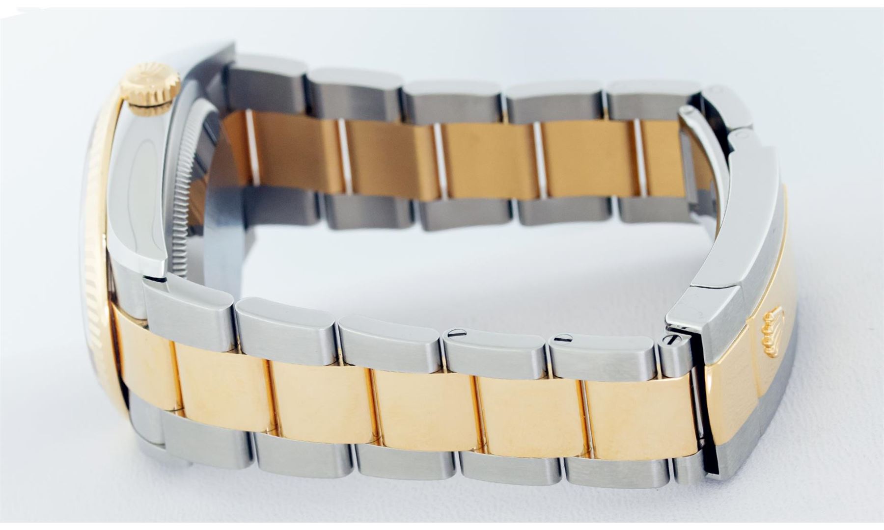 One Mens Rolex Two Tone 18K Yellow Gold And Stainless Steel Datejust, Polished Bright with Satin Finish, Serviced & Electronically Tested, Stainless Steel Case: 36mm, Rolex Yellow Gold Crown, Rolex Bezel: 18K Yellow Gold Fluted Bezel. Crystal: Sapphire With Cyclops Lens. Rolex Movement: Automatic Winding Movement Caliber 3235. Rolex Dial: "Wimbledon" Gray Roman Dial. Date Window: 3 O'Clock Position Date Display, Quickset, Model: Quickset Datejust 126233. Condition: G-6 Extra Fine. Rolex Bracelet: 18K Yellow Gold And Stainless Steel Oyster Band. Bright Polish & Satin Finish. 7.5 Inch Length, Adjustable. Standard Clasp, With Rolex Logo. This Pre Owned Watch Has Been Serviced Time Tested And Is In Excellent Condition It Is Free Of All Scratches And Dents. This Watch Comes With Box And Papers.
