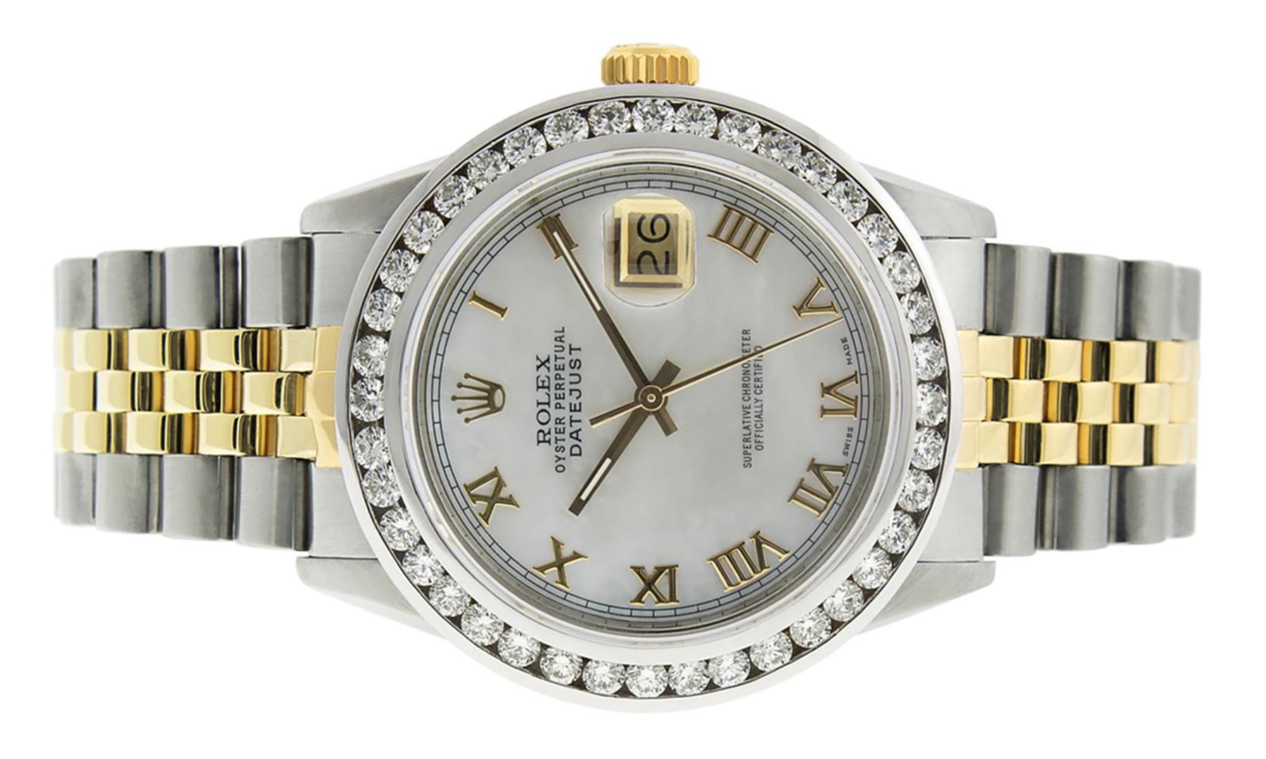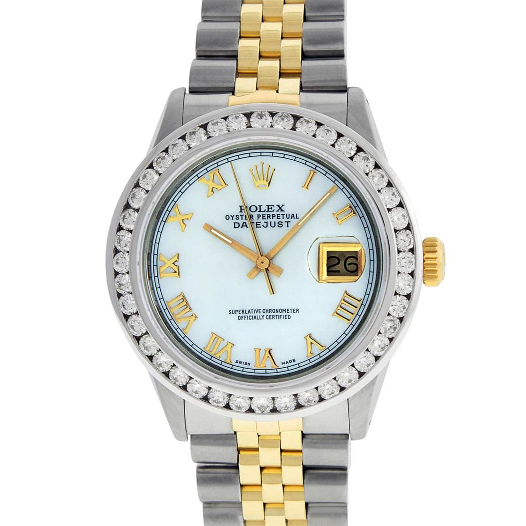 One Mens Rolex Datejust Polished Bright with Satin Finish, Serviced & Electronically Tested, Stainless Steel Case:36mm, Yellow Gold Crown, Custom Bezel: 18K White Gold 3ct Channel Set Diamond Bezel, Diamond Count: 40 Diamonds, Total Weight 3.00 Carat, Clarity: SI-VS, Color: G to H. Custom Crystal: Synthetic Sapphire Cyclops Lens. Movement: Automatic Winding Movement Caliber 3035. Custom Dial: White Roman Dial With Square Track. Date Window: 3 O'Clock Position Date Display, Quickset, Model: Datejust Condition: G-6 Extra Fine. Bracelet: 14K Yellow Gold And Stainless Steel Jubilee Band. Bright Polish & Satin Finish. 7.0 Inch Length, Adjustable. Standard Clasp, With Rolex Logo. This watch has been serviced and polished and its free of all dents and scratches and has been time tested.