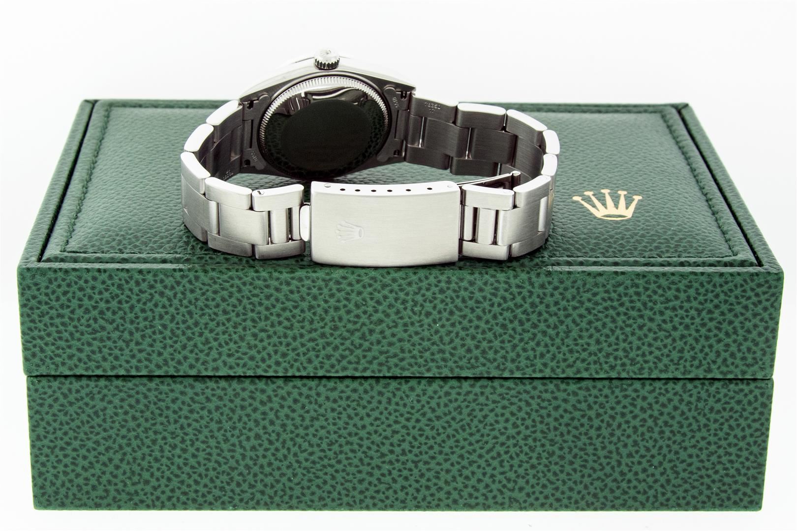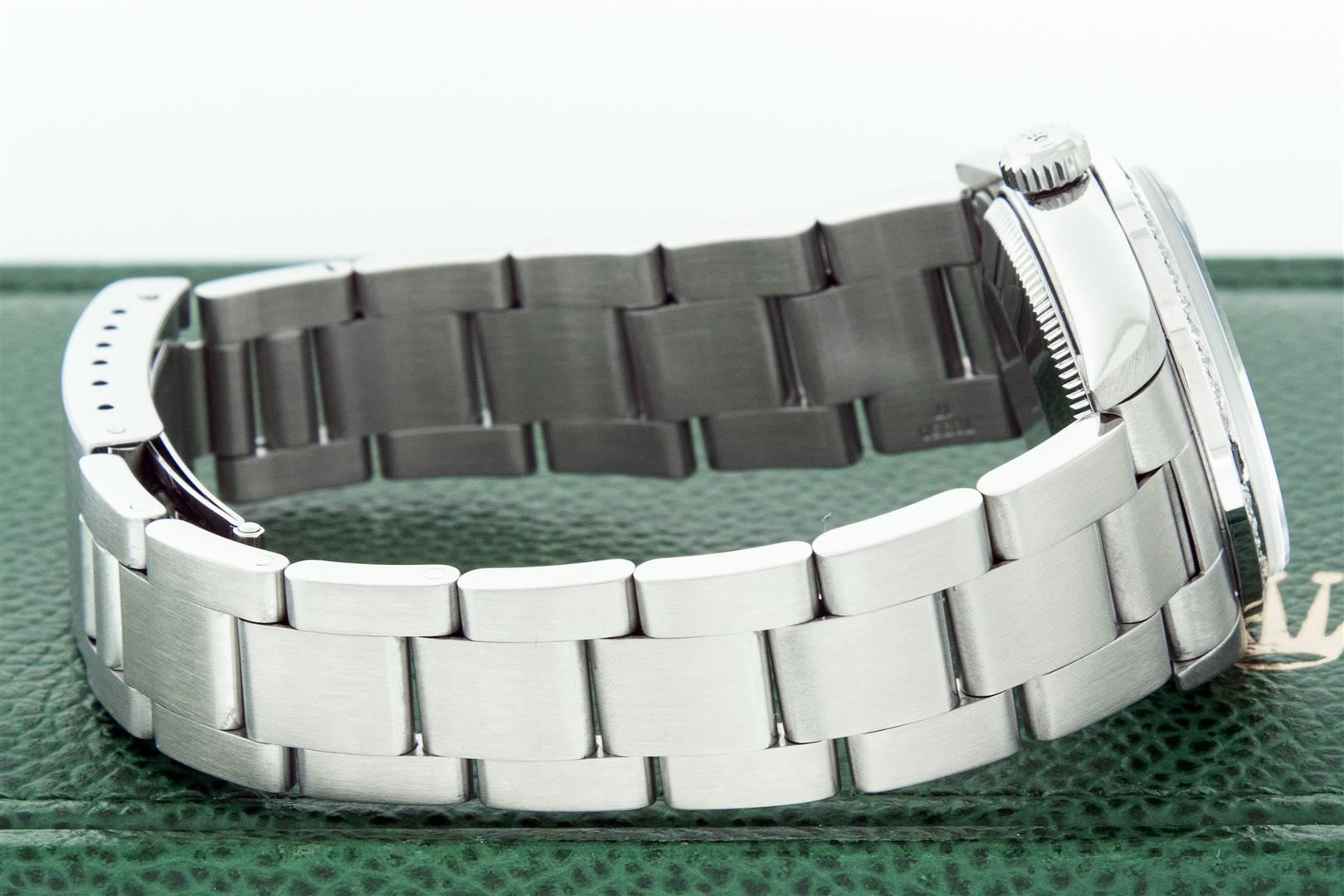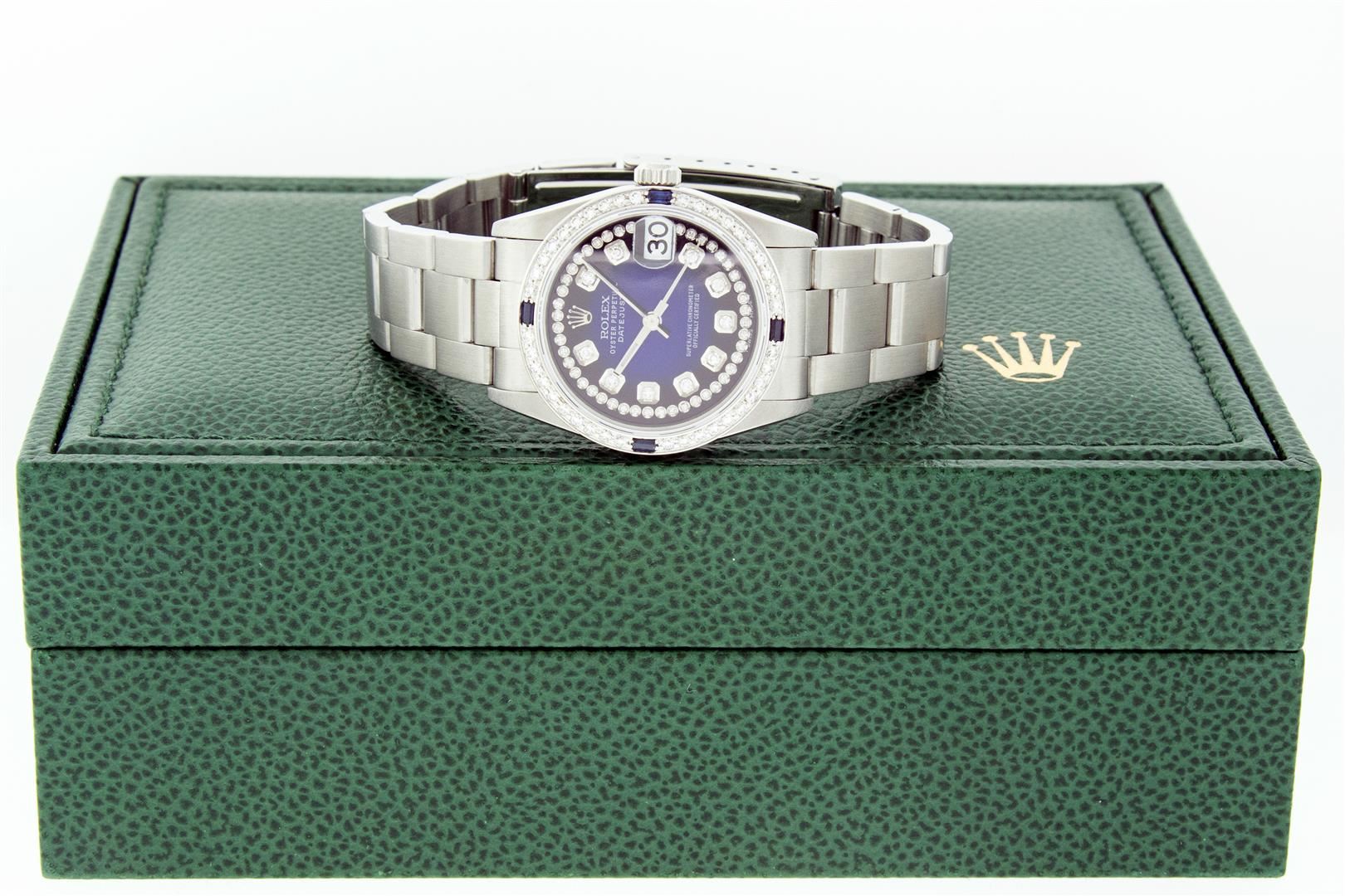 One Women's Midsize Stainless Steel Rolex Datejust Polished, Serviced & Electronically Tested, Rolex Stainless Steel Case : 31mm, Rolex Stainless Steel Crown, Custom Bezel: New 18K White Gold Sapphire Beadset Diamond Bezel, Diamond Count: 40 Diamonds + 4 Sapphires On Bezel, Color: G To H, Clarity: VS2-SI1. Custom Crystal: New Sapphire With Magnified Date Window. Custom Hands: New Luminescent Hands. Rolex Movement: Automatic Winding Movement Caliber 2235. Custom Dial: Refinished To Blue With Custom Added Diamond Hour Markers. Diamond Count: 43 Single Diamonds On Dial; Color: G to H, Clarity: VS2-SI1, Date Window: 3 O'clock Position Date Display, Quickset, Model: Midsize Datejust. Condition: G-6 Extra Fine. Rolex Bracelet: Stainless Steel Oyster Band. Bright Polish. 6.0 Inch Length, Adjustable. Standard Clasp, With Rolex Logo. This Pre Owned Watch Has Been Serviced Time Tested And Is In Excellent Condition It Is Free Of All Scratches And Dents. This Watch Comes With A Rolex Box.