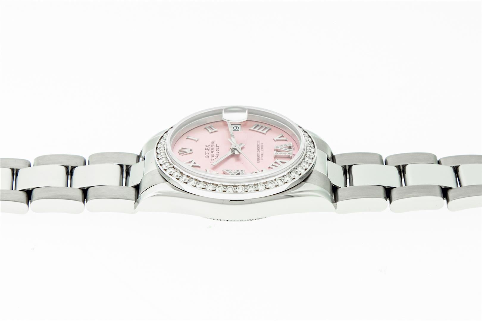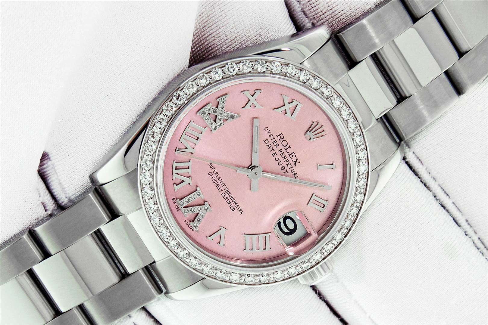 One Women's Midsize Stainless Steel Rolex Datejust Polished, Serviced & Electronically Tested, Rolex Stainless Steel Case : 31mm, Rolex Stainless Steel Crown, Custom Bezel: New 18K White Beadset Diamond Bezel, Diamond Count: 45 Diamonds On Bezel, Color: G To H, Clarity: VS2-SI1. Custom Crystal: New Sapphire With Magnified Date Window. Custom Hands: New Hands. Rolex Movement: Automatic Winding Movement Caliber 2135. Custom Dial: Refinished To Pink With Custom Added Diamonds. Diamonds On Dial; Color: G to H, Clarity: VS2-SI1, Date Window: 3 O'clock Position Date Display, Quickset, Model: Midsize Datejust. Condition: G-6 Extra Fine. Rolex Bracelet: Stainless Steel Oyster Band. Bright Polish. 6.0 Inch Length, Adjustable. Standard Clasp, With Rolex Logo. This Pre Owned Watch Has Been Serviced Time Tested And Is In Excellent Condition It Is Free Of All Scratches And Dents. This Watch Comes With A Rolex Box And Booklets.