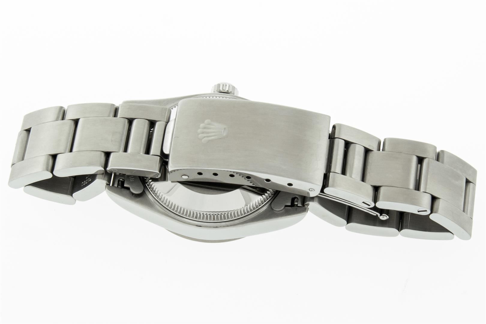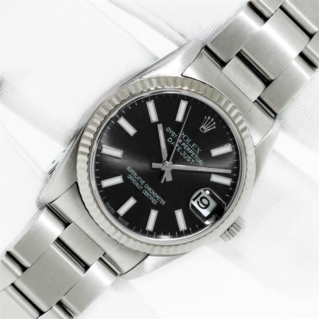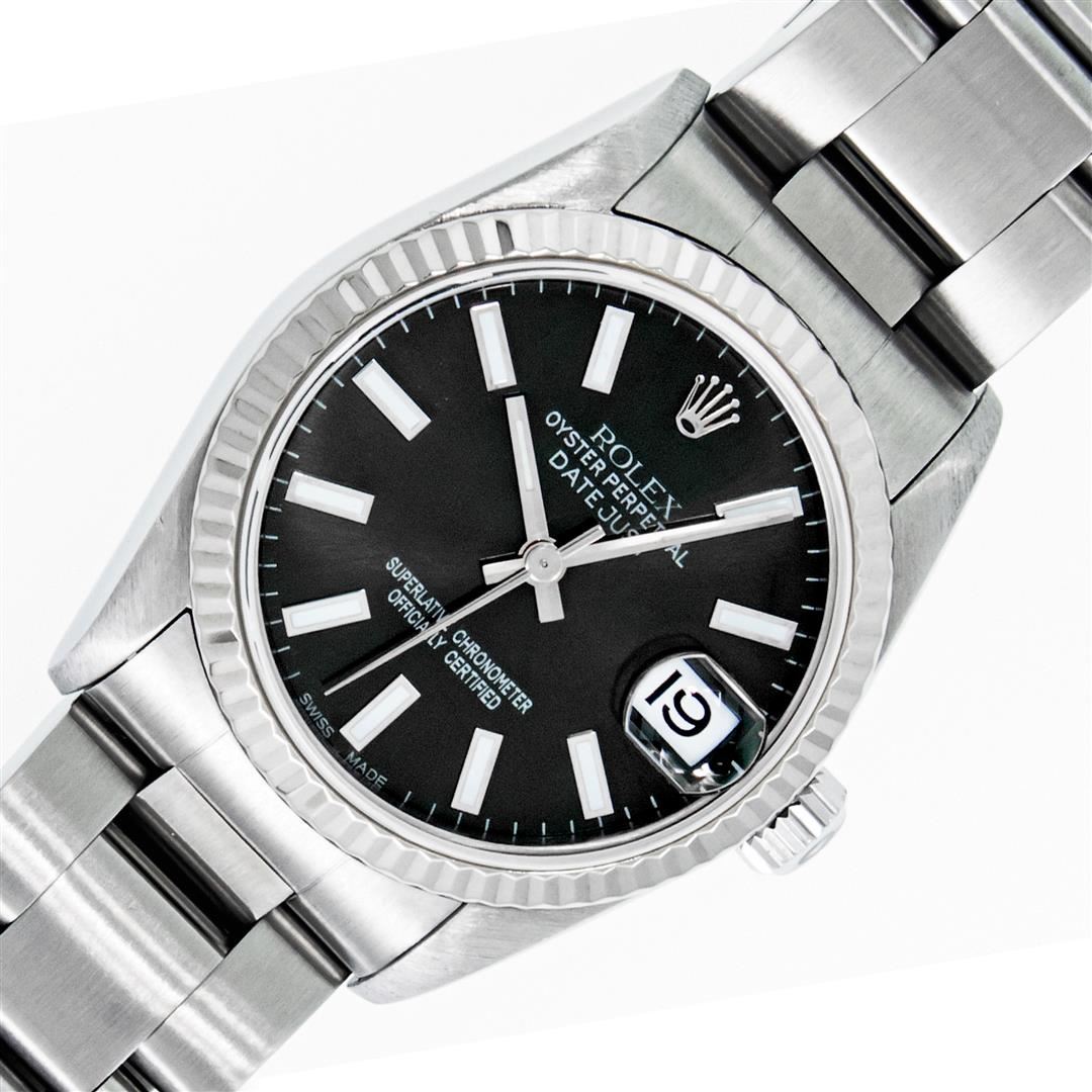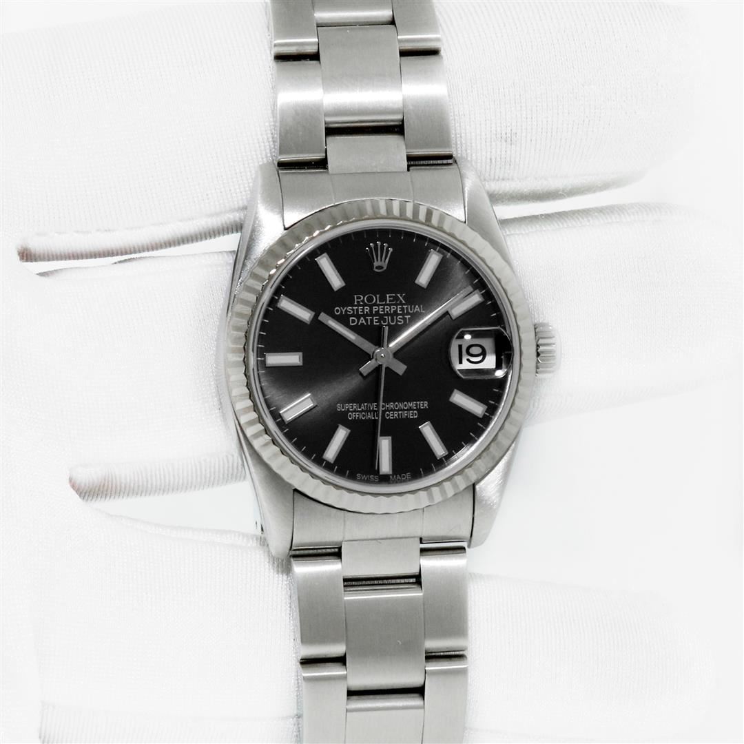 One Women's Midsize Stainless Steel Rolex Datejust Polished, Serviced & Electronically Tested, Rolex Stainless Steel case: 31mm, Rolex Stainless Steel Crown, Bezel: 18K White Gold Fluted Bezel, Custom Crystal: New Sapphire with Magnified Date Window. Custom Hands: New Luminescent Hands. Rolex Movement: Automatic Winding Movement Caliber 2235. Custom Dial: Black with Index Hour Markers, Date Window: 3 O'Clock Position Date Display, Quickset, Model: Midsize Datejust. Condition: G-6 Extra Fine. Rolex Bracelet: Stainless Steel Oyster Band. Bright Polish. 6.0 Inch Length, Adjustable. Standard Clasp, with Rolex Logo. This Pre Owned Watch Has Been Serviced Time Tested And Is In Excellent Condition It Is Free Of All Scratches And Dents.