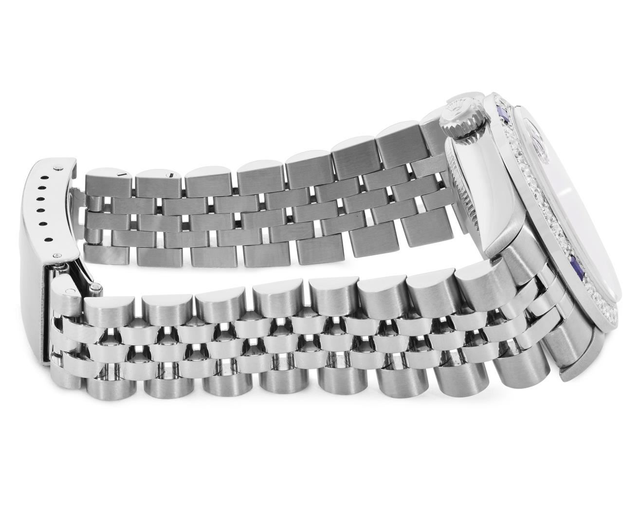 One Rolex Midsize 31MM Quickset Pre Owned Stainless Steel Datejust Wristwatch Polished Bright with Satin Finish, Serviced And Electronically Tested, Stainless Steel Case: 31mm, Stainless Steel Crown, Custom Bezel: New 18K White Gold Sapphire Beadset Diamond Bezel, Diamond + Gem Count: 36 Diamonds + 4 Sapphires. Crystal: Sapphire With Magnified Date Window. Hands: Luminescent Hands. Rolex Movement: Automatic Winding Movement 2235. Rolex Dial: Factory Black With Index Hour Markers, Lumi Dots, and Roman Track. Date Window: 3 O'Clock Position Date Display, Model: 31MM Quickset Datejust. Condition: G-6 Extra Fine. Rolex Bracelet: Stainless Steel Jubilee Band. Bright Polish And Satin Finish. 6.0 Inch Length, Adjustable. Fold Clasp, With Rolex Logo. This Watch Has Been Serviced Time Tested And Is In Excellent Condition It Is Free Of All Scratches And Dents.