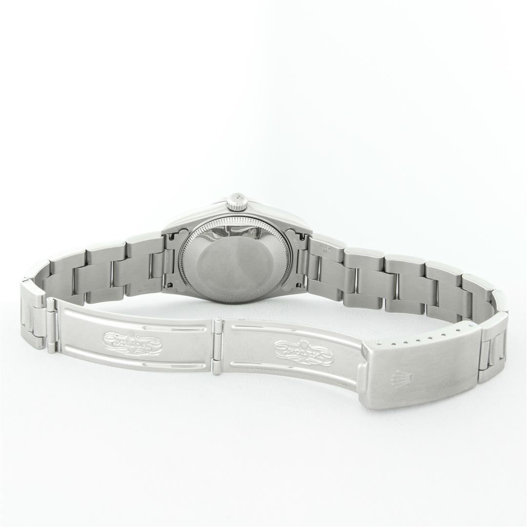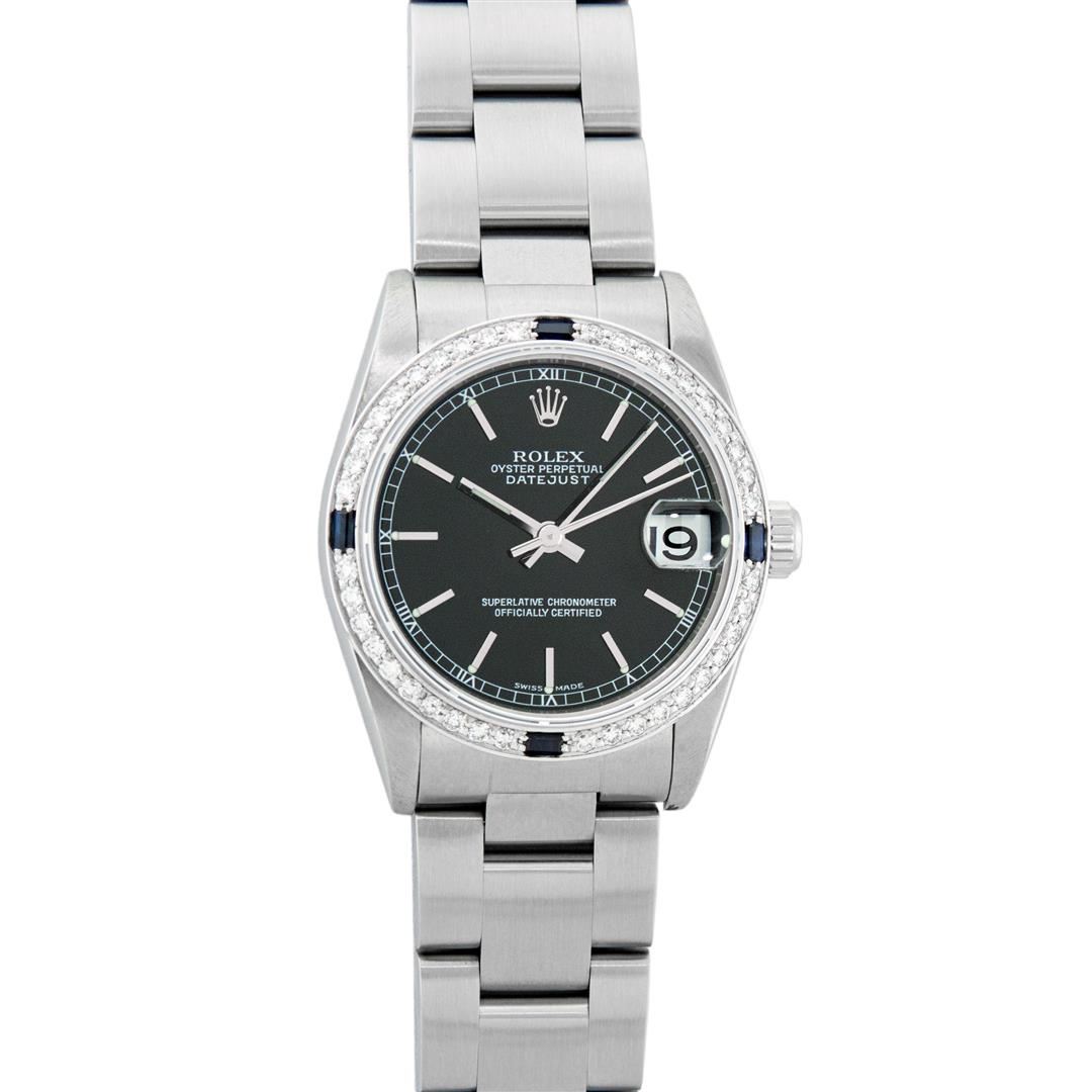 One Women's Pre Owned Midsize Stainless Steel Rolex Datejust Polished, Serviced & Electronically Tested, Rolex Stainless Steel case : 31mm, Rolex Stainless Steel Crown, Custom Bezel: New 18K White Gold Sapphire Beadset Diamond Bezel, Diamond Count: 40 Diamonds and 4 Sapphires On Bezel, Color: G To H, Clarity: VS2-SI1. Custom Crystal: New Scratch Resistant Synthetic Sapphire Cyclops Lens. Custom Hands: New Luminescent Hands. Rolex Movement: Automatic Winding Movement. Rolex Dial: Black Index Dial, Date Window: 3 O'Clock Position Date Display, Quickset, Model: Midsize Datejust. Condition: G-6 Extra Fine. Rolex Bracelet: Stainless Steel Oyster Band. Bright Polish. 6.0 Inch Length, Adjustable. Standard Clasp, With Rolex Logo. This Watch Has Been Serviced Time Tested And Is In Excellent Condition It Is Free Of All Scratches And Dents.