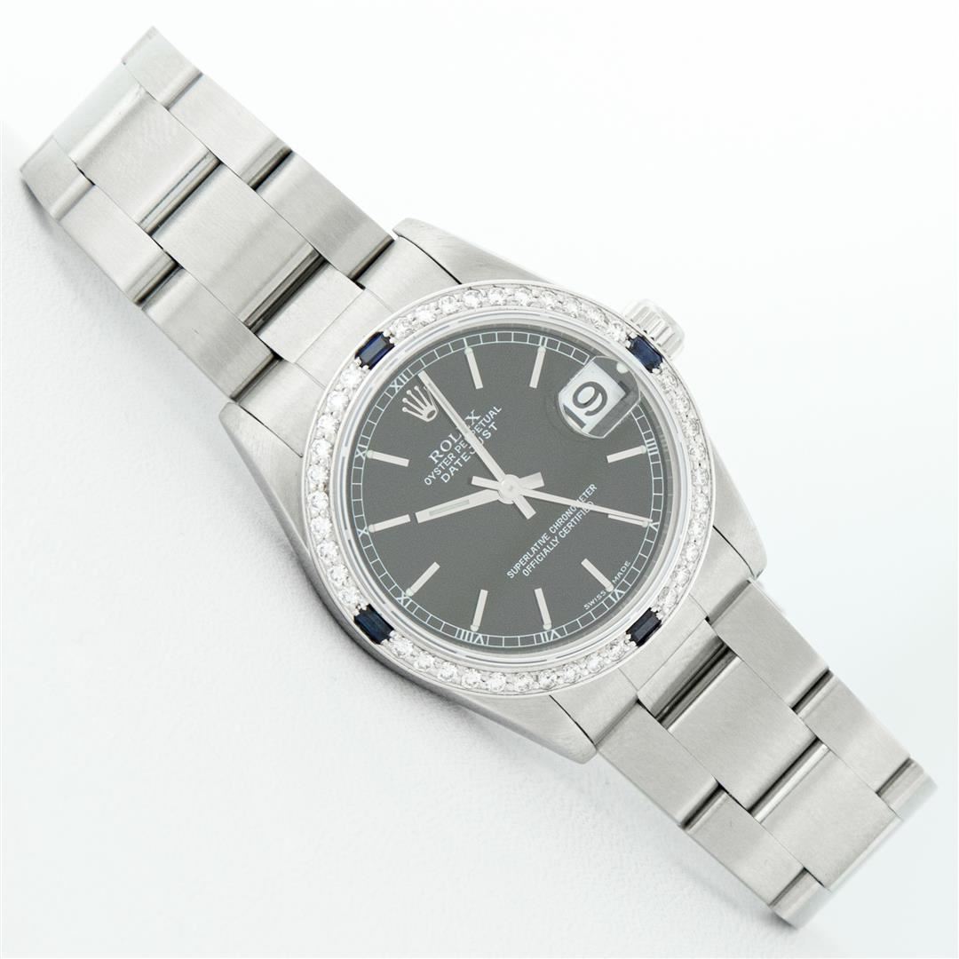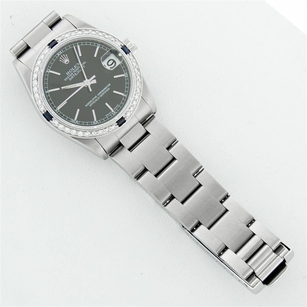 One Women's Pre Owned Midsize Stainless Steel Rolex Datejust Polished, Serviced & Electronically Tested, Rolex Stainless Steel case : 31mm, Rolex Stainless Steel Crown, Custom Bezel: New 18K White Gold Sapphire Beadset Diamond Bezel, Diamond Count: 40 Diamonds and 4 Sapphires On Bezel, Color: G To H, Clarity: VS2-SI1. Custom Crystal: New Scratch Resistant Synthetic Sapphire Cyclops Lens. Custom Hands: New Luminescent Hands. Rolex Movement: Automatic Winding Movement. Rolex Dial: Black Index Dial, Date Window: 3 O'Clock Position Date Display, Quickset, Model: Midsize Datejust. Condition: G-6 Extra Fine. Rolex Bracelet: Stainless Steel Oyster Band. Bright Polish. 6.0 Inch Length, Adjustable. Standard Clasp, With Rolex Logo. This Watch Has Been Serviced Time Tested And Is In Excellent Condition It Is Free Of All Scratches And Dents.