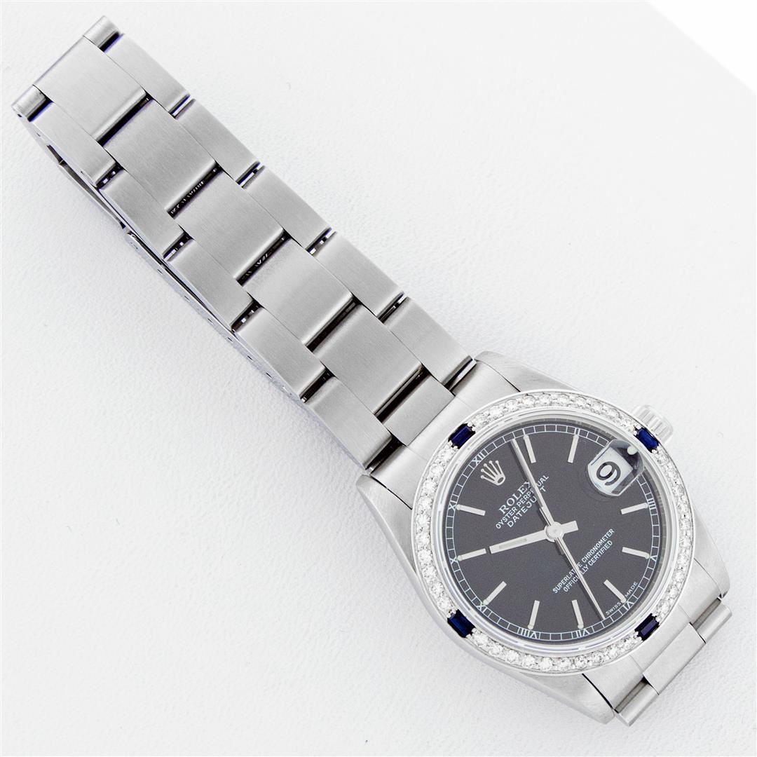 One Women's Pre Owned Midsize Stainless Steel Rolex Datejust Polished, Serviced & Electronically Tested, Rolex Stainless Steel case : 31mm, Rolex Stainless Steel Crown, Custom Bezel: New 18K White Gold Sapphire Beadset Diamond Bezel, Diamond Count: 40 Diamonds and 4 Sapphires On Bezel, Color: G To H, Clarity: VS2-SI1. Custom Crystal: New Scratch Resistant Synthetic Sapphire Cyclops Lens. Custom Hands: New Luminescent Hands. Rolex Movement: Automatic Winding Movement. Rolex Dial: Black Index Dial, Date Window: 3 O'Clock Position Date Display, Quickset, Model: Midsize Datejust. Condition: G-6 Extra Fine. Rolex Bracelet: Stainless Steel Oyster Band. Bright Polish. 6.0 Inch Length, Adjustable. Standard Clasp, With Rolex Logo. This Watch Has Been Serviced Time Tested And Is In Excellent Condition It Is Free Of All Scratches And Dents.
