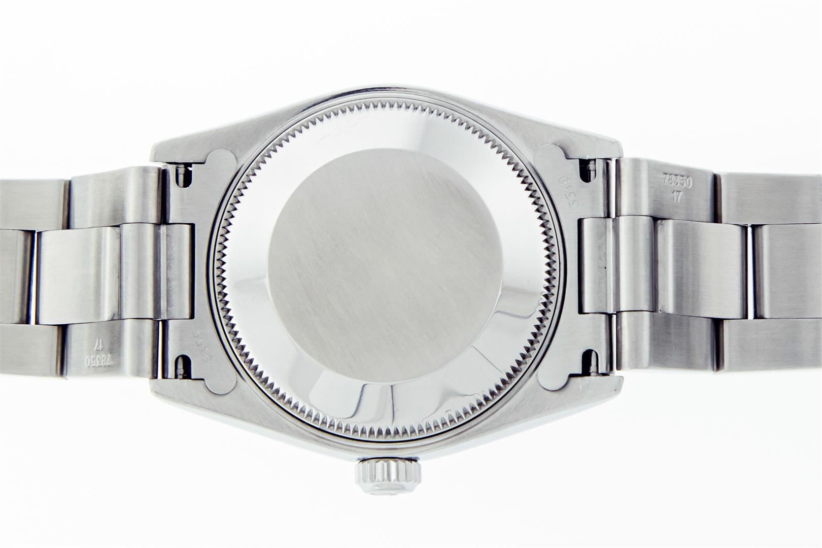 One Women's Midsize Stainless Steel Rolex Datejust Polished, Serviced & Electronically Tested, Rolex Stainless Steel Case : 31mm, Rolex Stainless Steel Crown, Rolex Bezel: 18K White Gold Fluted Bezel, Custom Crystal: New Sapphire With Magnified Date Window. Custom Hands: New Luminescent Hands. Rolex Movement: Automatic Winding Movement Caliber 2235. Custom Dial: Refinished To Blue With Custom Added Diamonds, Date Window: 3 O'clock Position Date Display, Quickset, Model: Midsize Datejust. Condition: G-6 Extra Fine. Rolex Bracelet: Stainless Steel Oyster Band. Bright Polish. 6.0 Inch Length, Adjustable. Standard Clasp, With Rolex Logo. This Pre Owned Watch Has Been Serviced Time Tested And Is In Excellent Condition It Is Free Of All Scratches And Dents.