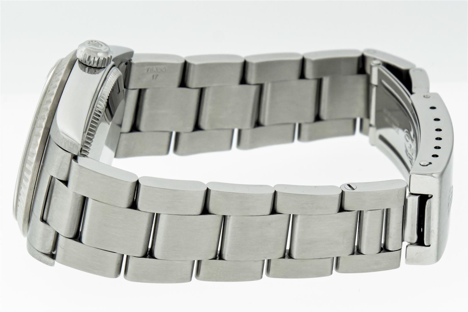 One Women's Midsize Stainless Steel Rolex Datejust Polished, Serviced & Electronically Tested, Rolex Stainless Steel Case : 31mm, Rolex Stainless Steel Crown, Rolex Bezel: 18K White Gold Fluted Bezel, Custom Crystal: New Sapphire With Magnified Date Window. Custom Hands: New Luminescent Hands. Rolex Movement: Automatic Winding Movement Caliber 2235. Custom Dial: Refinished To Blue With Custom Added Diamonds, Date Window: 3 O'clock Position Date Display, Quickset, Model: Midsize Datejust. Condition: G-6 Extra Fine. Rolex Bracelet: Stainless Steel Oyster Band. Bright Polish. 6.0 Inch Length, Adjustable. Standard Clasp, With Rolex Logo. This Pre Owned Watch Has Been Serviced Time Tested And Is In Excellent Condition It Is Free Of All Scratches And Dents.