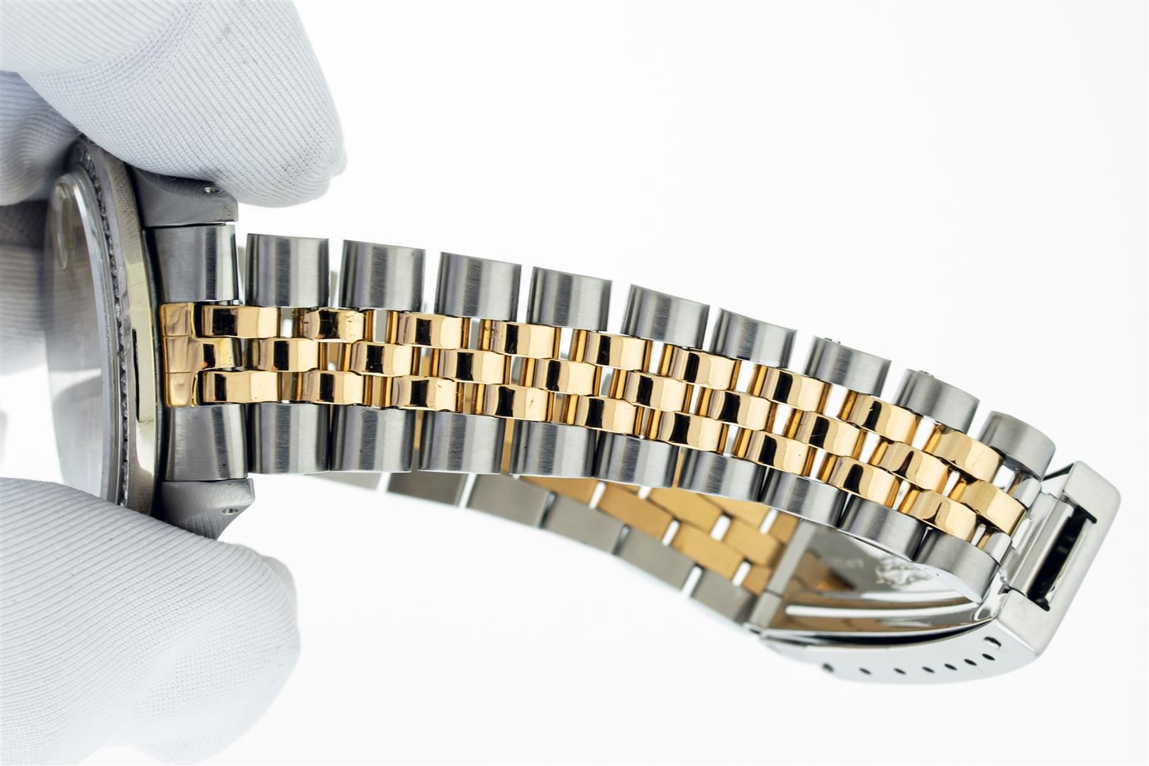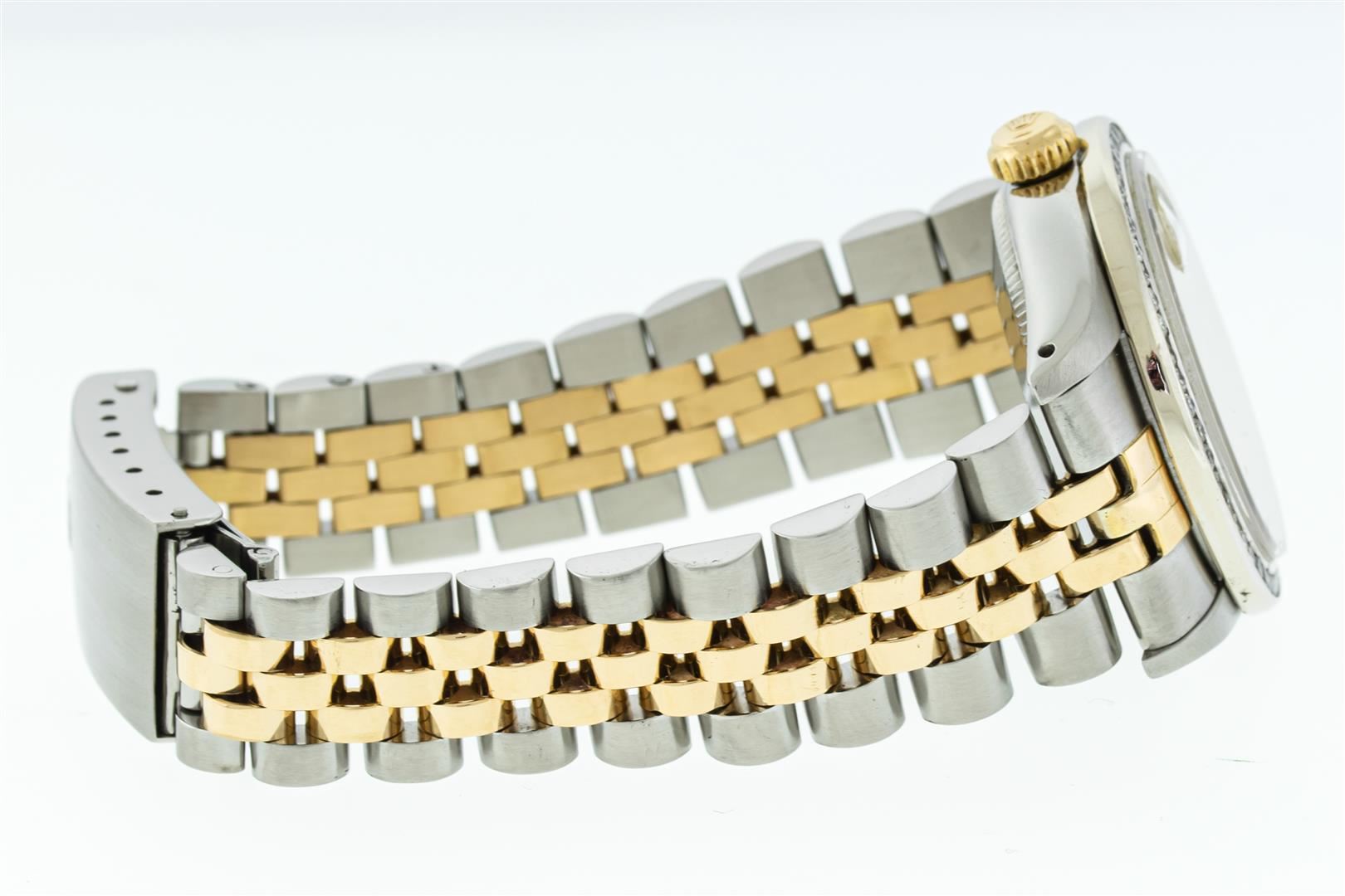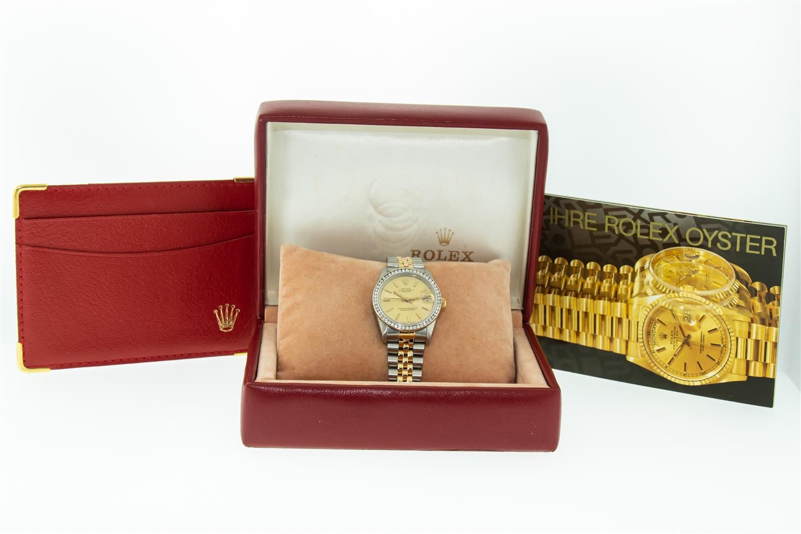 One Women's Midsize Stainless Steel and Yellow Gold Rolex Datejust Polished, Serviced & Electronically Tested, Rolex Stainless Steel case : 31mm, Rolex Stainless Steel Crown, Custom Bezel: White Gold Channel Set Diamond Bezel , Color: G To H, Clarity: VS2-SI1. Custom Crystal: New Scratch Resistant Synthetic Sapphire Cyclops Lens. Rolex Hands: Luminescent Hands. Rolex Movement: Automatic Winding Movement Caliber 2135. Rolex Dial: Champagne Index Dial With Lumi Dots, Date Window: 3 O'Clock Position Date Display, Quickset, Model: Midsize Datejust. Condition: G-6 Extra Fine. Rolex Bracelet: Stainless Steel and Yellow Gold Jubilee Band. Bright Polish. 6.0 Inch Length, Adjustable. Standard Clasp, With Rolex Logo. This Pre Owned Watch Has Been Serviced Time Tested And Is In Excellent Condition It Is Free Of All Scratches And Dents. This Is The Larger Version Of The Ladies Watch.