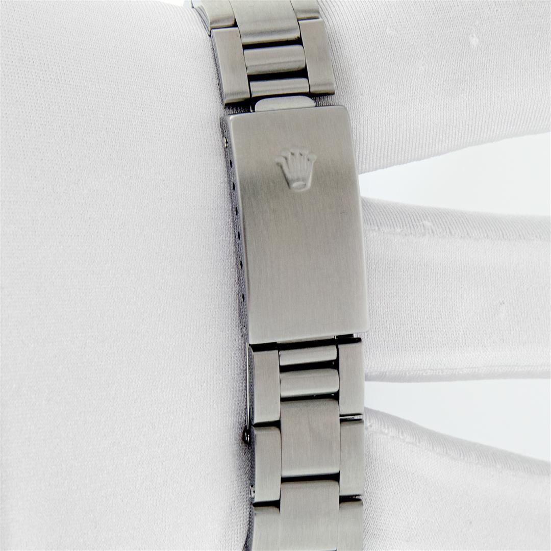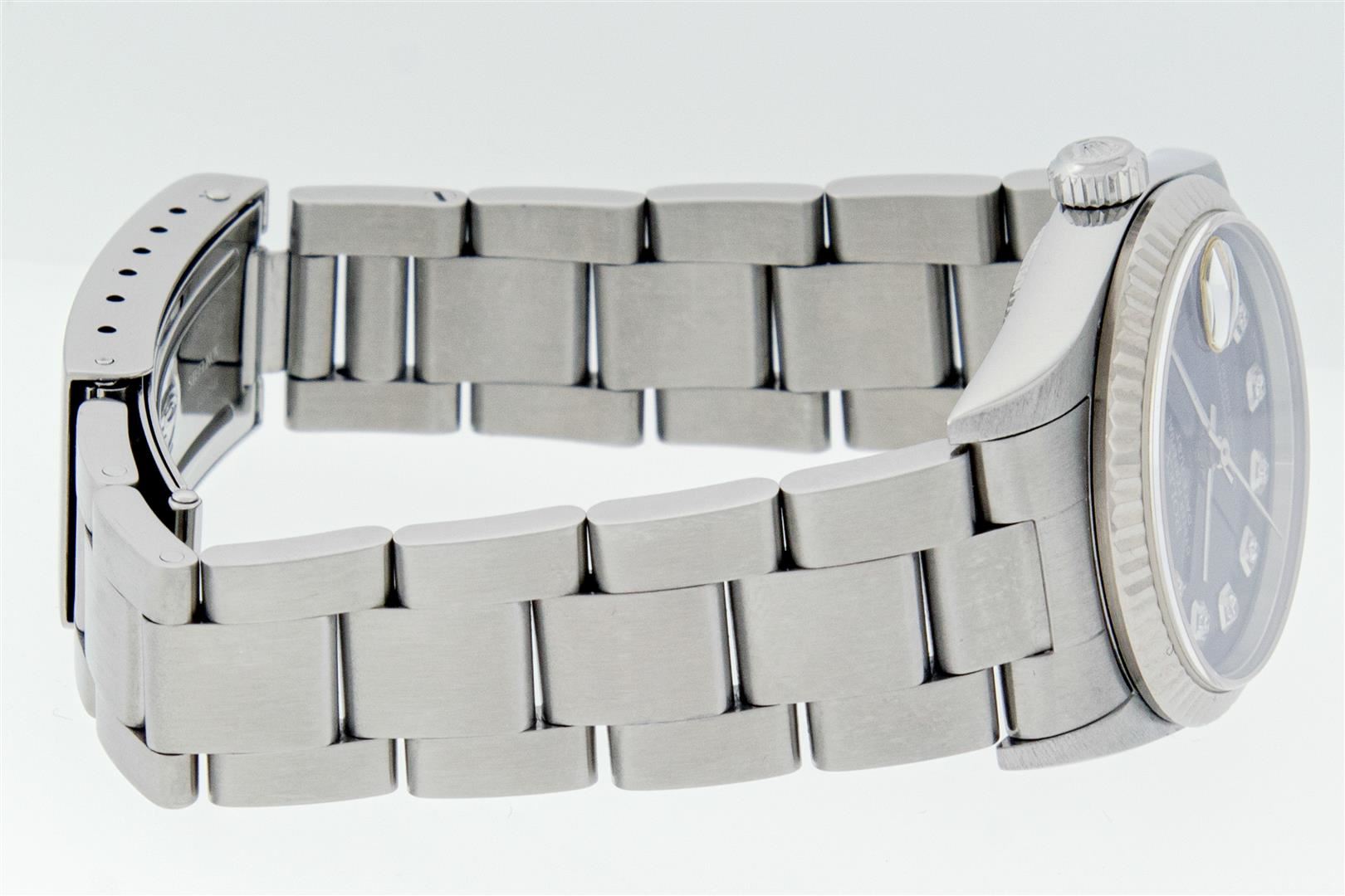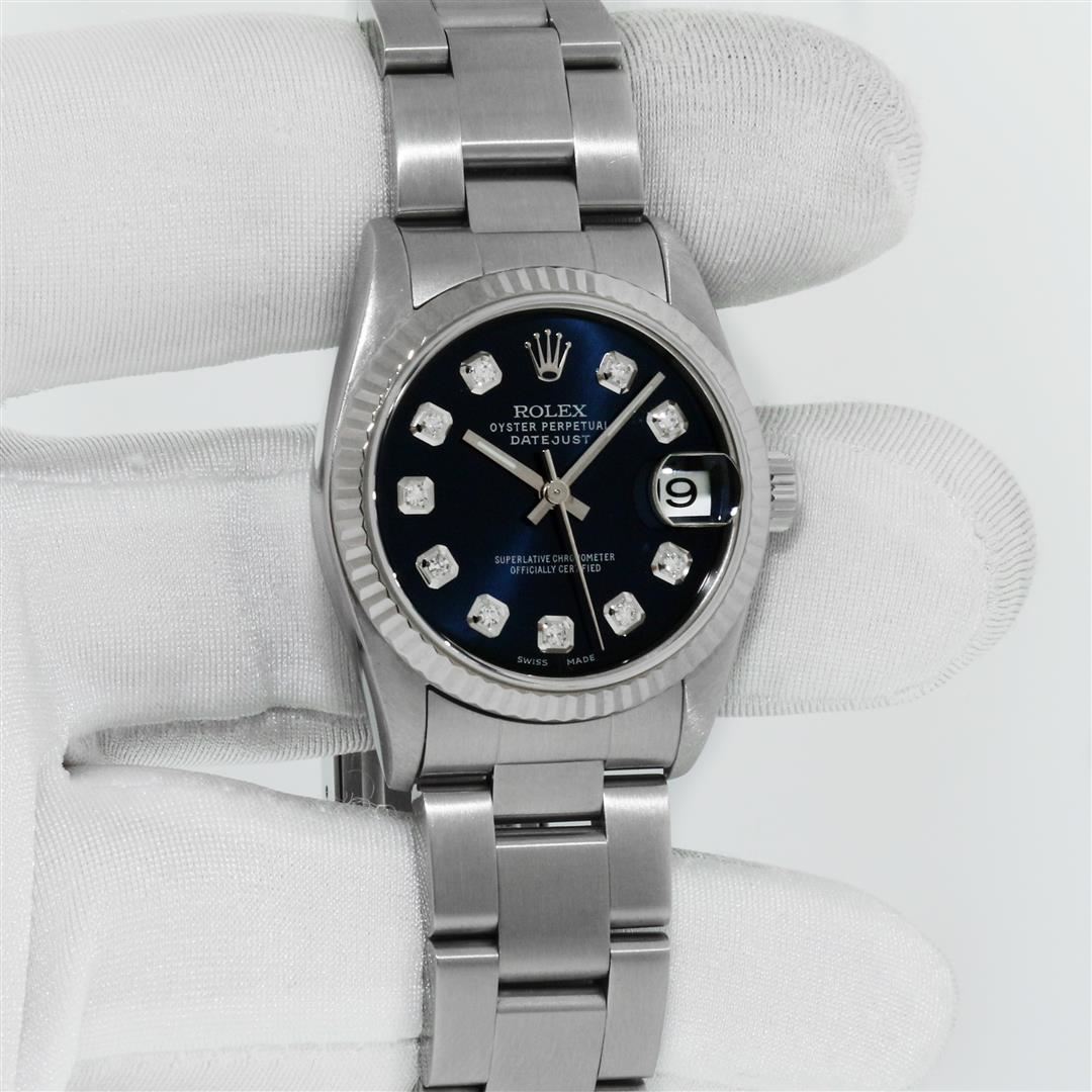 One Women's Midsize Stainless Steel Rolex Datejust Polished, Serviced & Electronically Tested, Rolex Stainless Steel Case : 31mm, Rolex Stainless Steel Crown, Rolex Bezel: 18K White Gold Fluted Bezel, Custom Crystal: New Sapphire With Magnified Date Window. Custom Hands: New Luminescent Hands. Rolex Movement: Automatic Winding Movement Caliber 2235. Custom Dial: Refinished To Blue With Custom Added Genuine Diamonds, Diamond Count: 10 Single Cut Diamonds On Dial, Date Window: 3 O'clock Position Date Display, Quickset, Model: Quickset Midsize Datejust. Condition: G-6 Extra Fine. Rolex Bracelet: Stainless Steel Oyster Band. Bright Polish. 6.0 Inch Length, Adjustable. Standard Clasp, With Rolex Logo. This Pre Owned Watch Has Been Serviced Time Tested And Is In Excellent Condition It Is Free Of All Scratches And Dents.