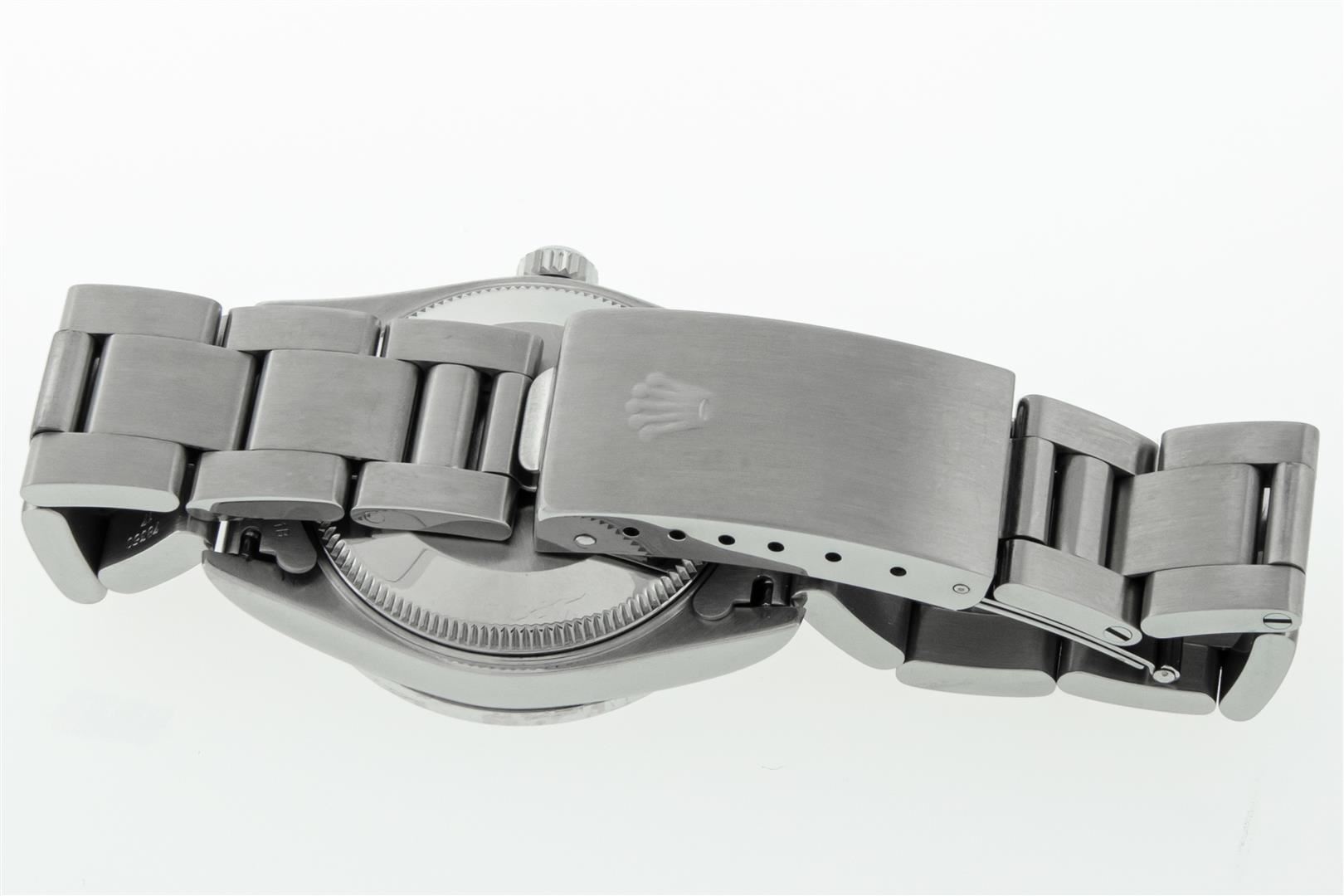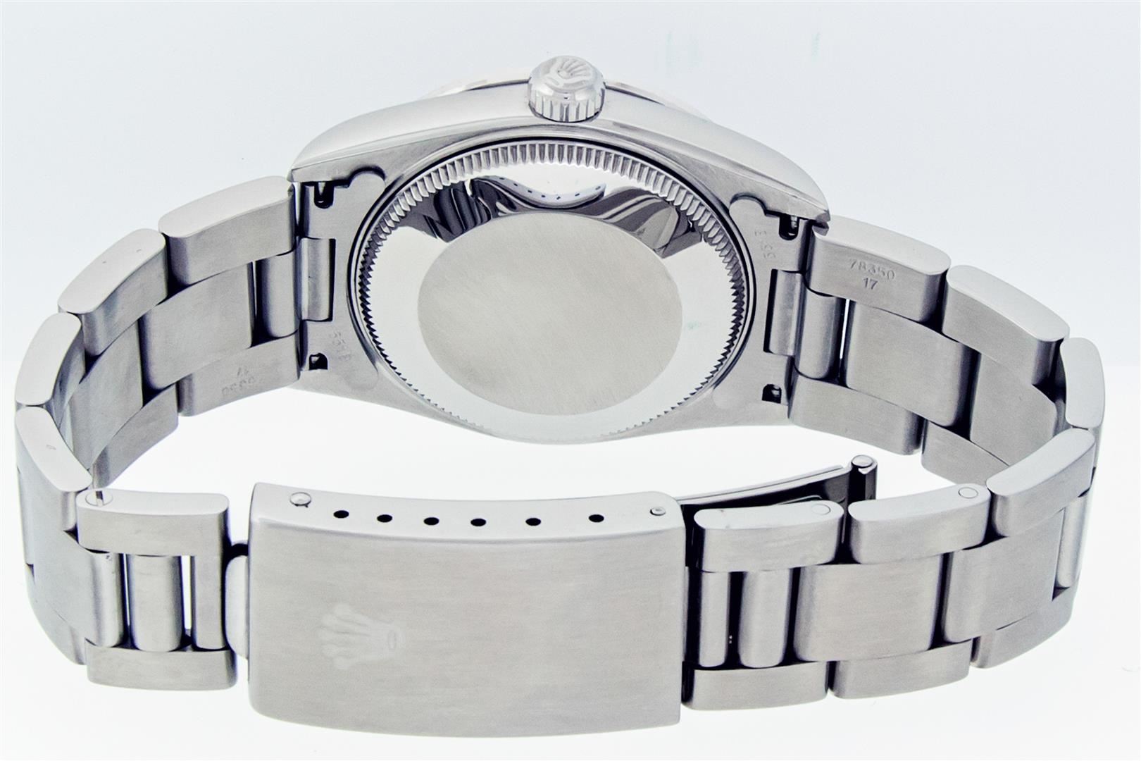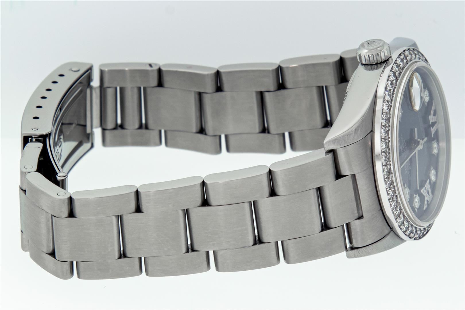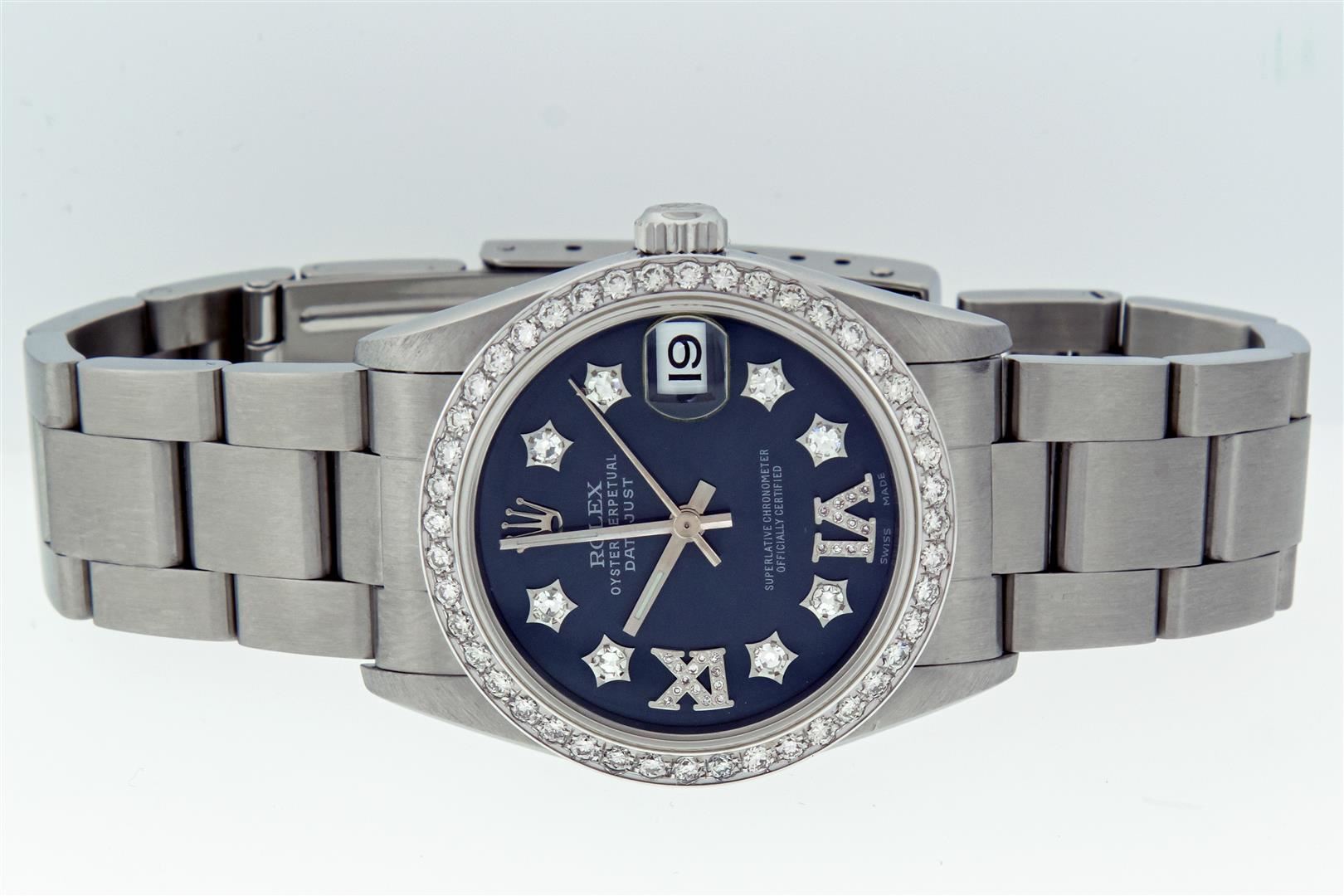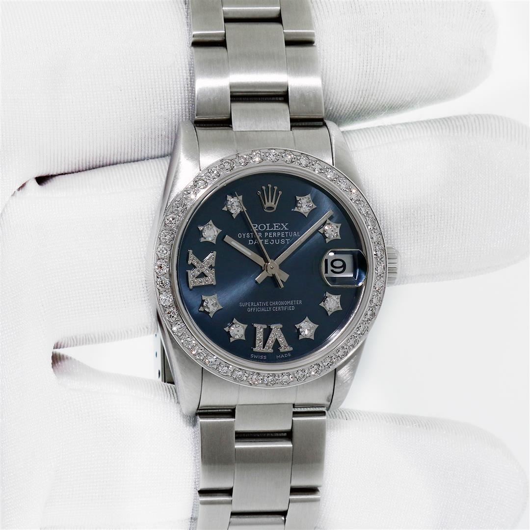 One Women's Midsize Stainless Steel Rolex Datejust Polished, Serviced & Electronically Tested, Rolex Stainless Steel Case : 31mm, Rolex Stainless Steel Crown, Custom Diamond Bezel: New 18K White Gold Beadset Diamond Bezel, Diamond Count: 45 Diamonds On Bezel, Color: G To H, Clarity: SI-VS, Custom Crystal: New Sapphire With Magnified Date Window. Custom Hands: New Luminescent Hands. Rolex Movement: Automatic Winding Movement Caliber 2235. Custom Dial: Blue Star Diamond and Roman Diamond Dial, Diamond Count: 8 Single Cut Star Diamonds + 2 Diamond Roman Hour Markers, Date Window: 3 O'clock Position Date Display, Quickset, Model: Midsize Datejust. Condition: G-6 Extra Fine. Rolex Bracelet: Stainless Steel Oyster Band. Bright Polish. 6.0 Inch Length, Adjustable. Standard Clasp, With Rolex Logo. This Pre Owned Watch Has Been Serviced Time Tested And Is In Excellent Condition It Is Free Of All Scratches And Dents.