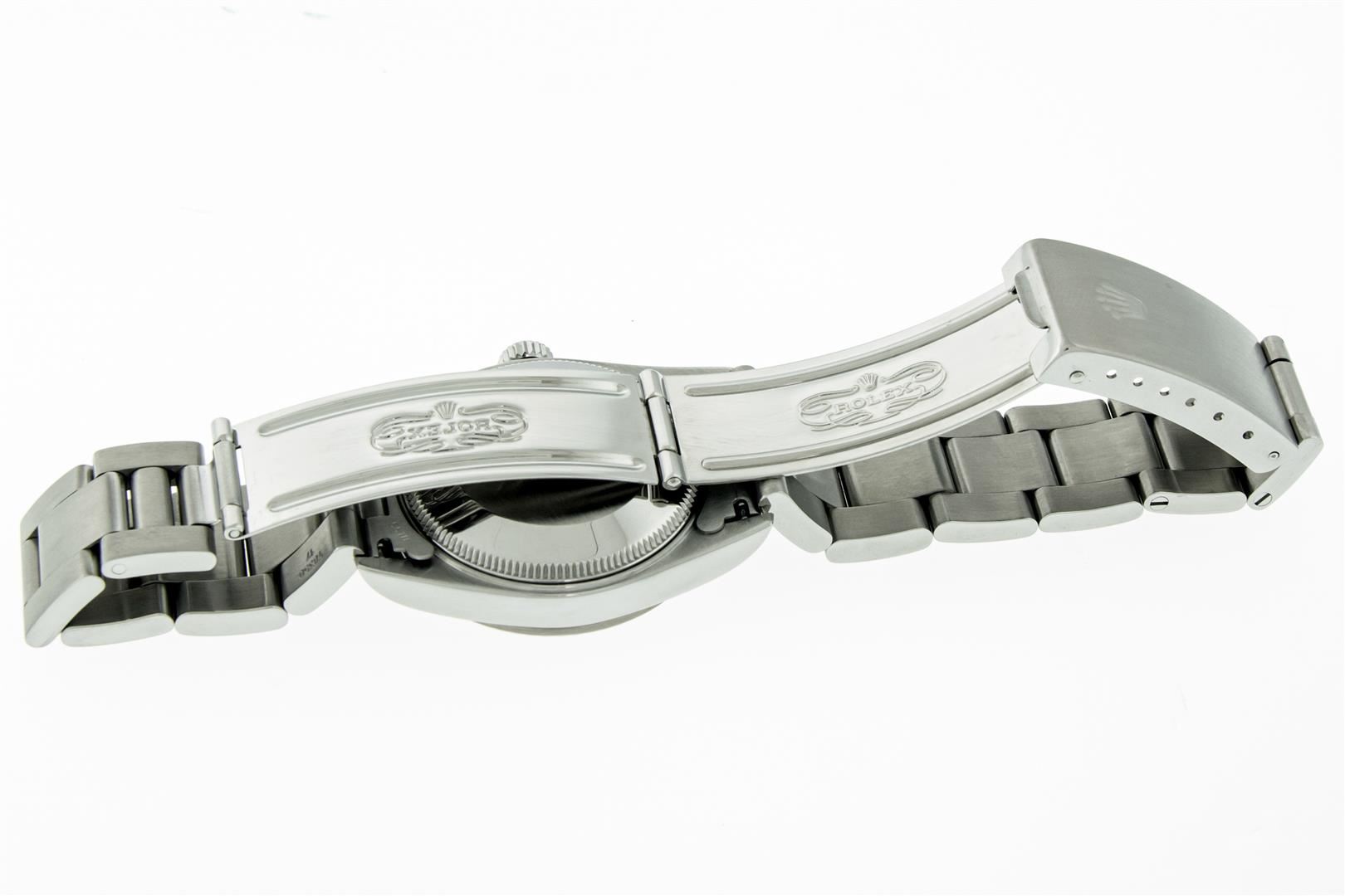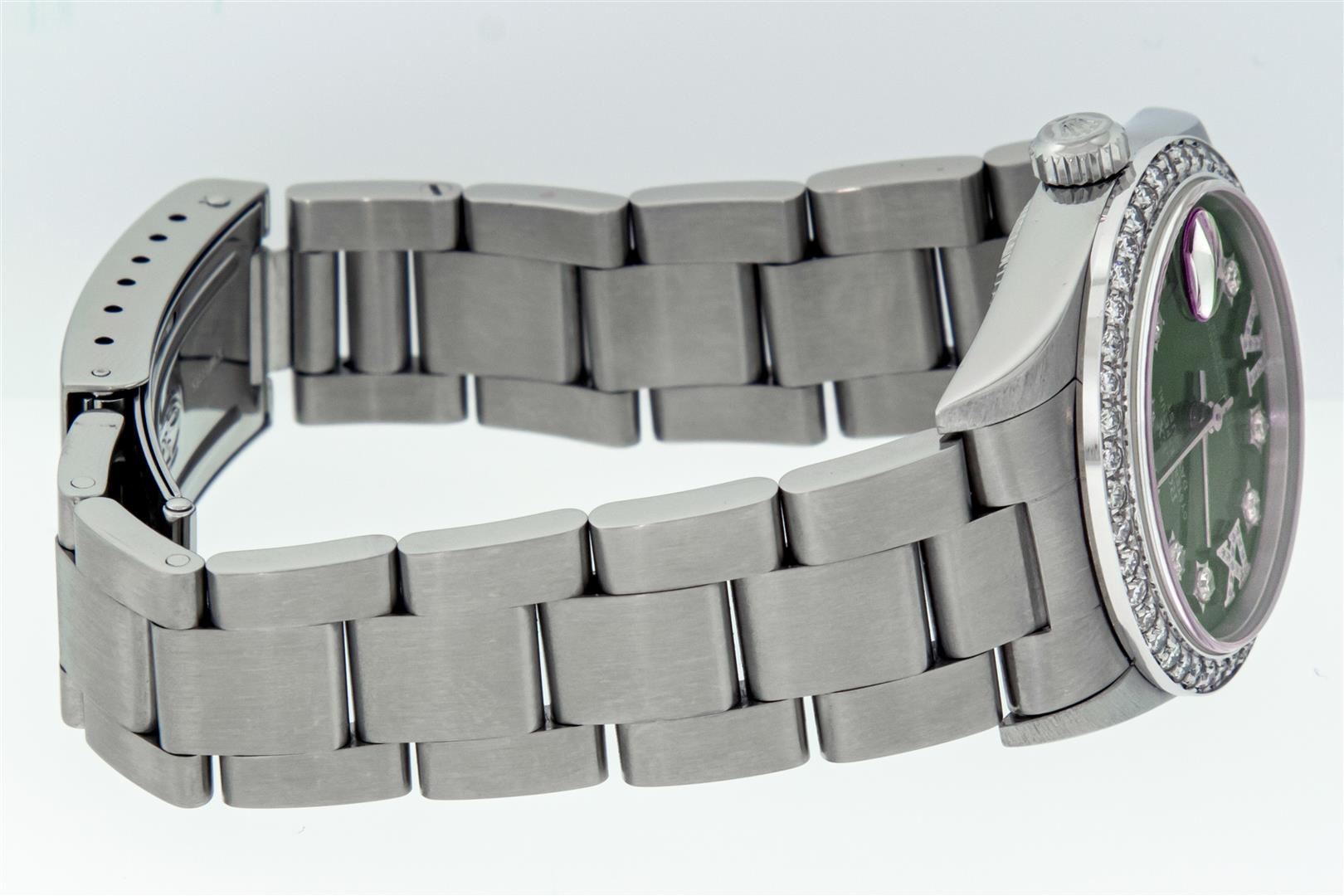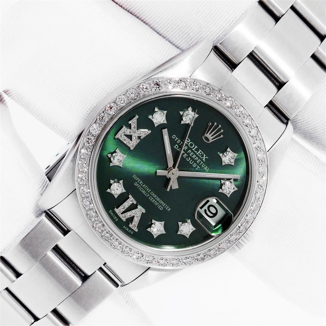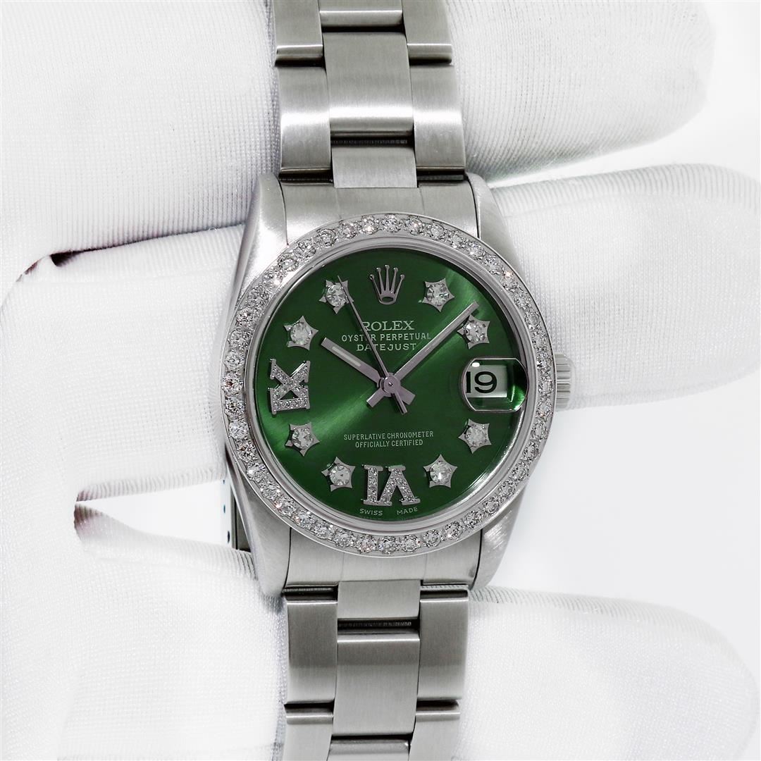 One Women's Midsize Stainless Steel Rolex Datejust Polished, Serviced & Electronically Tested, Rolex Stainless Steel case: 31mm, Rolex Stainless Steel Crown, Custom Diamond Bezel: New 18K White Gold Beadset Diamond Bezel, Diamond Count: 45 Diamonds On Bezel, Color: G To H, Clarity: SI-VS, Custom Crystal: New Sapphire with Magnified Date Window. Custom Hands: New Luminescent Hands. Rolex Movement: Automatic Winding Movement Caliber 2235. Custom Dial: Green Star Diamond and Roman Diamond Dial, Diamond Count: 8 Single Cut Star Diamonds + 2 Diamond Roman Hour Markers, Date Window: 3 O'Clock Position Date Display, Quickset, Model: Midsize Datejust. Condition: G-6 Extra Fine. Rolex Bracelet: Stainless Steel Oyster Band. Bright Polish. 6.0 Inch Length, Adjustable. Standard Clasp, with Rolex Logo. This Pre Owned Watch Has Been Serviced Time Tested And Is In Excellent Condition It Is Free Of All Scratches And Dents.