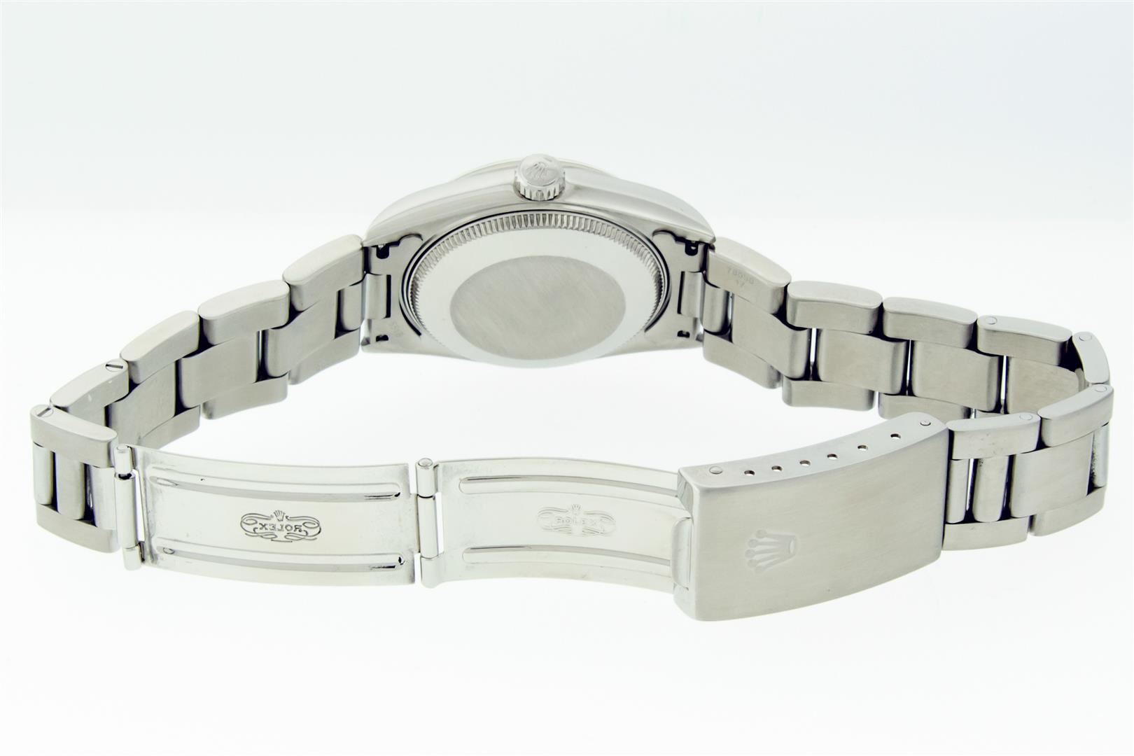 One Women's Pre Owned Midsize Stainless Steel Rolex Datejust Polished, Serviced & Electronically Tested, Rolex Stainless Steel case : 31mm, Rolex Stainless Steel Crown, Rolex Bezel: 18K White Gold Fluted Bezel, Crystal: Sapphire With Cyclops Lens. Hands: Lumi Hands. Rolex Movement: Automatic Winding Movement. Rolex Dial: Factory Salmon Arabic Dial With Index Hour Markers. Date Window: 3 O'Clock Position Date Display, Quickset, Model: Midsize Datejust. Condition: G-6 Extra Fine. Rolex Bracelet: Stainless Steel Oyster Band. Bright Polish. 6.0 Inch Length, Adjustable. Standard Clasp, With Rolex Logo. This Watch Has Been Serviced Time Tested And Is In Excellent Condition It Is Free Of All Scratches And Dents.