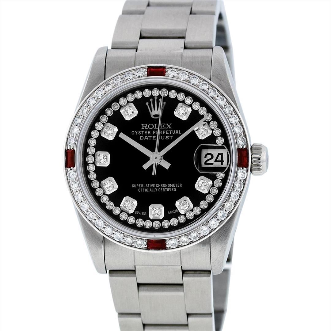 One Midsize Stainless Steel Rolex Datejust Polished, Serviced & Electronically Tested, Stainless Steel Case Case:31mm, Stainless Steel Crown, Custom Bezel: 18K White Gold Ruby Beadset Bezel, Diamond Count: 40 Diamonds + 4 Ruby, Total Weight: 1 Carat, Color: G To H, Clarity: VS2-SI1. Custom Crystal: Synthetic Sapphire Cyclops Lens. Movement: Automatic Winding Movement Caliber 2235. Custom Dial: Black String Diamond Dial VVS. Color: G to H, Clarity: VVS, Date Window: 3 O'Clock Position Date Display, Quickset, Model: Midsize Datejust. Condition: G-6 Extra Fine The Watch Is In Very Good Condition Free Of All Scratches And Dents. Bracelet: Stainless Steel Oyster Band. Bright Polish. 6.0 Inch Length, Adjustable. Standard Clasp, With Rolex Logo.